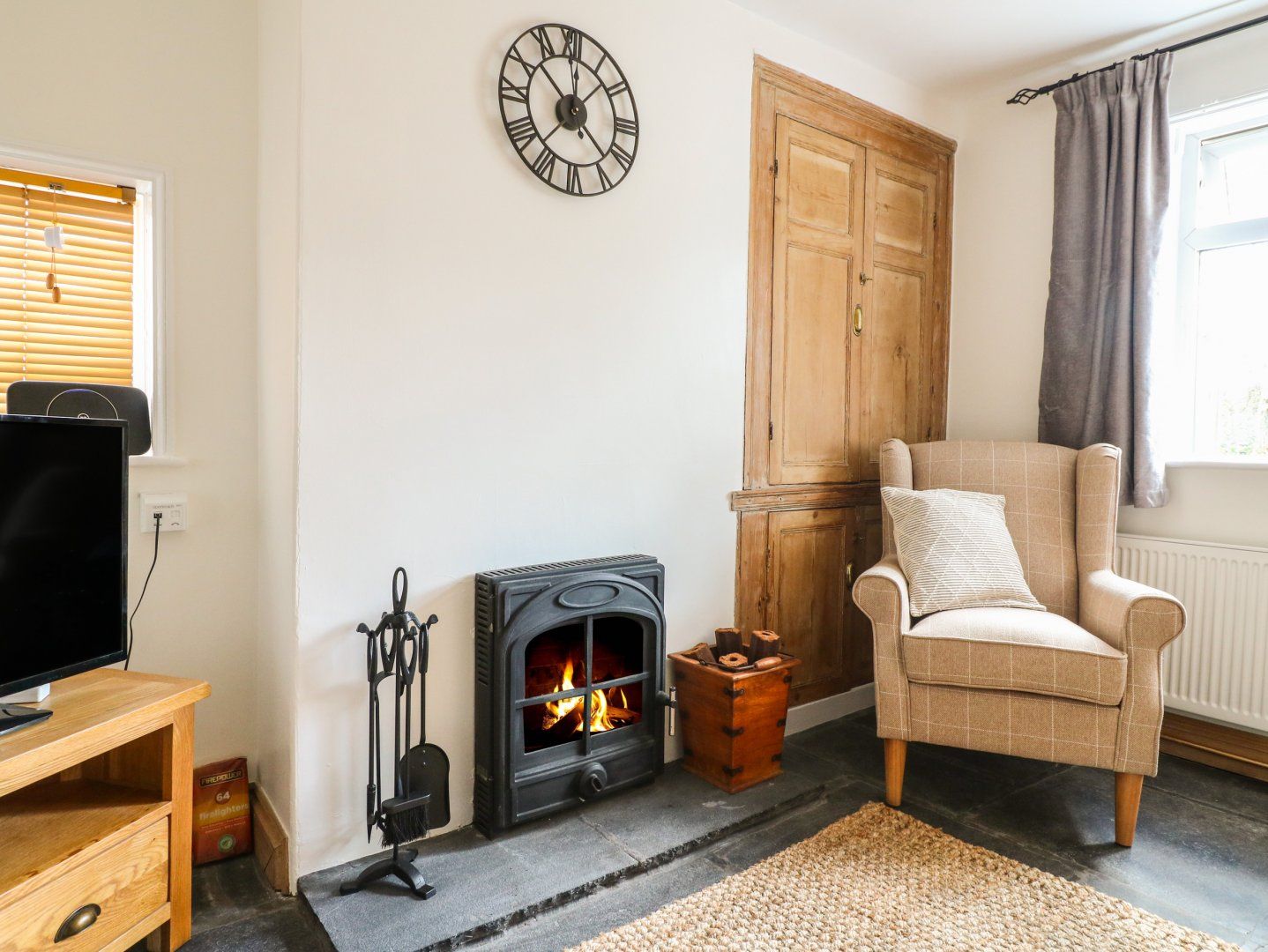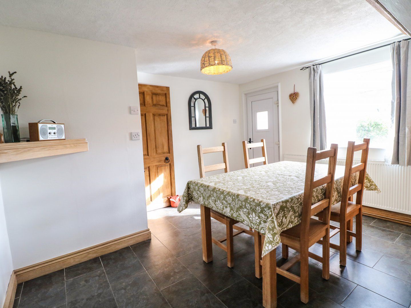 Accomodation Details Two bedrooms: 1 x king-size, 1 x twin. Bathroom with bath, shower over, basin, WC and heated towel rail. Kitchen with an electric oven and hob, microwave, fridge, dishwasher. Dining room with a solid fuel cooker. Sitting room with a solid fuel fire. Front porch. Pantry for storage