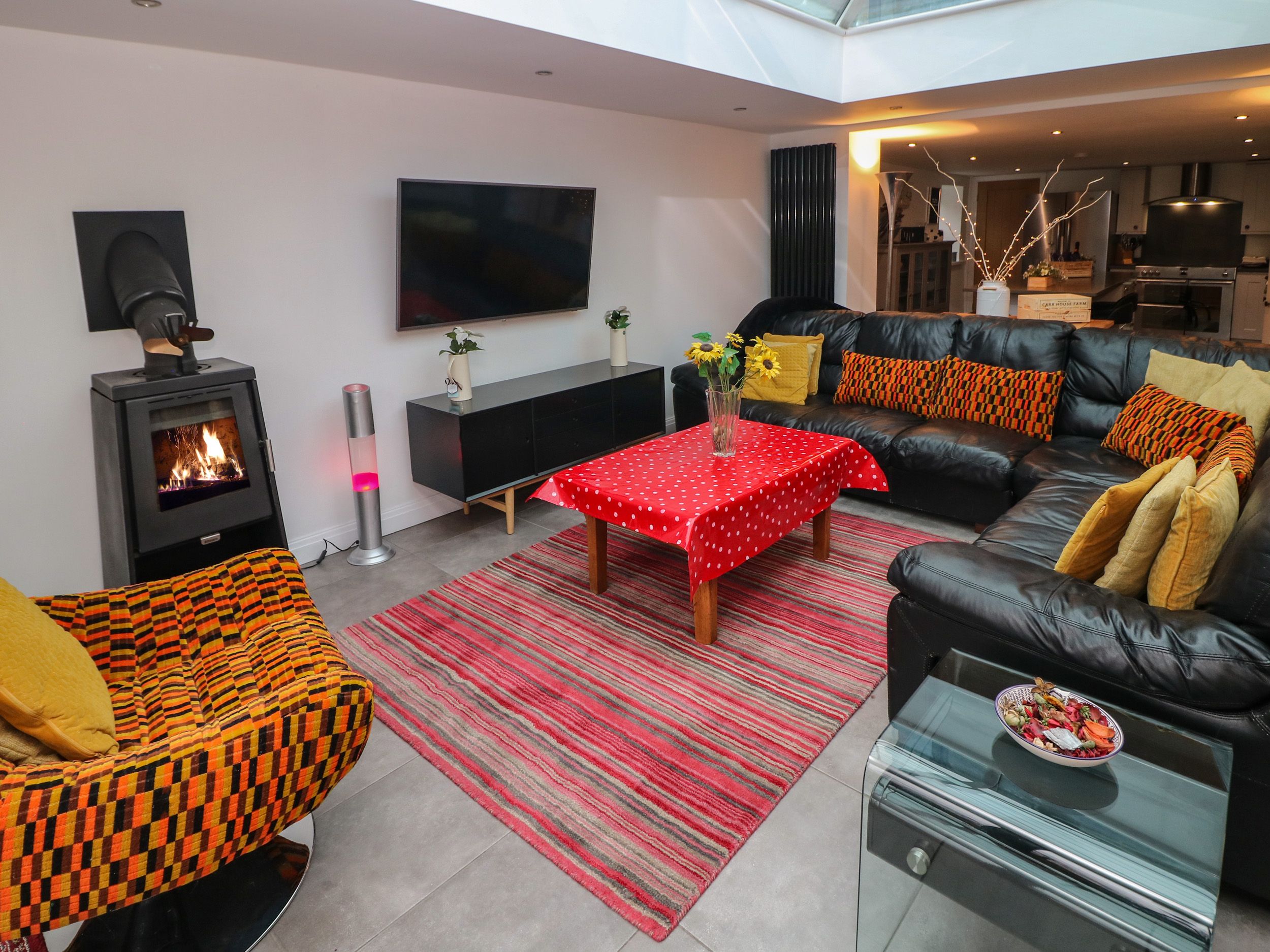 Accomodation Details Five bedrooms: 1 x king-size with TV and en-suite shower, basin and WC, 2 x king-size and 2 x twin. Ground-floor shower room with shower, basin and WC. Bathroom with bath, handheld shower, basin and WC. Shower room with shower, basin and WC. Open-plan living space with kitchen, dining area and sitting area with woodburning stove. Living/dining room with woodburning stove. Utility. Snug, Self contained lounge room with double sofa bed -Suitable for adults. This property can be booked with Property ID: 981709 (2 Carr Farm Close), to total a party of 20 people.