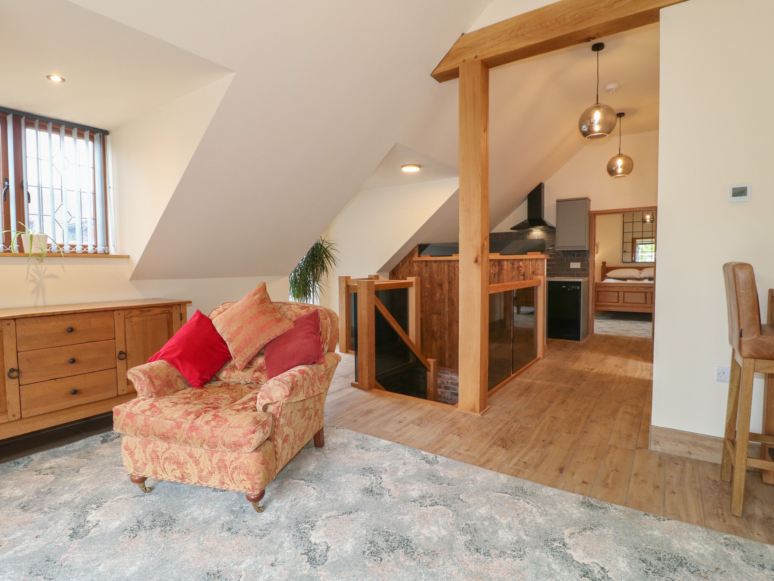 Accomodation Details One king-size bedroom with Smart TV. Bathroom with bath, walk-in shower, basin, and WC. Open-plan living space with kitchen, dining area and sitting area