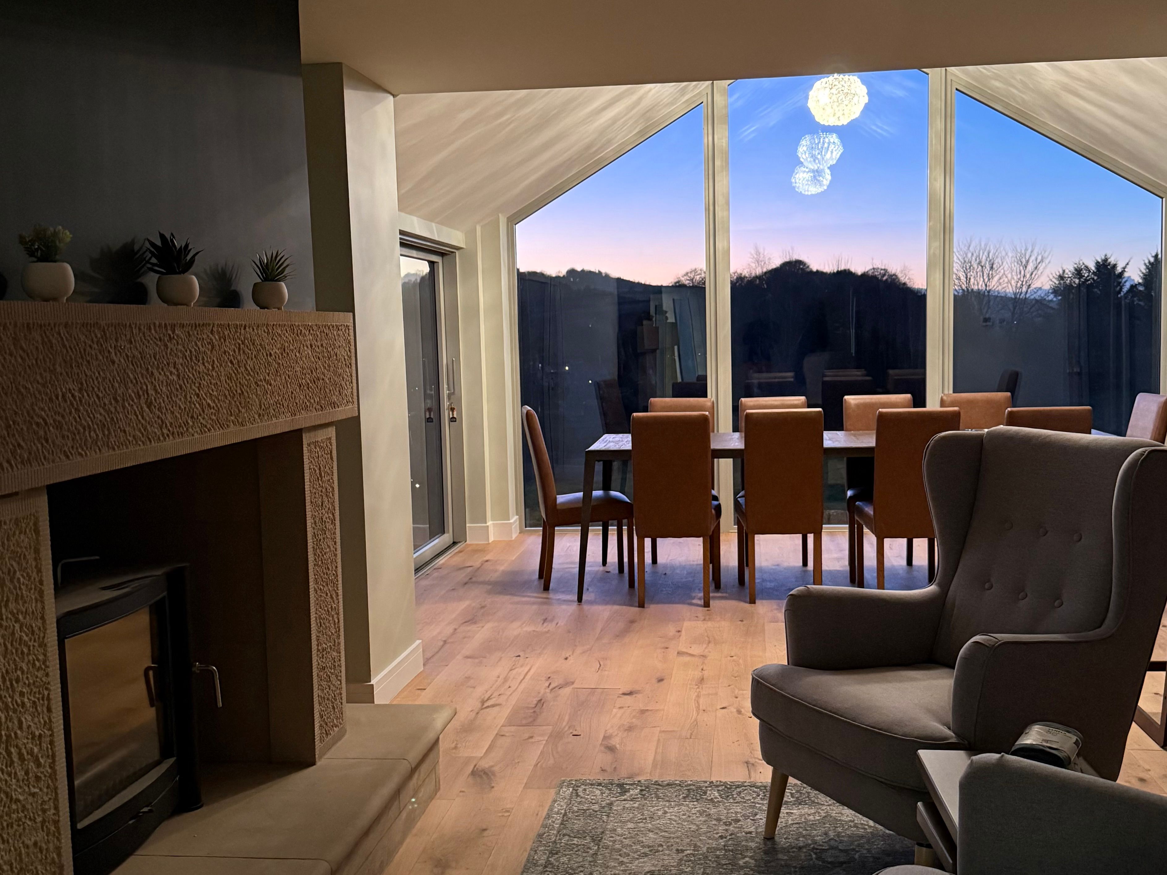 Amenities Gas central heating with underflooring heating. Oven, hob, microwave, fridge, fridge/freezer, washing machine, tumble dryer, dishwasher. Smart TV, WiFi. Fuel, power, and starter pack for woodburning stove inc. in rent. Bed linen and towels inc. in rent. Highchair and travel cot available on request. Private driveway for 6 cars. Garden with lawn, patio, furniture enclosed pond and hot tub. Three well-behaved pets welcome. Sorry, no smoking. Shop 1.5 miles, pub 0.2 miles. Note: There is a pond in the garden, however please still supervise children