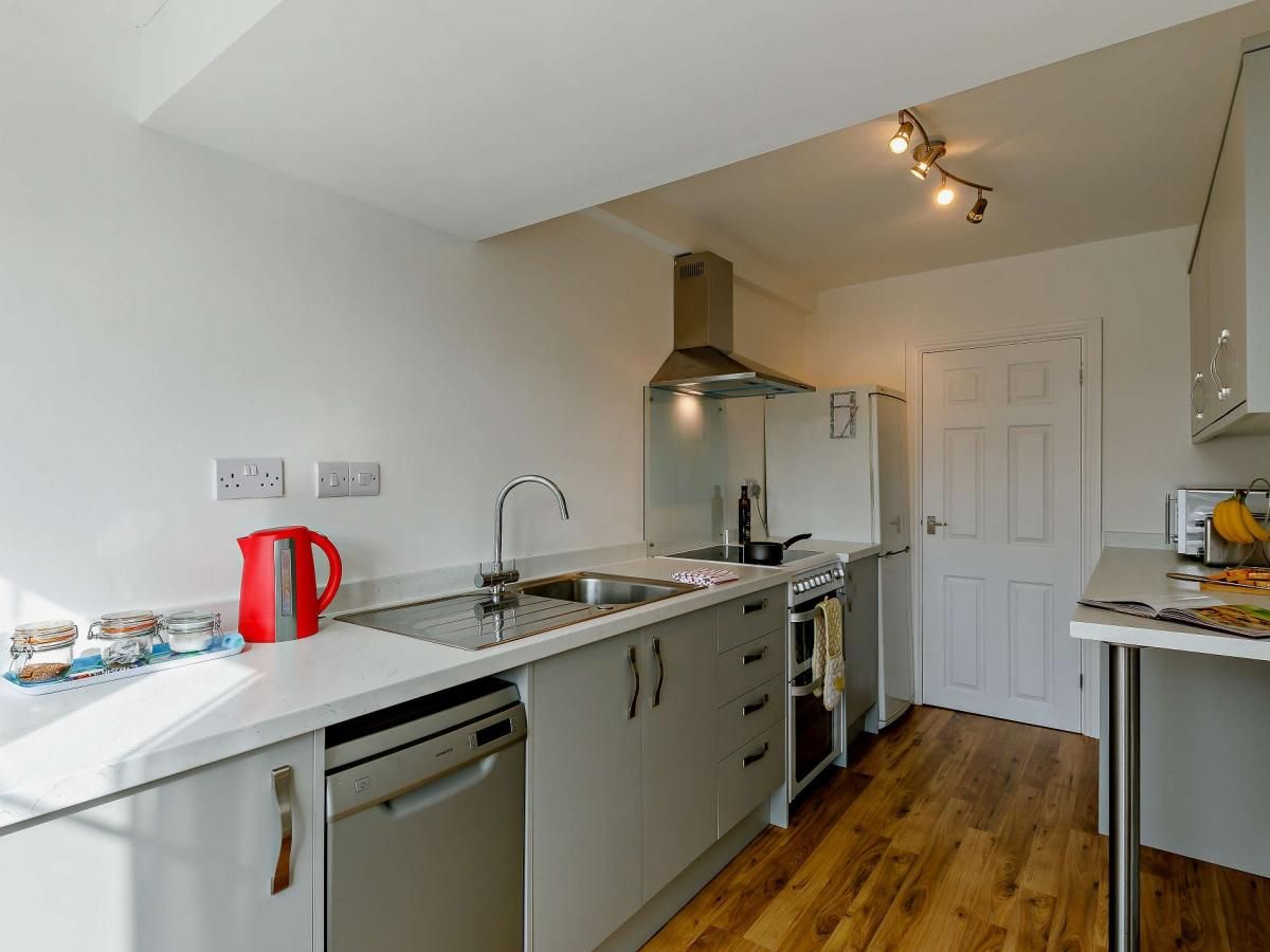 Stepping inside, you'll find a bright and airy kitchen with space to store coats and shoes, as well as everything you need to prepare delicious meals. The kitchen leads to an inviting lounge/diner with exposed beams, supple leather seating around the smart TV, and a warming electric wood burner.