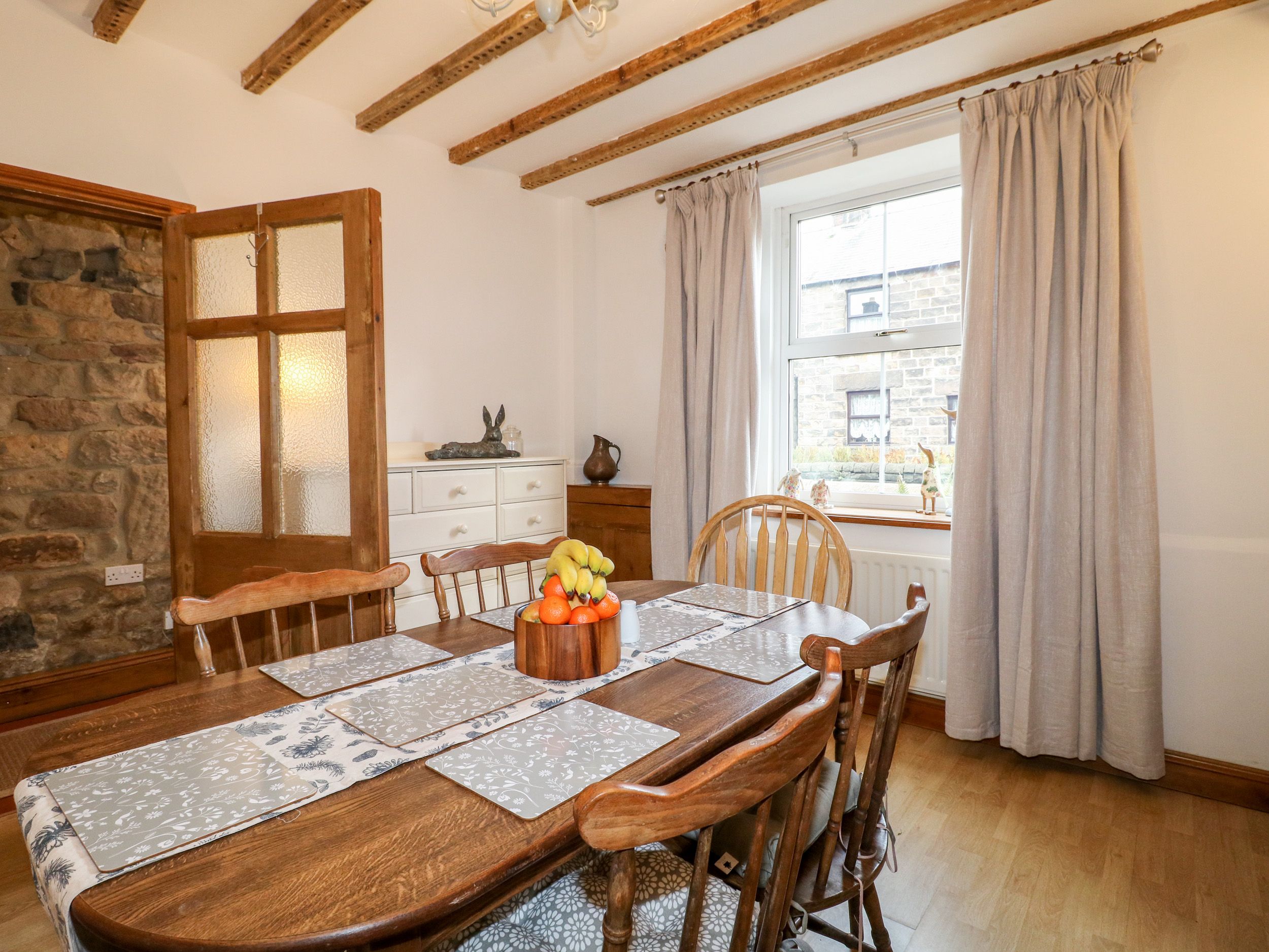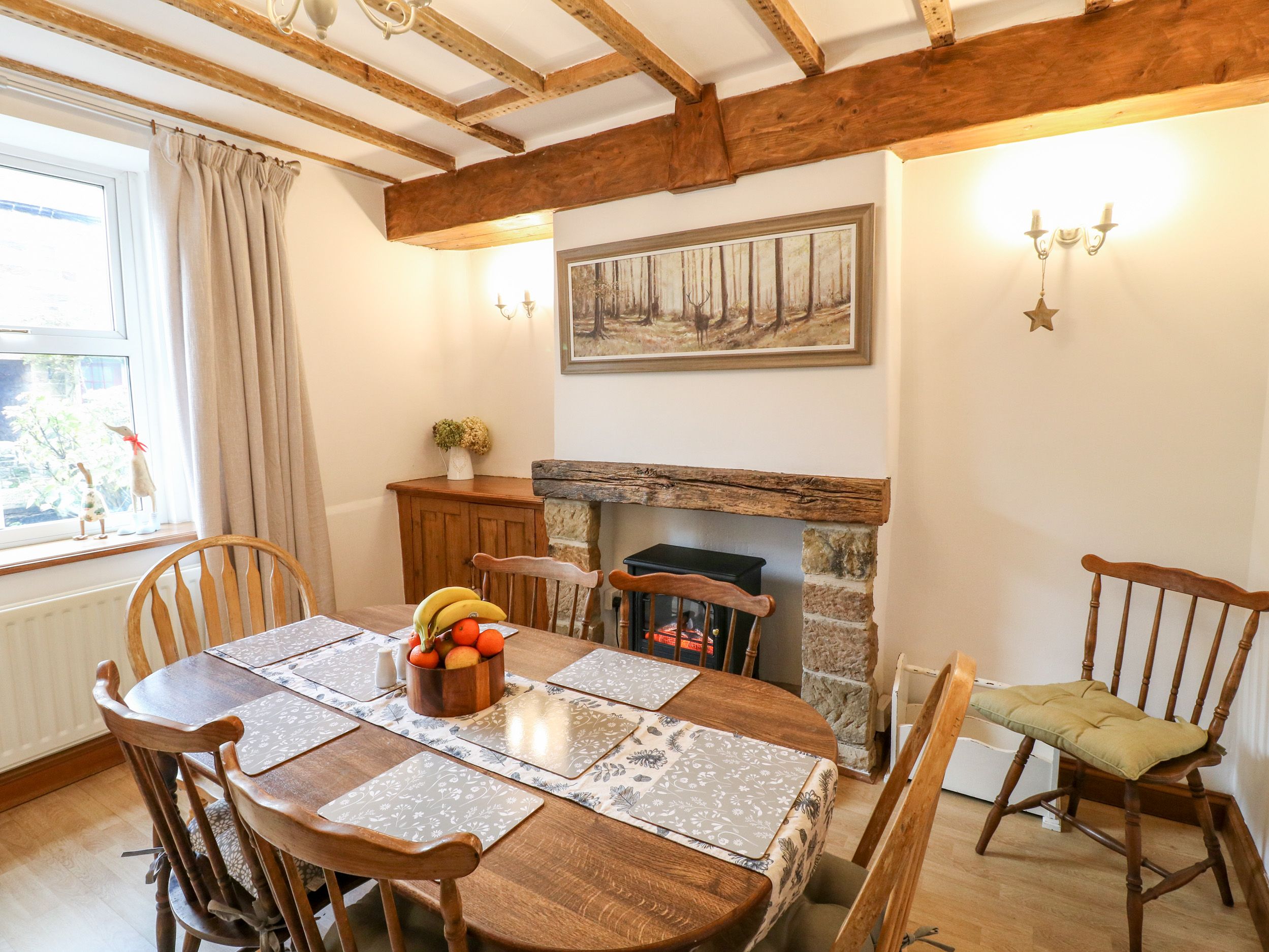 Holiday home Hallbrook Cottage is a charming and traditional terrace cottage that rests within the village of Darley Bridge near Darley Dale, on the outskirts of the Peak District National Park. Hosting two double bedrooms that are served by a shower room, this property can sleep up to four guests. The interior of the cottage is complete with a kitchen, dining room with an electric woodburning effect stove, and a sitting room with a gas woodburning effect stove. Outside, an enclosed garden with a patio featuring an outdoor seating area and a lawn can be found to the rear of the property, whilst roadside parking is located at the front. Hallbrook Cottage is a wonderful dwelling from which to base your next group getaway to the Peak District. Three pets welcome charged at £15 per pet.