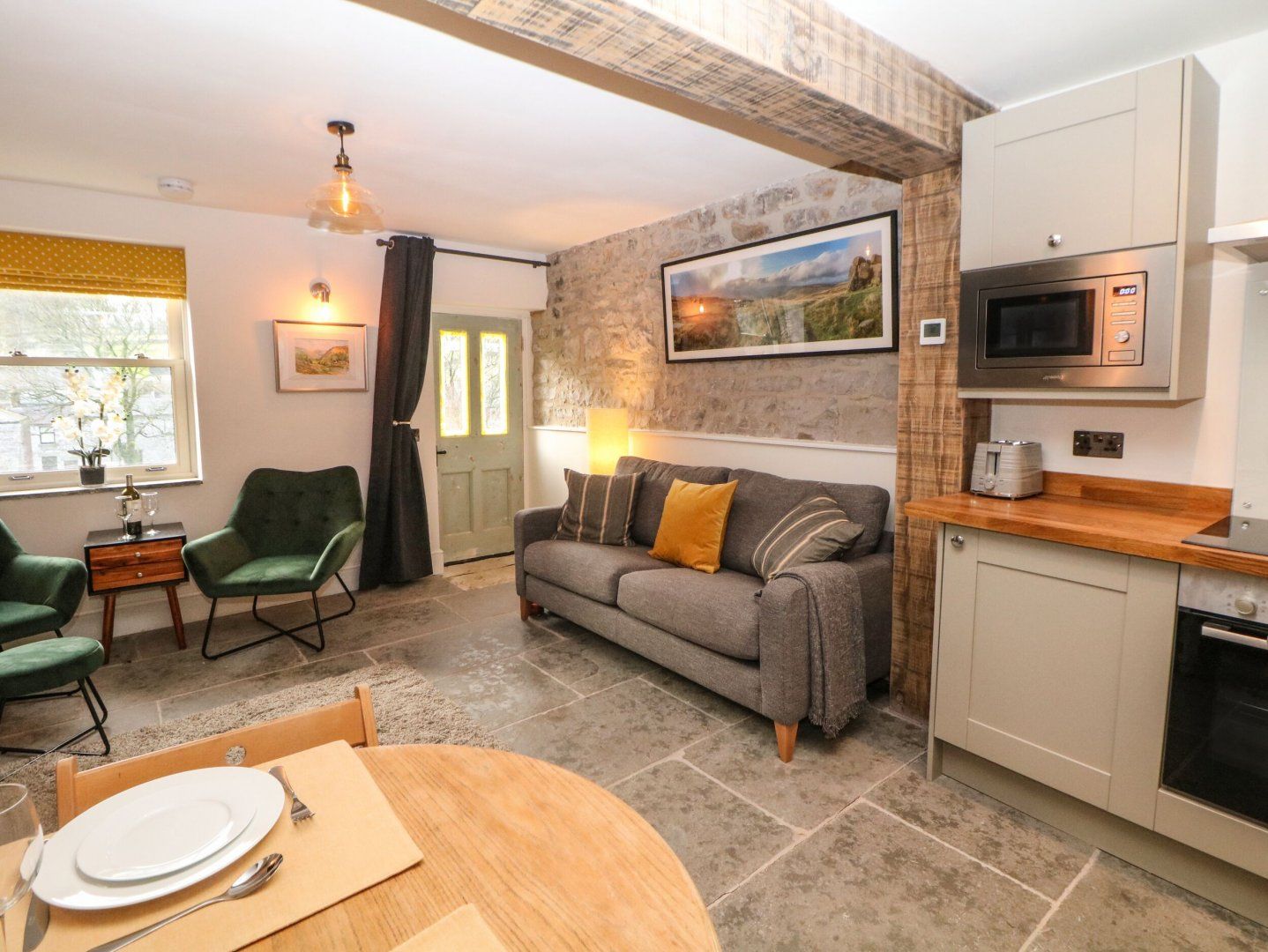 Amenities Gas central heating and underfloor heating downstairs. Electric oven and hob, microwave, fridge with ice box, washing machine, dishwasher. Smart TV, WiFi. Fuel and power inc. in rent. Bed linen and towels inc. in rent. Travel cot, highchair and stairgate available on request. Roadside parking available on a first-come, first-serve basis. Raised front patio with furniture and enclosed rear courtyard with bike storage, furniture and barbecue. Two well-behaved pets welcome. Sorry, no smoking. Shop 0.2 miles, pub 0.1 mile. Note: There are stone steps leading up to the front of the property, please take care. Note: Check-in from 4pm, check-out by 10am. Note: EV charging is prohibited at this property, the nearest charging point can be found at Millers Dale car park. Please note: The top bunk bed is suitable for children over to the age of 6 only, due to the weight limit.