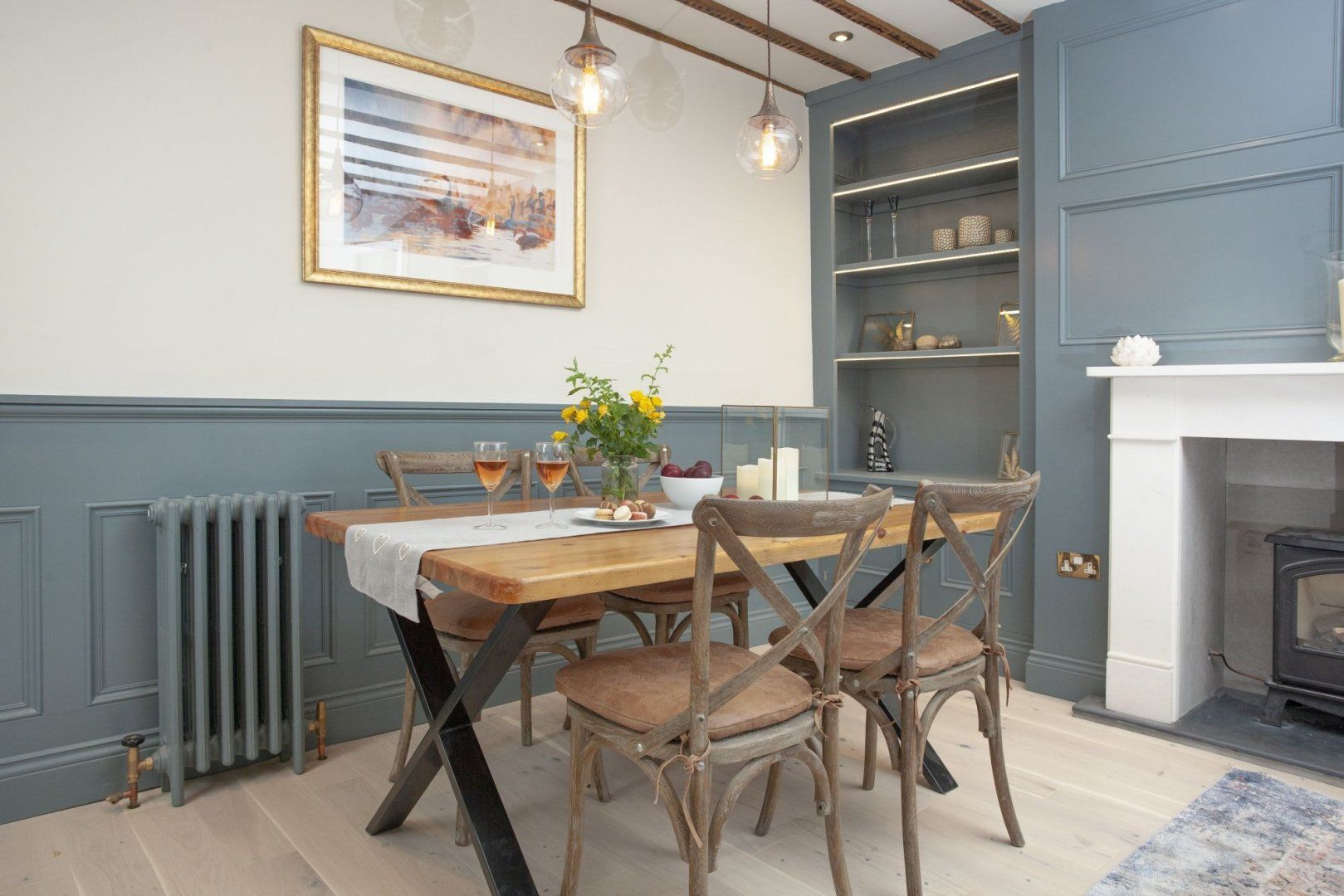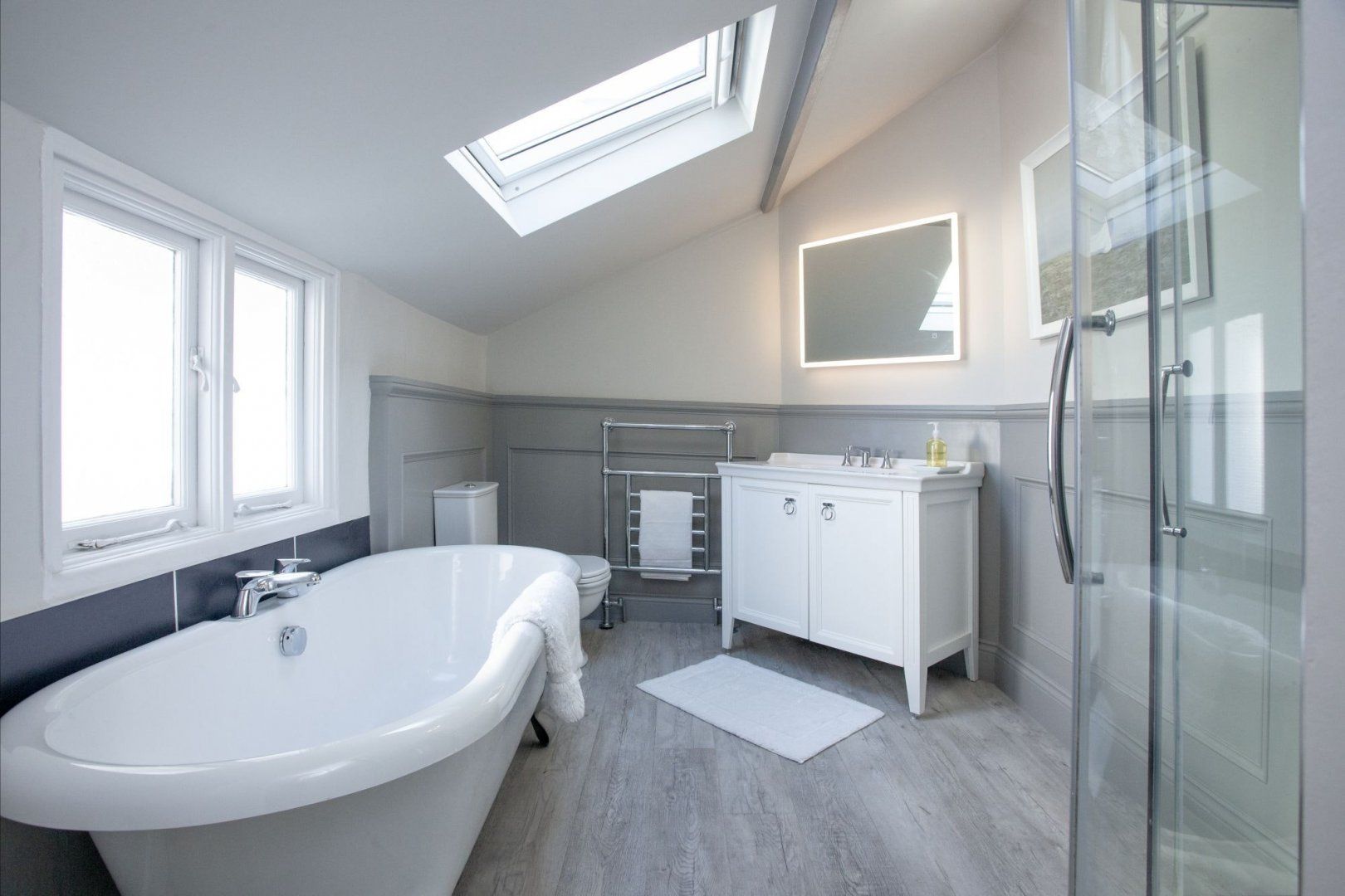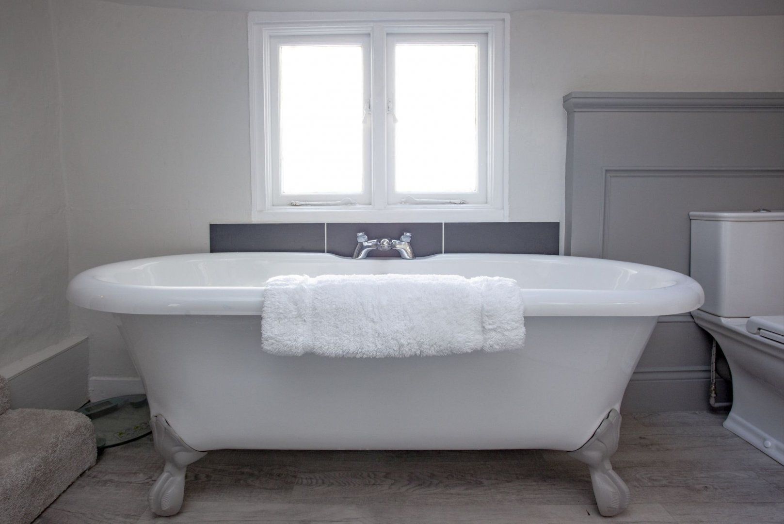 Let's start up top, where the converted attic is home to the main bedroom. Striking wooden beams adorn the ceiling, giving a rustic vibe to an otherwise modern and understated decor. Two more stylish bedrooms and a lavish family bathroom – complete with an absolutely lush claw foot, roll top bath – make up the first floor.