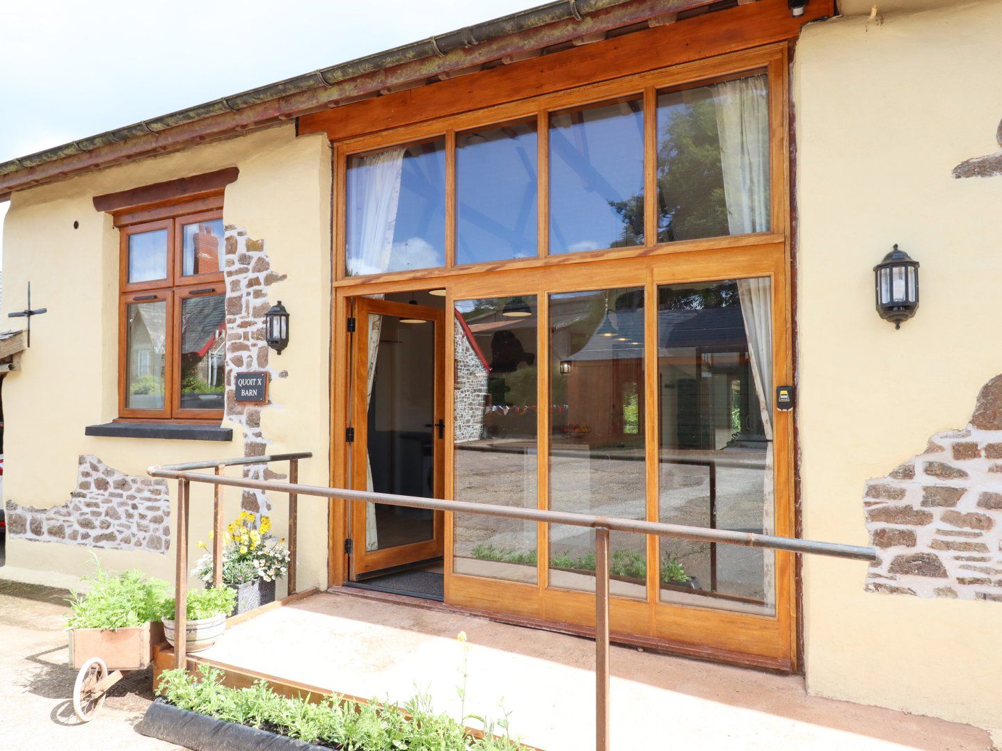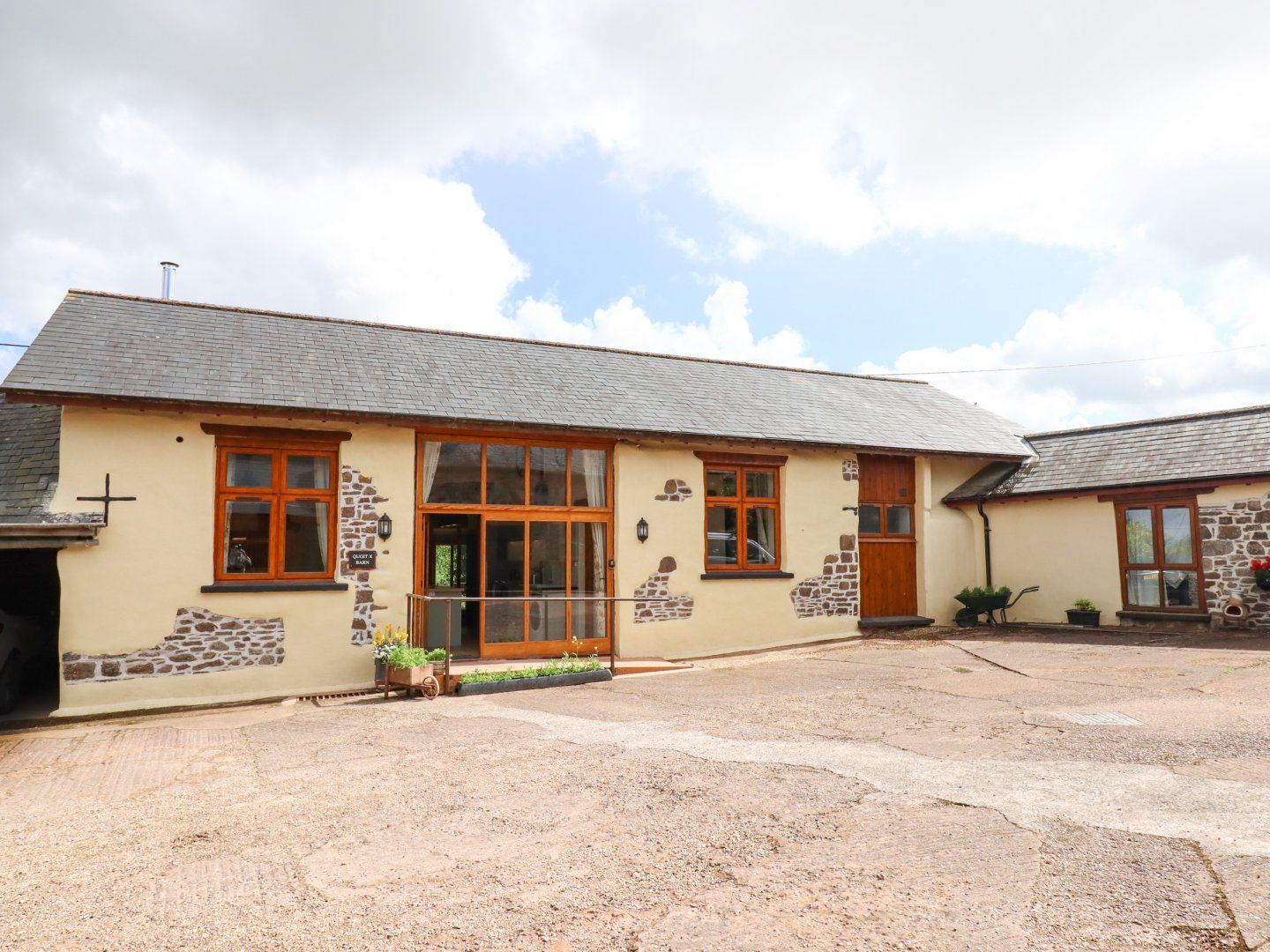 Holiday home This single-storey home consists of an open-plan living space with a kitchen with a rangemaster cooker, hob, microwave, fridge/freezer, washing machine,dishwasher, dining seating for four and a sitting area with woodburning stove and Smart TV. There is also a boot room to keep your shoes. The bedrooms consist of a super-king-size (zip/link) with TV and en-suite and a king-size bedroom with TV and an en-suite. Outside, there is an enclosed courtyard with furniture and off-road parking for two cars. WiFi, fuel, power, bed linen and towels are all included in the price. Two well-behaved dogs are welcome with a charge of £25 per week applied for the 2nd dog; however, smoking is not permitted. Within 4.8 miles there is a shop and within 0.1 miles, a pub. Quoit X Barn is a charming escape to the countryside of Devon.