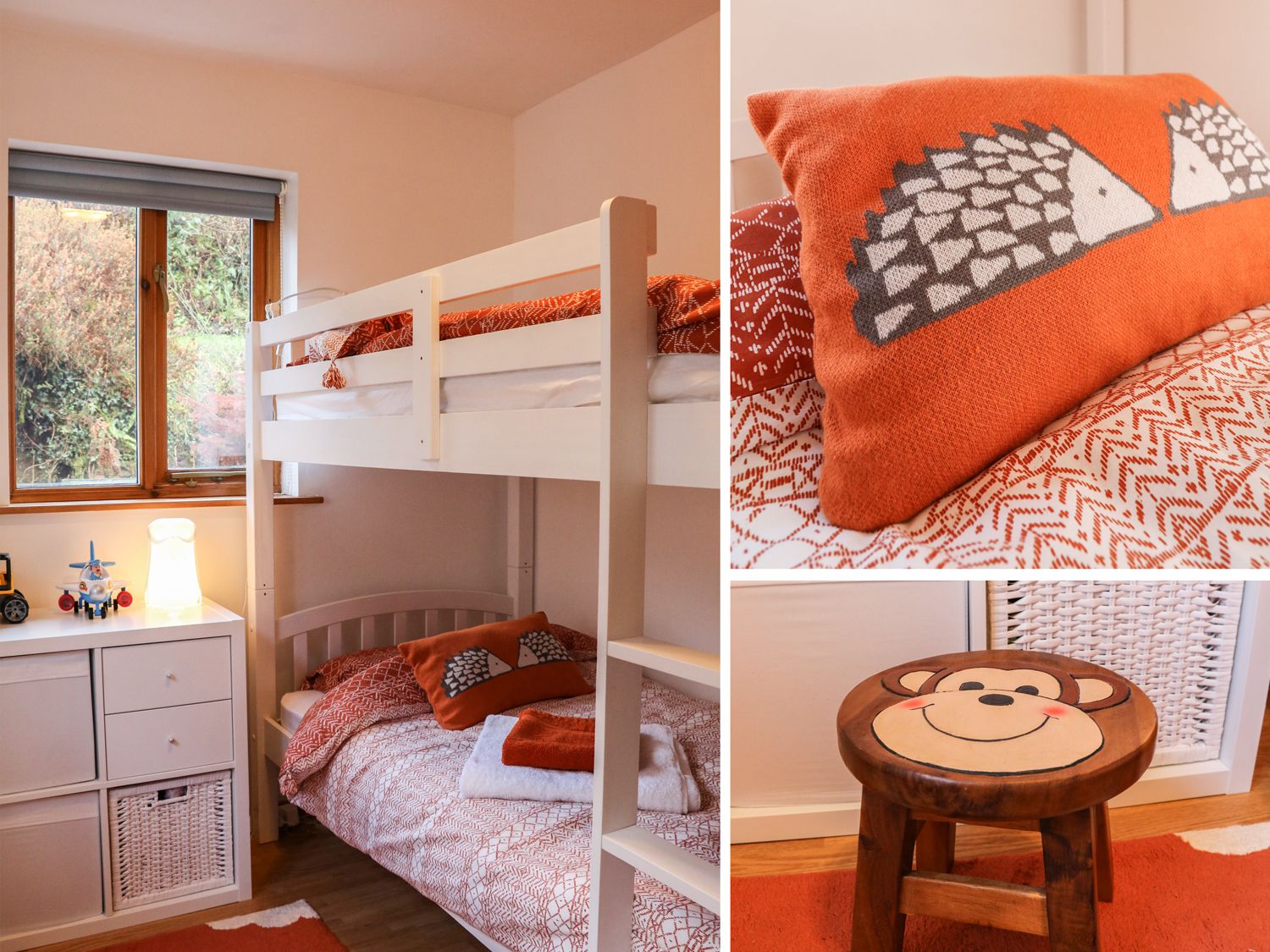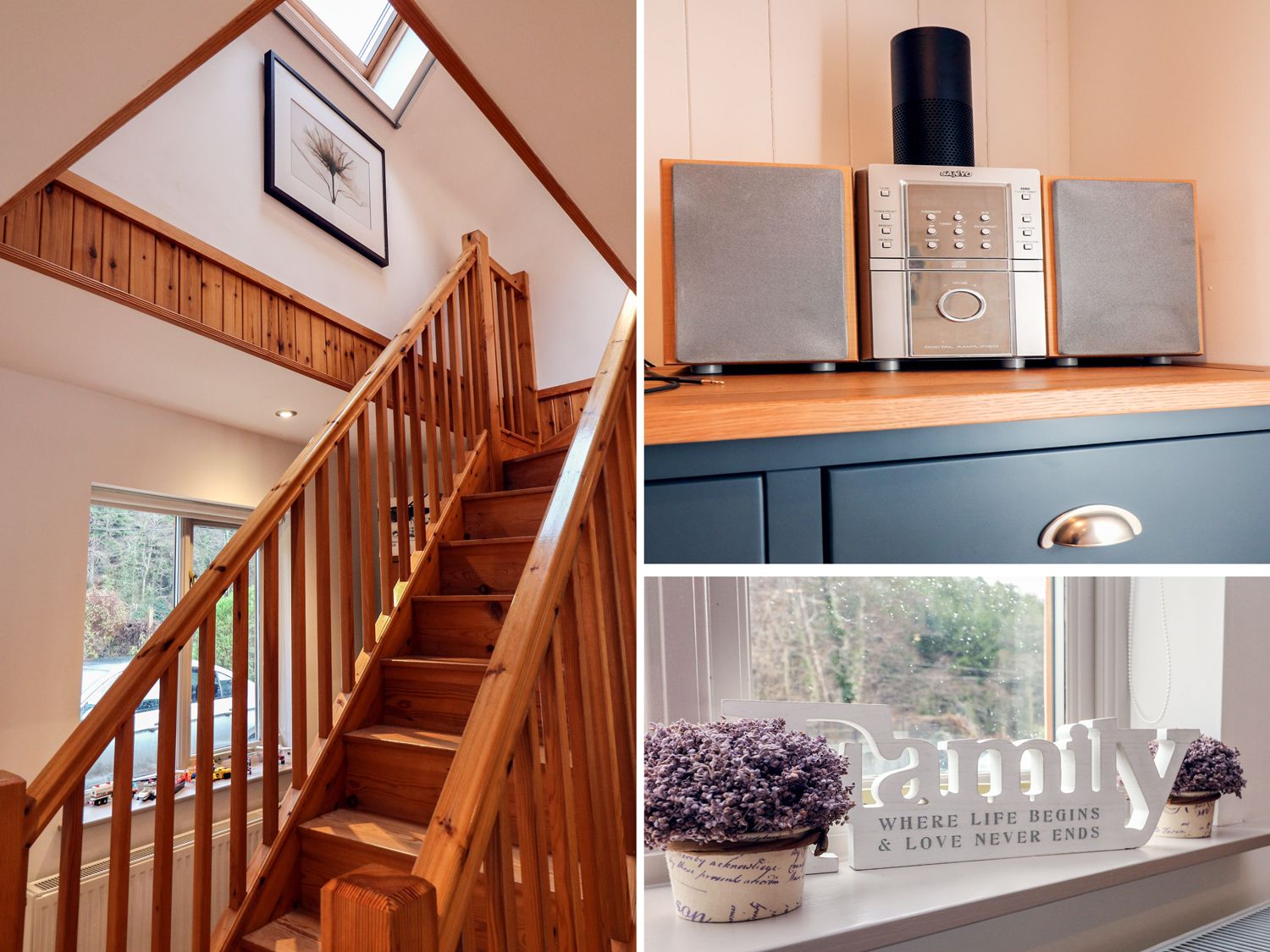 Accomodation Details Three bedrooms: 1 x king-size double, 1 x twin, 1 x ground floor child bunk. Bathroom with bath, shower over, basin and WC. Ground floor basin and WC. Open plan living area with a kitchen, dining area and a sitting area with a woodburning stove.