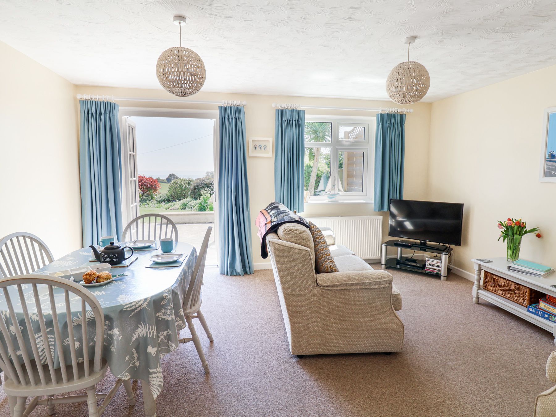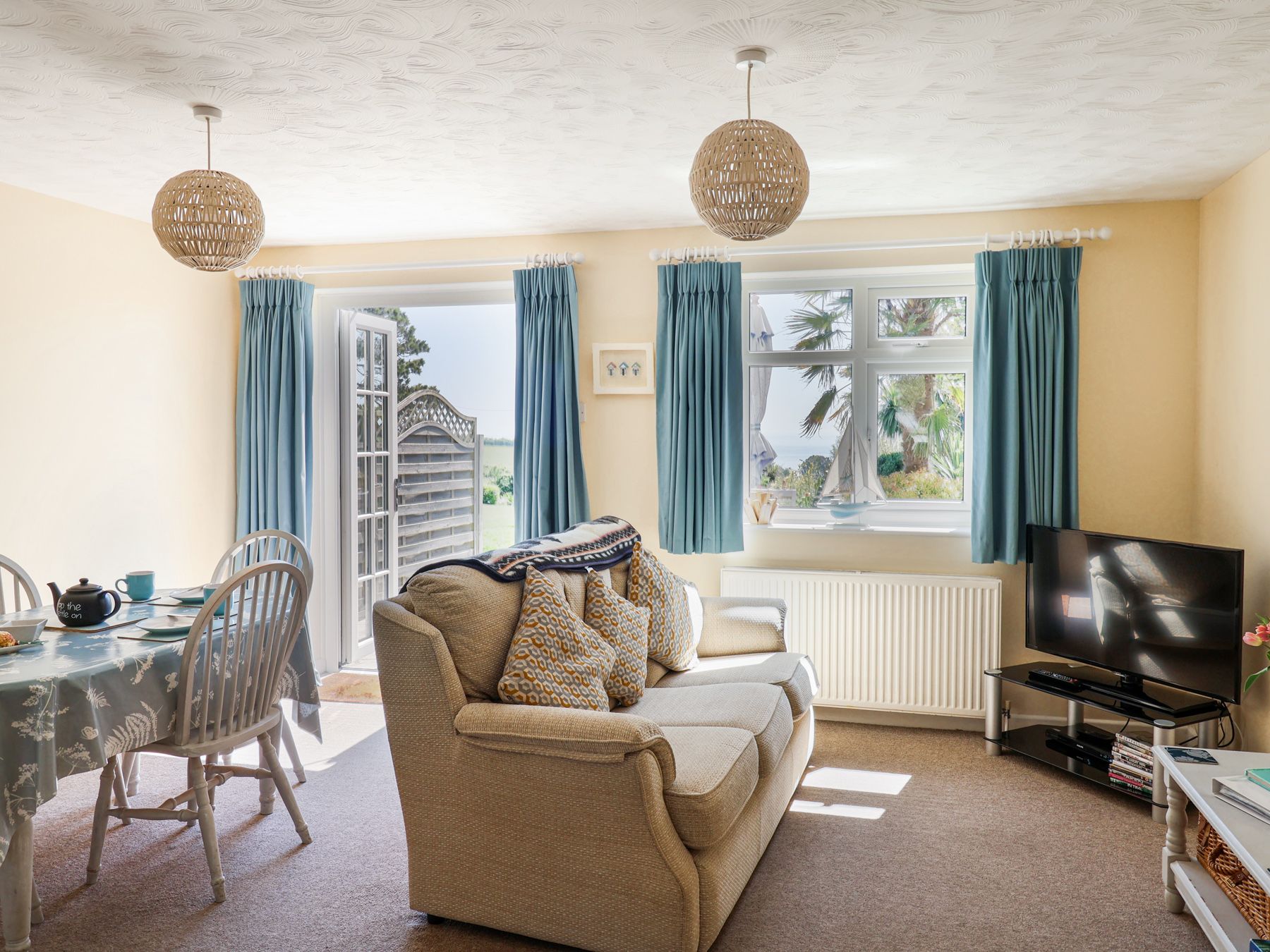Amenities Central heating. Electric oven and hob, microwave, fridge, freezer, washer/dryer, dishwasher. TV with Freeview and DVD player, WiFi. Sea views. Fuel and power inc. in rent. Bed linen and towels inc. in rent. Off-road parking available. Rear terrace with patio and furniture. One well-behaved dog welcome. Sorry, no smoking. Shop and beach 0.3 miles, pub 0.4 miles. Note: Check-in from 4pm, check-out by 10am