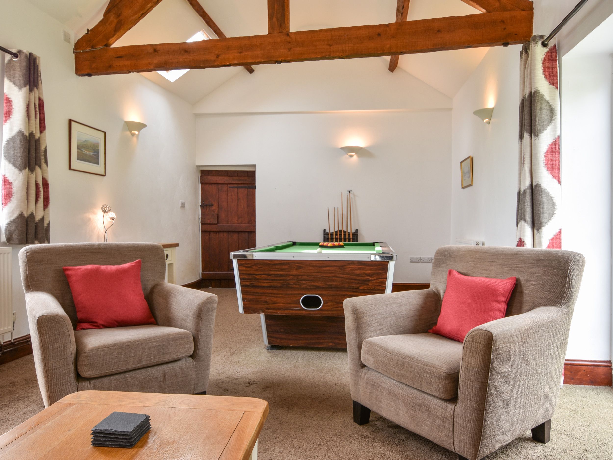 Amenities Electric central heating with woodburning stove. Electric oven and hob, microwave, large fridge, freezer (utility room), washing machine, tumble dryer and dishwasher. 2 x Smart TV, WiFi, selection of DVDs, pool table. Fuel, power inc in rent. Starter pack for woodburning stove inc. in rent Oct - March. Bed linen and towels inc. in rent (bath and hand towels provided, not bath sheets), please bring your own towels for the beach and hot tub. Travel cot and high chair available on request. Off-road parking for 3 cars. Enclosed garden with patio and decking area, furniture, barbecue and hot tub. Three well-behaved dogs welcome. Sorry, no smoking. Shop 1.5 miles, pub 0.9 miles. Note: The property is on a working farm. Note: Please be careful with steep steps in the property. Note: Arrival not before 5pm, departure by 10am. Note: EV charging not permitted. Note: This property can be booked with Ref 1088026 and 1178716 together sleeping up to 14 guests.