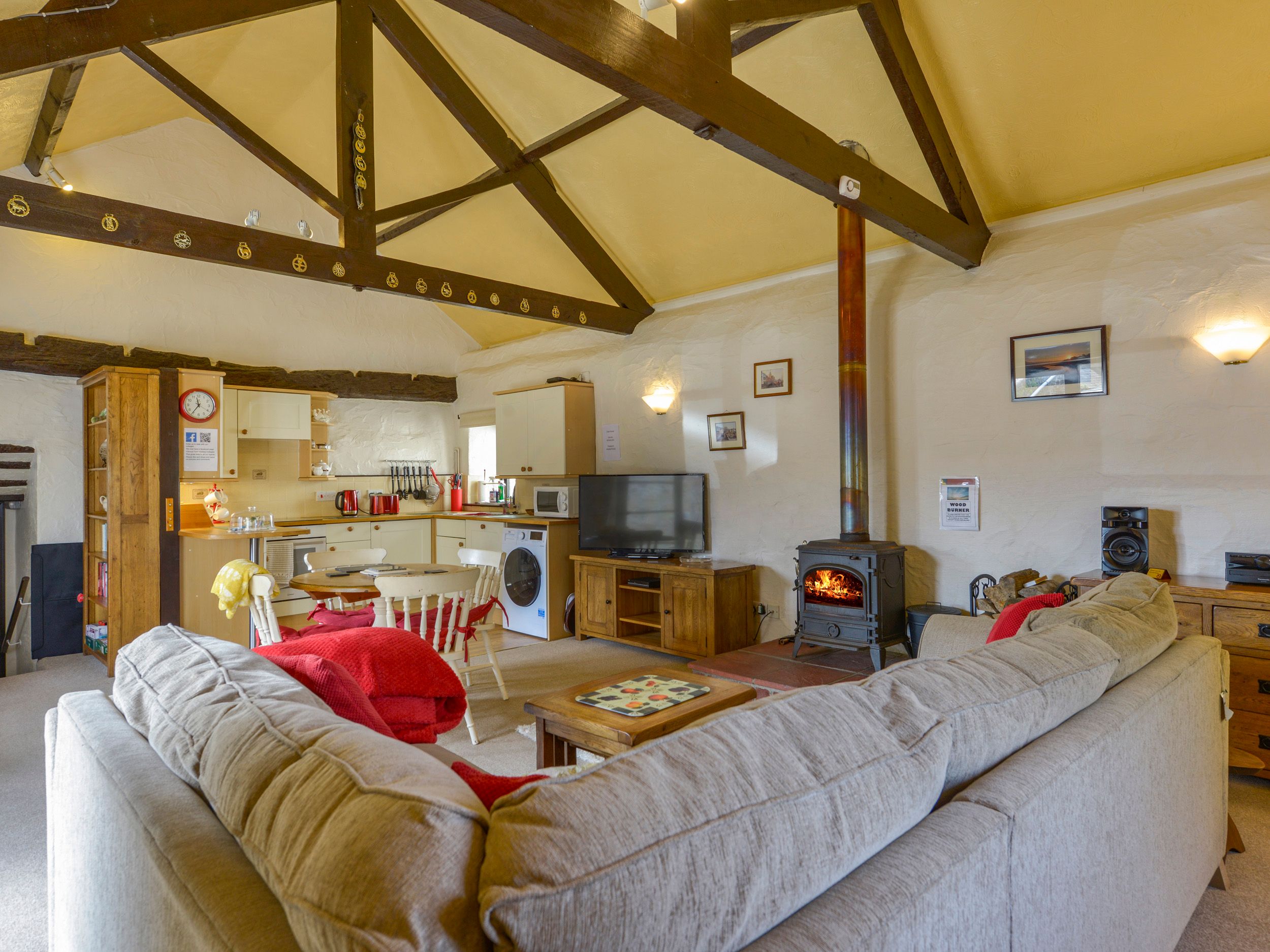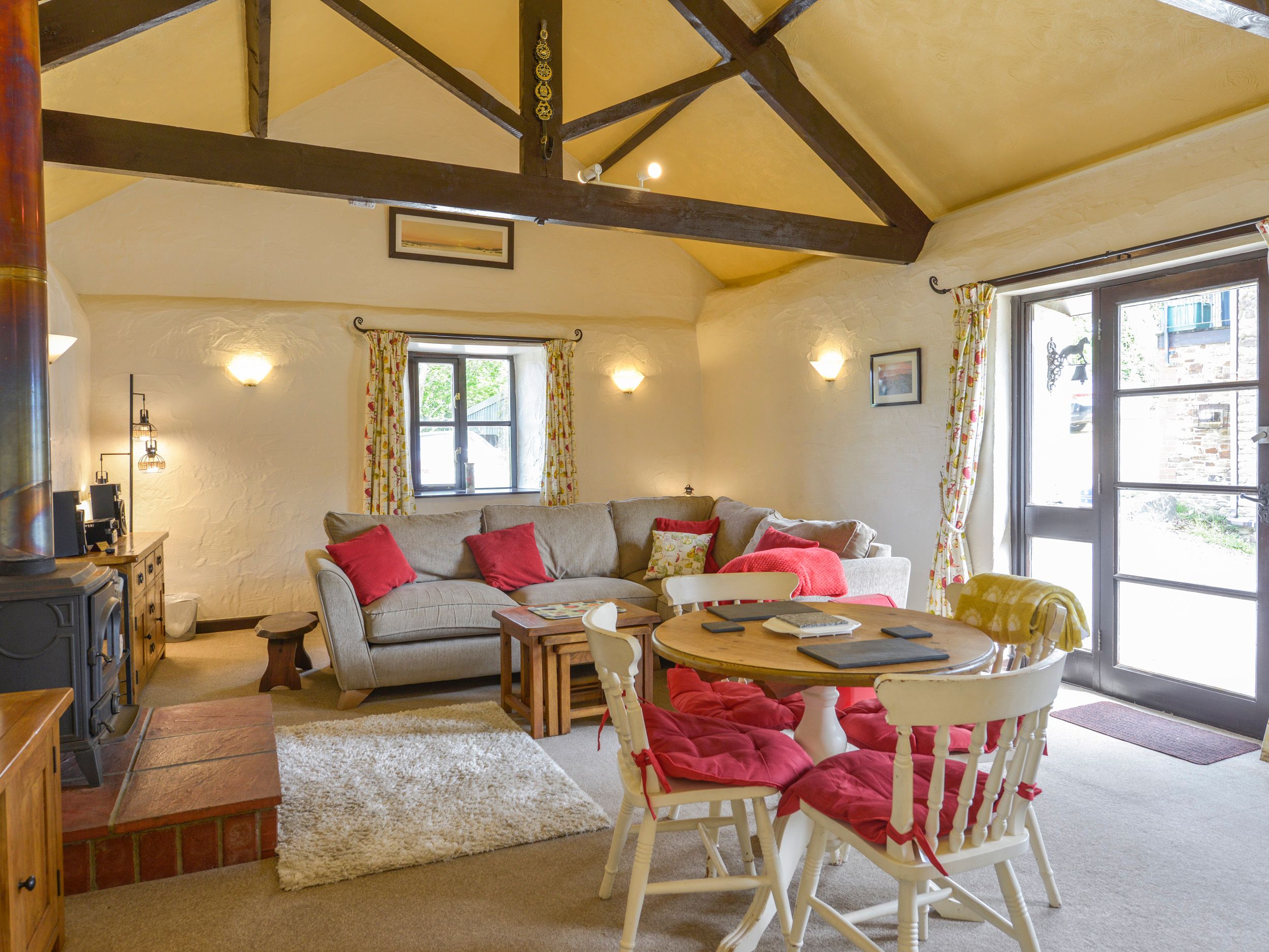 Amenities Electric central heating. Electric oven and hob, microwave, fridge, washer/dryer and dishwasher. 2 x TV, DVD player, HiFi sound system, Radio, CD Player, WiFi. Fuel, power and starter pack for woodburning stove inc. in rent. Bed linen and towels inc. in rent (bath and hand towels provided, not bath sheets), please bring your own towels for the beach and pool. Cot and highchair available on request. Off-road parking. Communal grounds and farmland with lawn, furniture, barbecue, and heated swimming pool. One well-behaved dog welcome. Sorry, no smoking. Shop 0.9 miles, shop 1.5 miles. Note: Pillhead Farm is a working farm. Note: Pet charge is £20 per full or part week. Note: Outdoor heated swimming pool, shared with other properties on-site, (15' x 30' x 4' to 5' deep) with paddling pool (10' x 9' x 1'6" deep) is available from the Friday immediately preceding the last bank holiday in May to the first Friday in September, 10am-evening. Note: Electric cars cannot be charged on site, but there is a charging point 4-minutes drive away (at Tesco). Note: Wood provided October - April