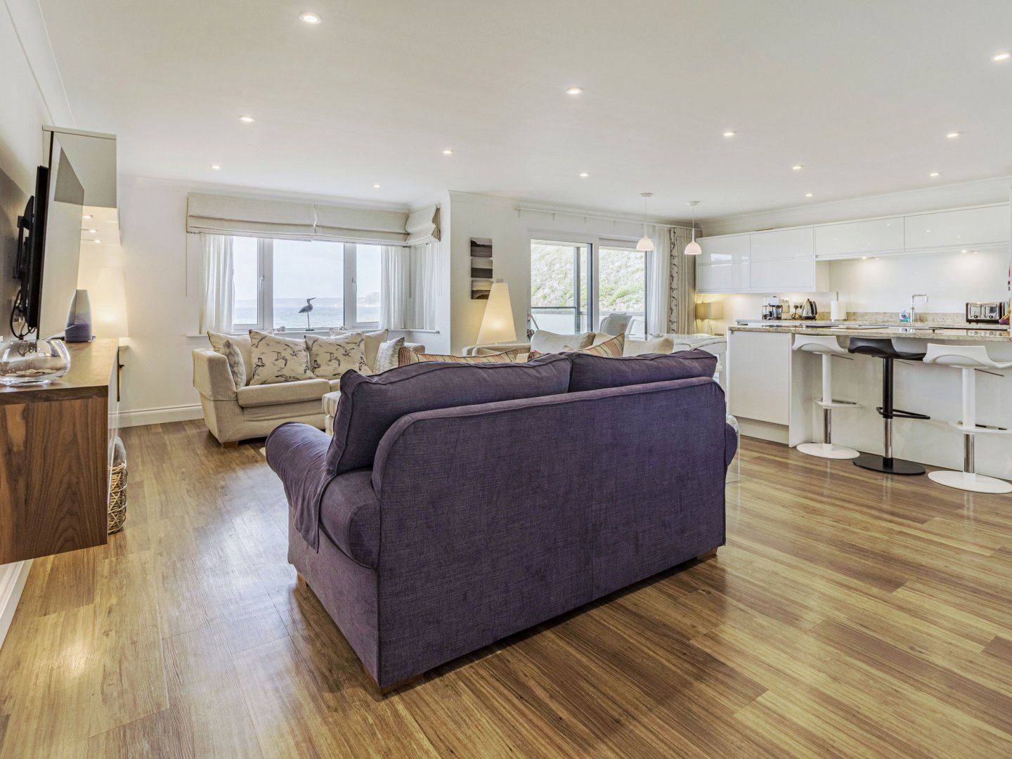 Accomodation Details First-floor apartment. Two bedrooms: 1 x double with Smart TV and en-suite walk-in shower, basin, heated towel rail and WC, 1 x twin with en-suite bath, shower over, basin, heated towel rail and WC. Open-plan living space with kitchen, dining area and sitting area with balcony