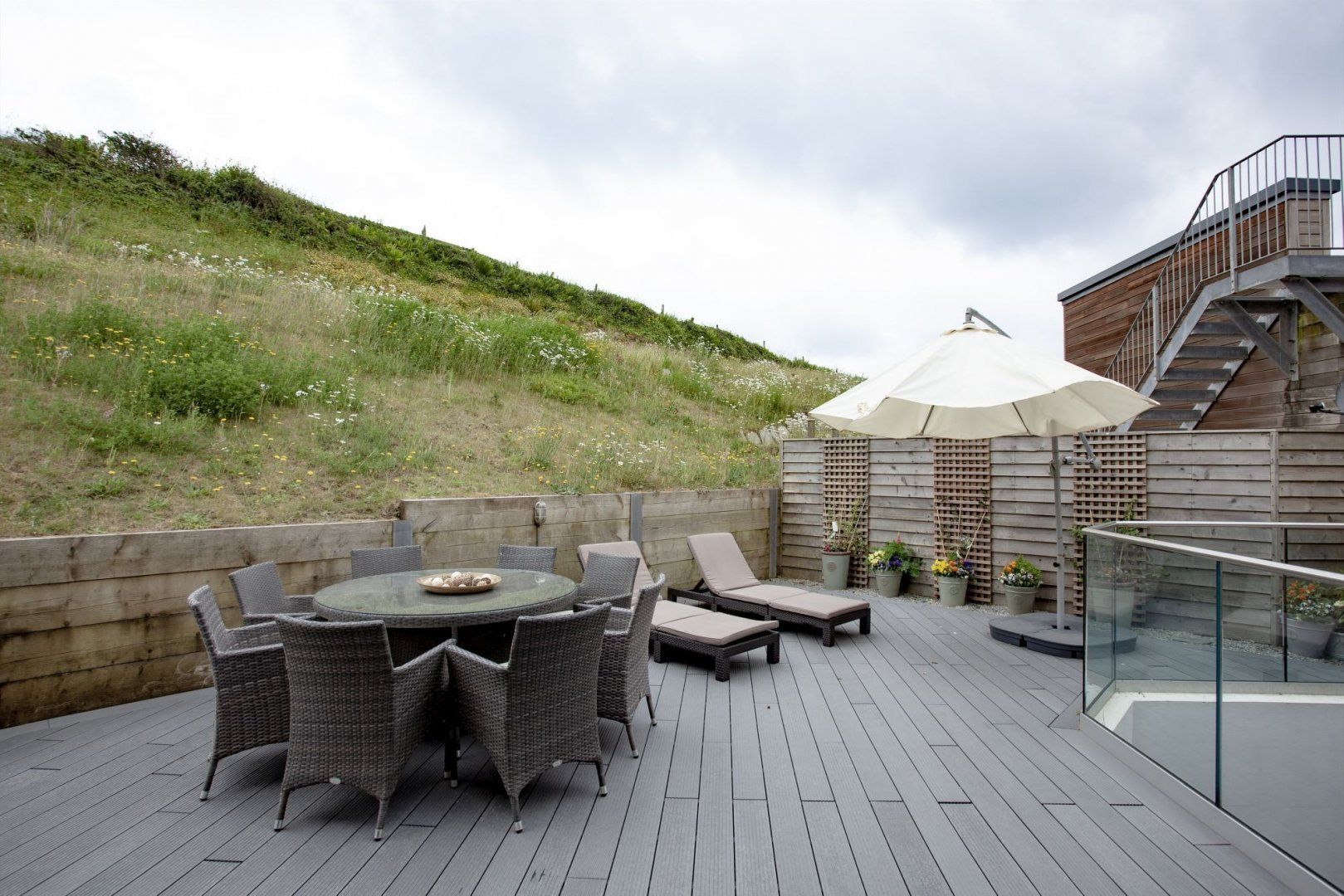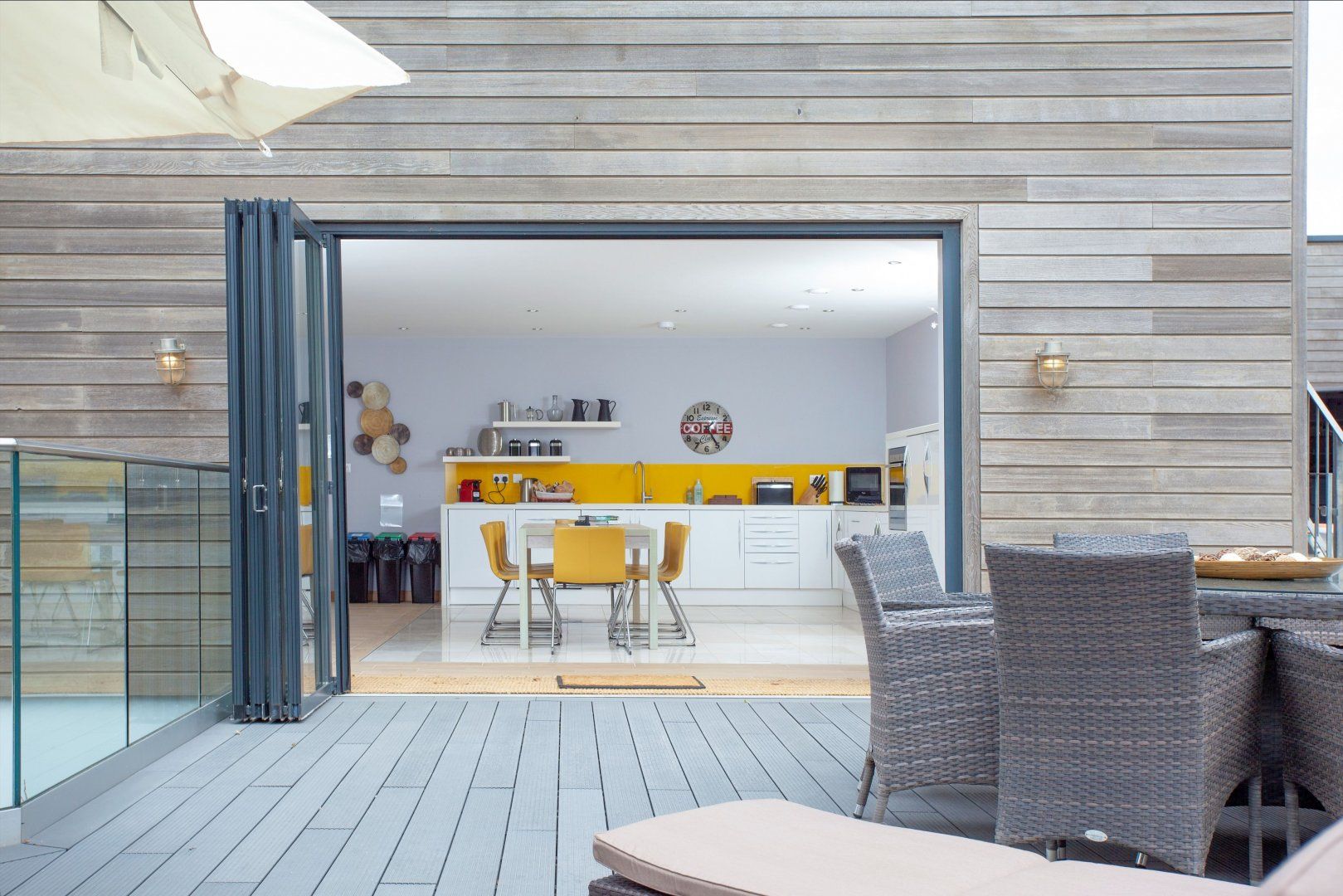 This design-led eco home combines the best of modern living in a beautiful coastal setting. Huge floor to ceiling glass windows look out onto rolling green hills and breathtaking views of the Devonshire coastline. The open, sunshine yellow kitchen is well equipped for whipping up home cooked meals, which can be eaten al fresco on the deck on warmer days. Follow the stairs up from the deck to reach the rooftop terrace, a sun trap and the perfect place to relax with a book in summer.