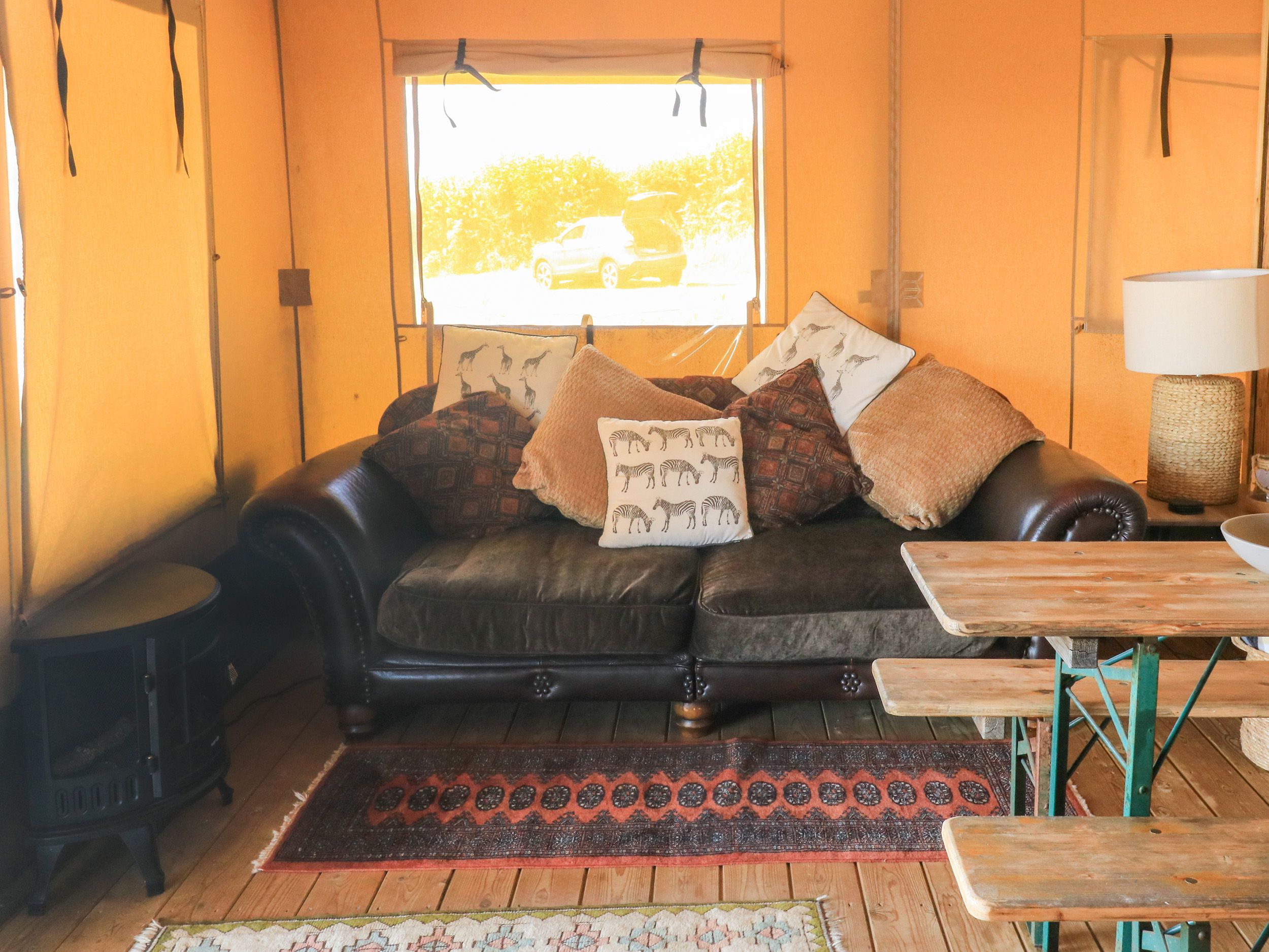 Holiday home The living areas in this single-storey glamping tent consist of an open-plan living space with kitchen equipped with gas hob, microwave and fridge with ice-box, a dining area for four and a sitting area with sofa and Smart TV. The bedrooms consist of one king and one double serviced by a shower room. Outside there is off-road parking available, a covered decking with furniture and a gravelled area with fire pit, barbecue and picnic bench with views over the valley. Within 1.6 miles there is a shop and 2.1 mile a pub. Short drive to Dartmouth Golf & Country Club. Sorry, no smoking. 1 well behaved dog welcome. WiFi, fuel, power, bed linen and towels are all included in the price. Enjoy a wonderful retreat at Semira in Devon. Note: Pitched on a slight hill, please take care. Note: Five stairs to gravel area and six steps up to decking, please take care.