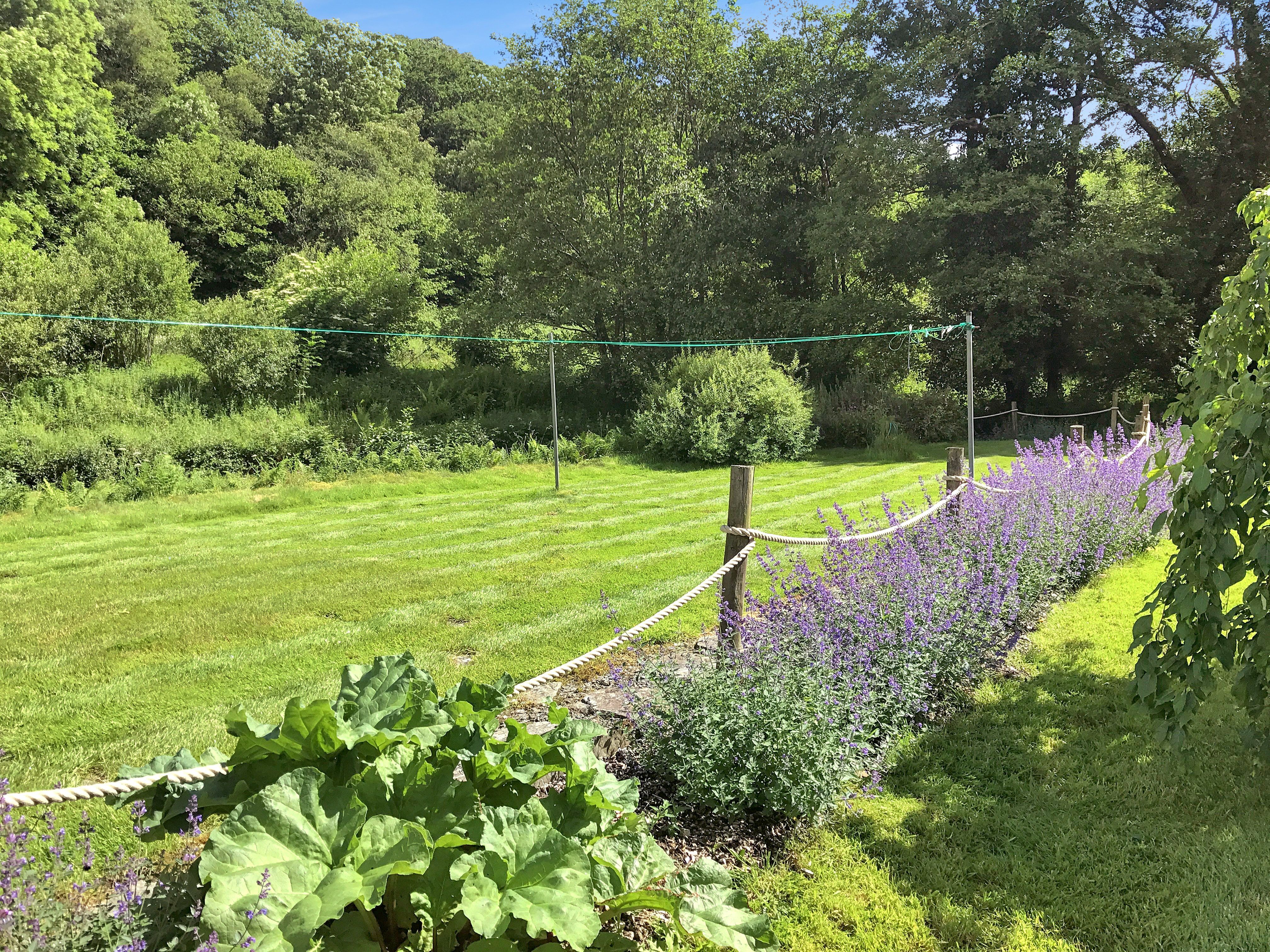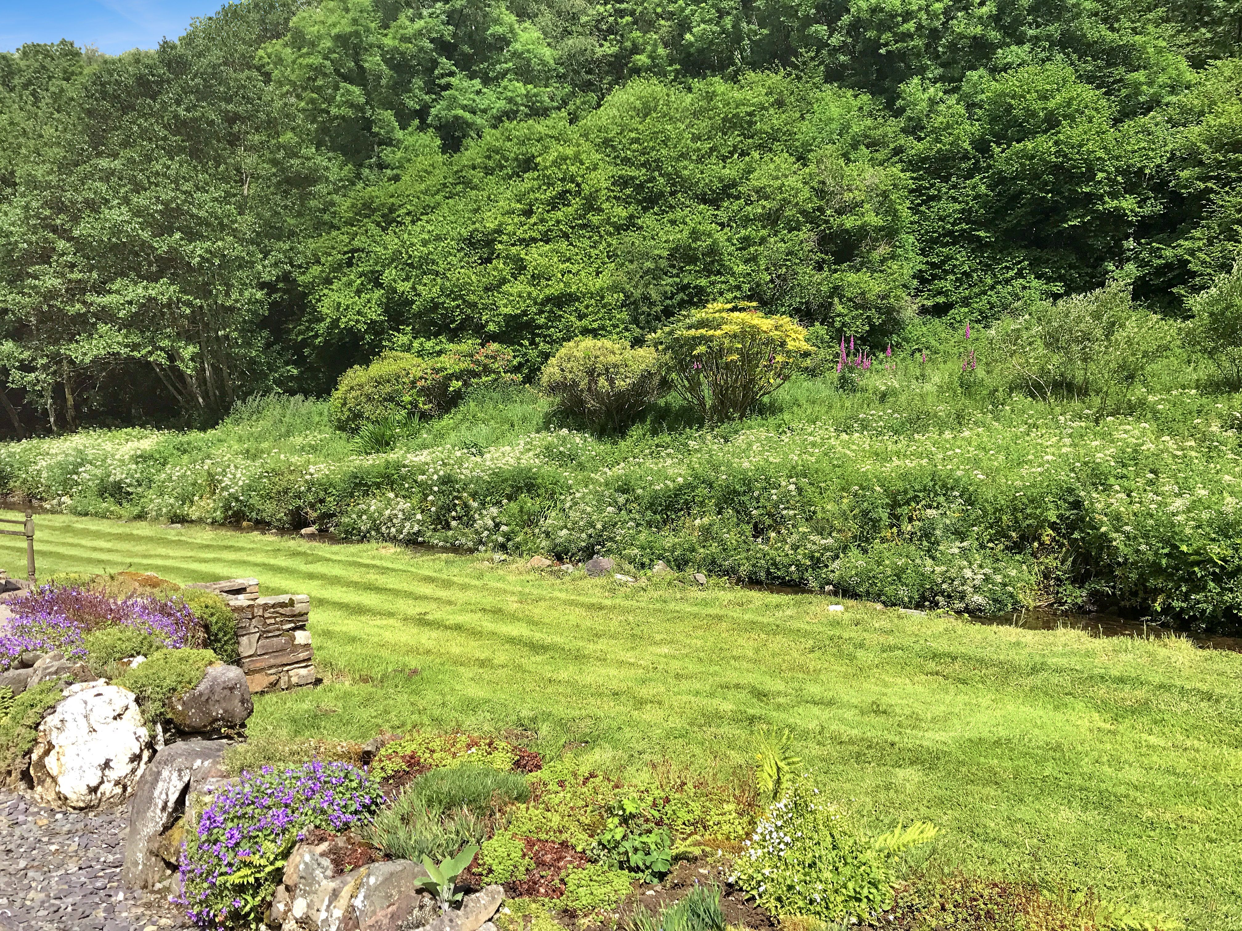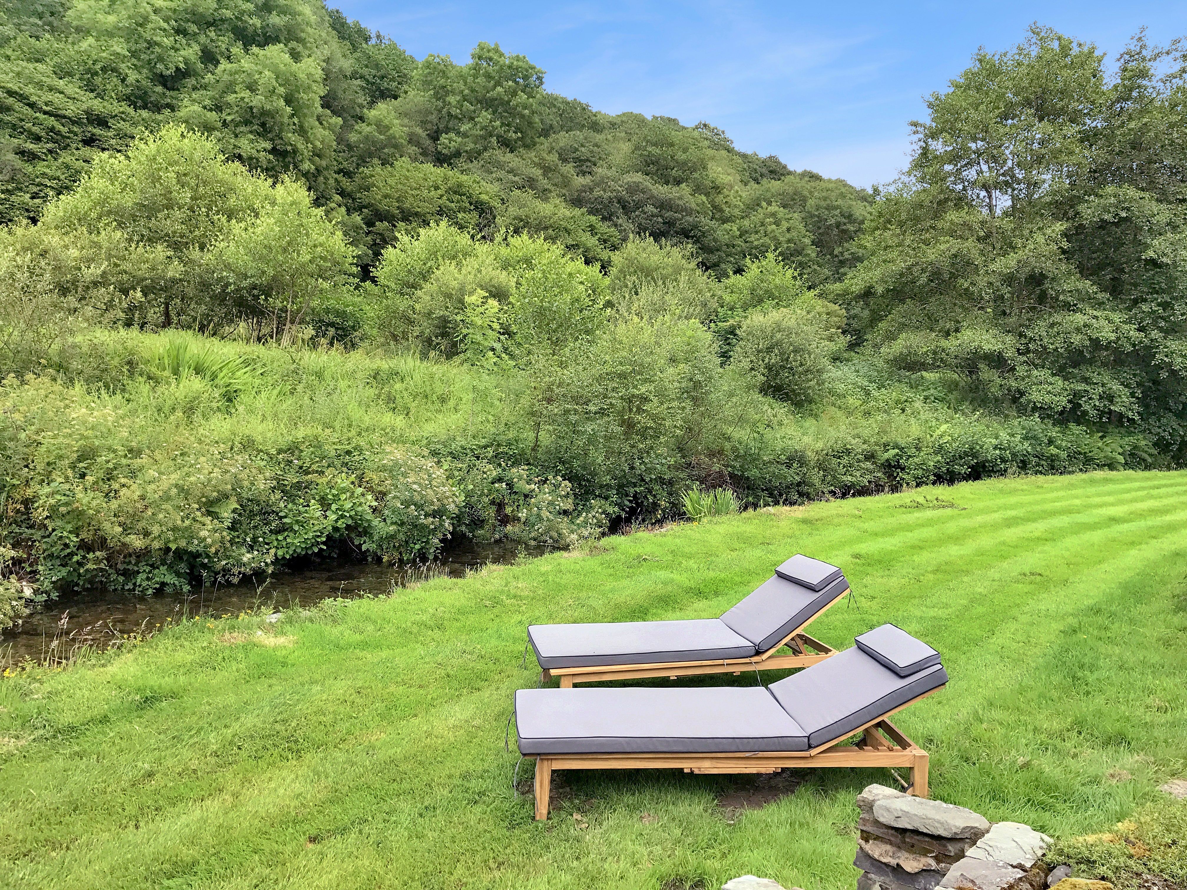Private lawns in front of and behind property, bordered by a trout stream on one side, with table and chairs provided to allow guests to make the most of the stunning location