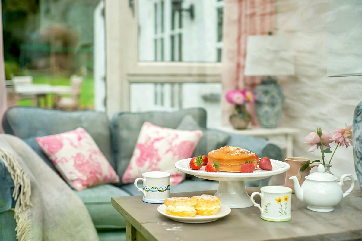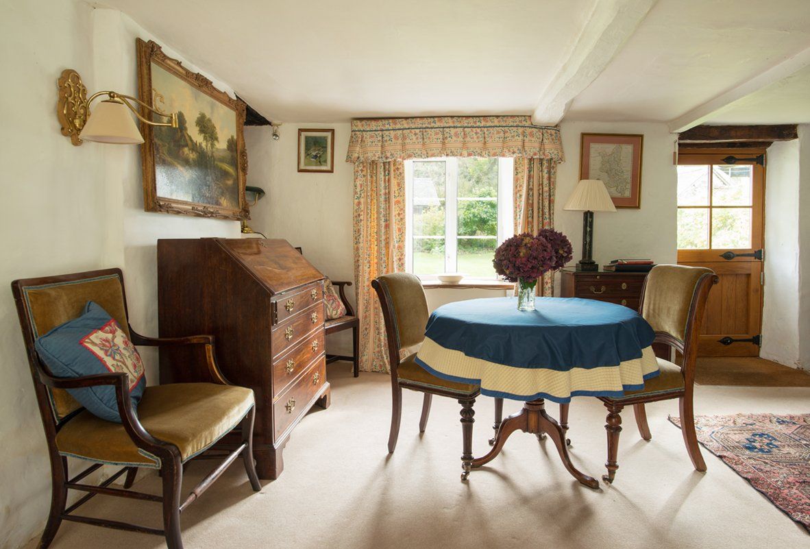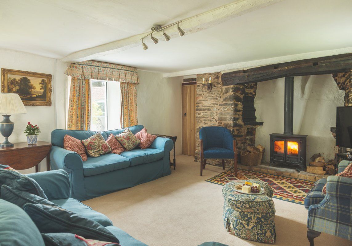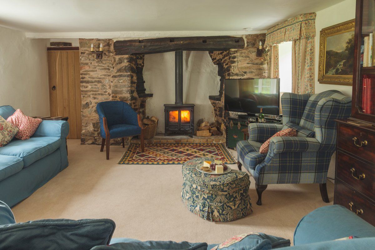 Large ground floor living area beautifully furnished with antiques, featuring TV/DVD player and wood-burning stove, with logs, kindling, and matches provided, plus a riverside conservatory