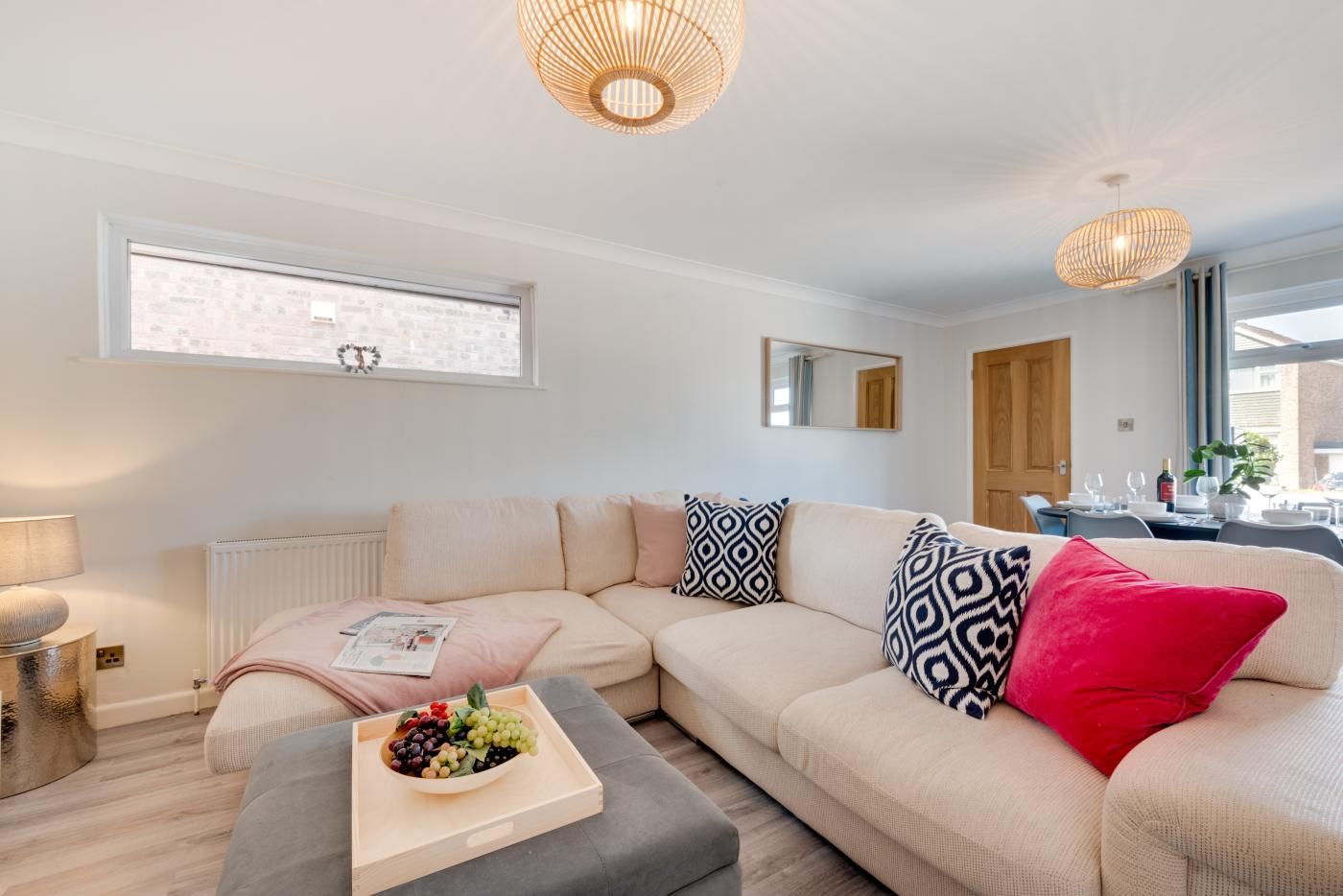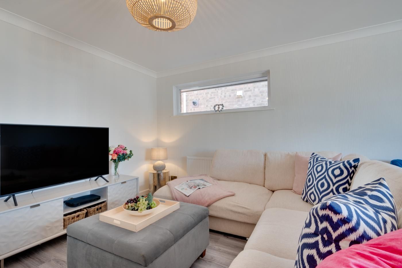 Step inside the bright and homely living space with neutral tones, a large āLā-shaped sofa, SmartTV, tub chair and a dining table.