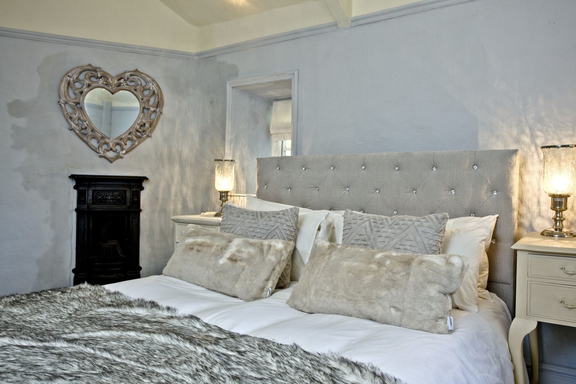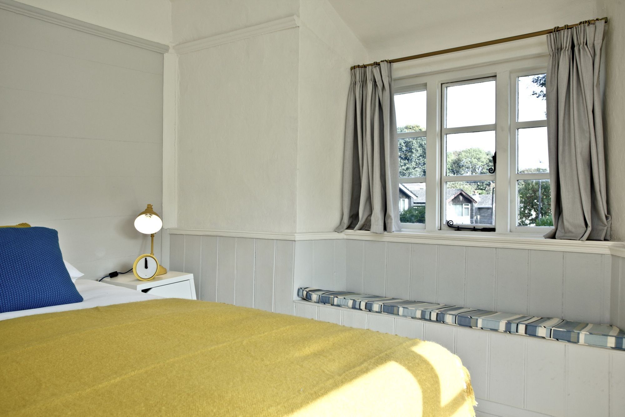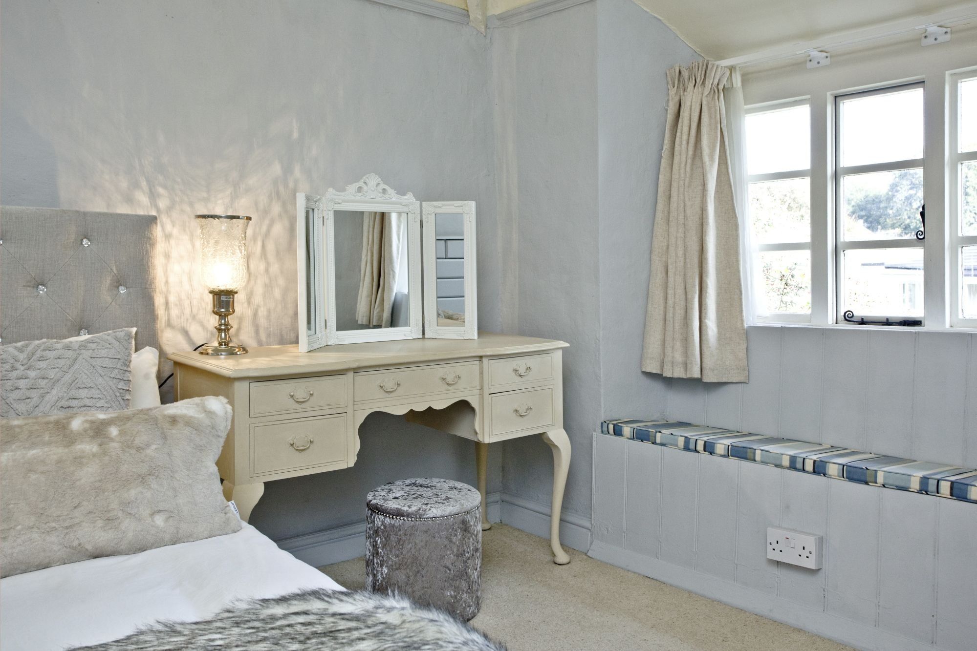 King size bed, bedside cabinet with lamp, dressing table with mirror and lamp and a window seat. A travel cot is available.