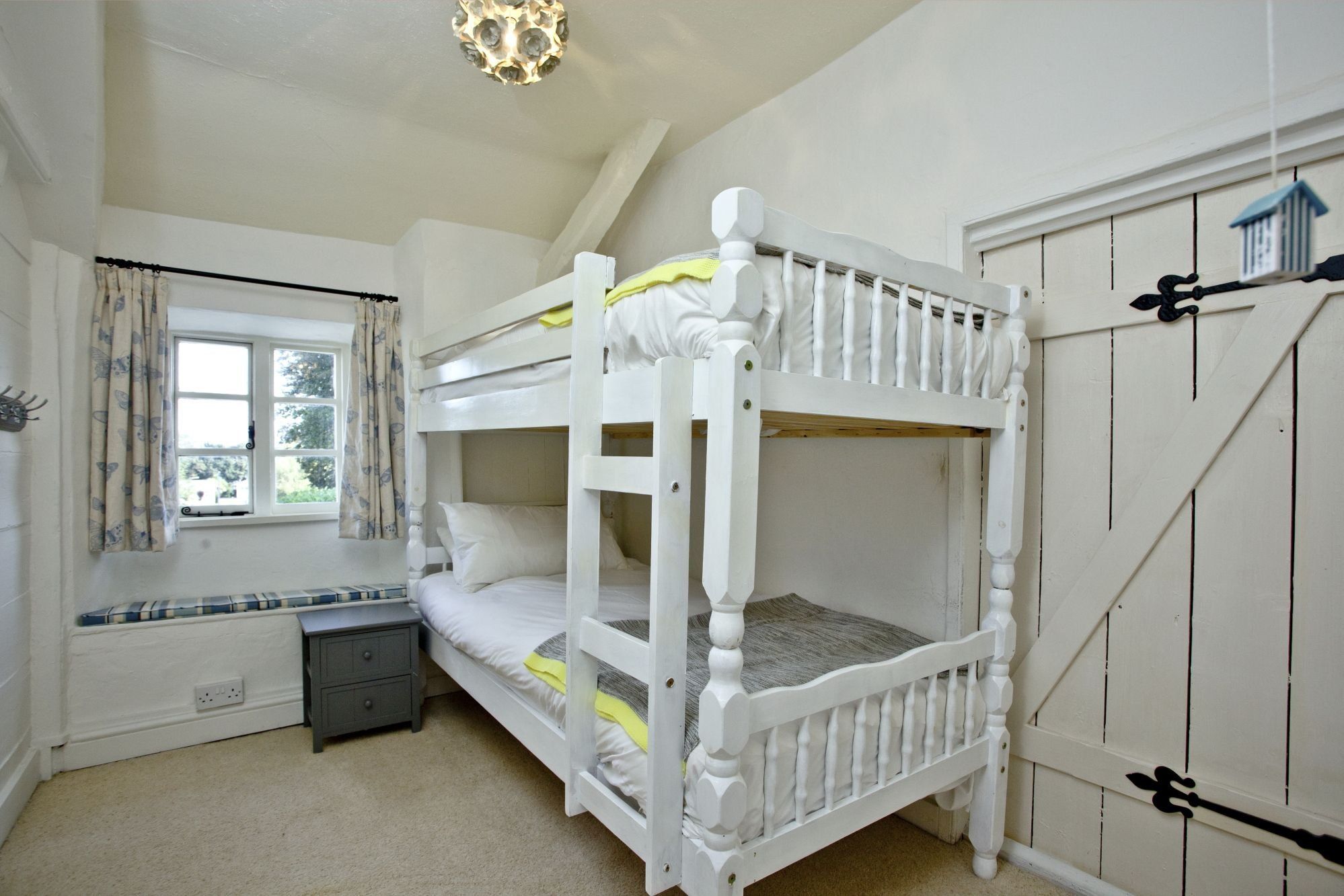 Bunk bed, bedside cabinet and window seat. The bunk beds are only suitable for children. There is a double sofa bed in the living area for groups of eight adults..
