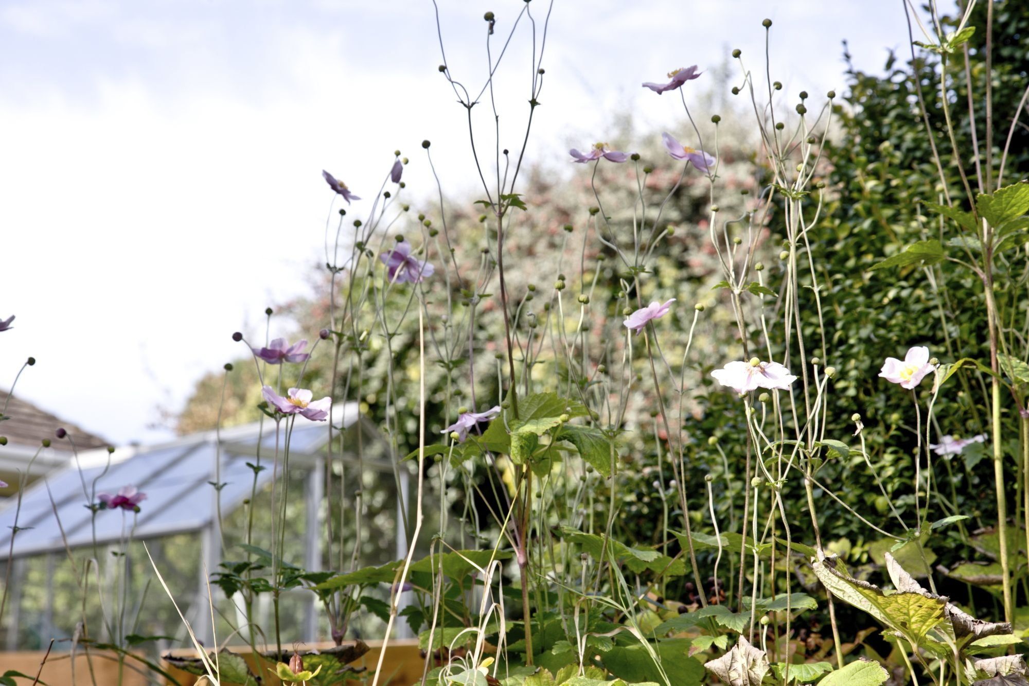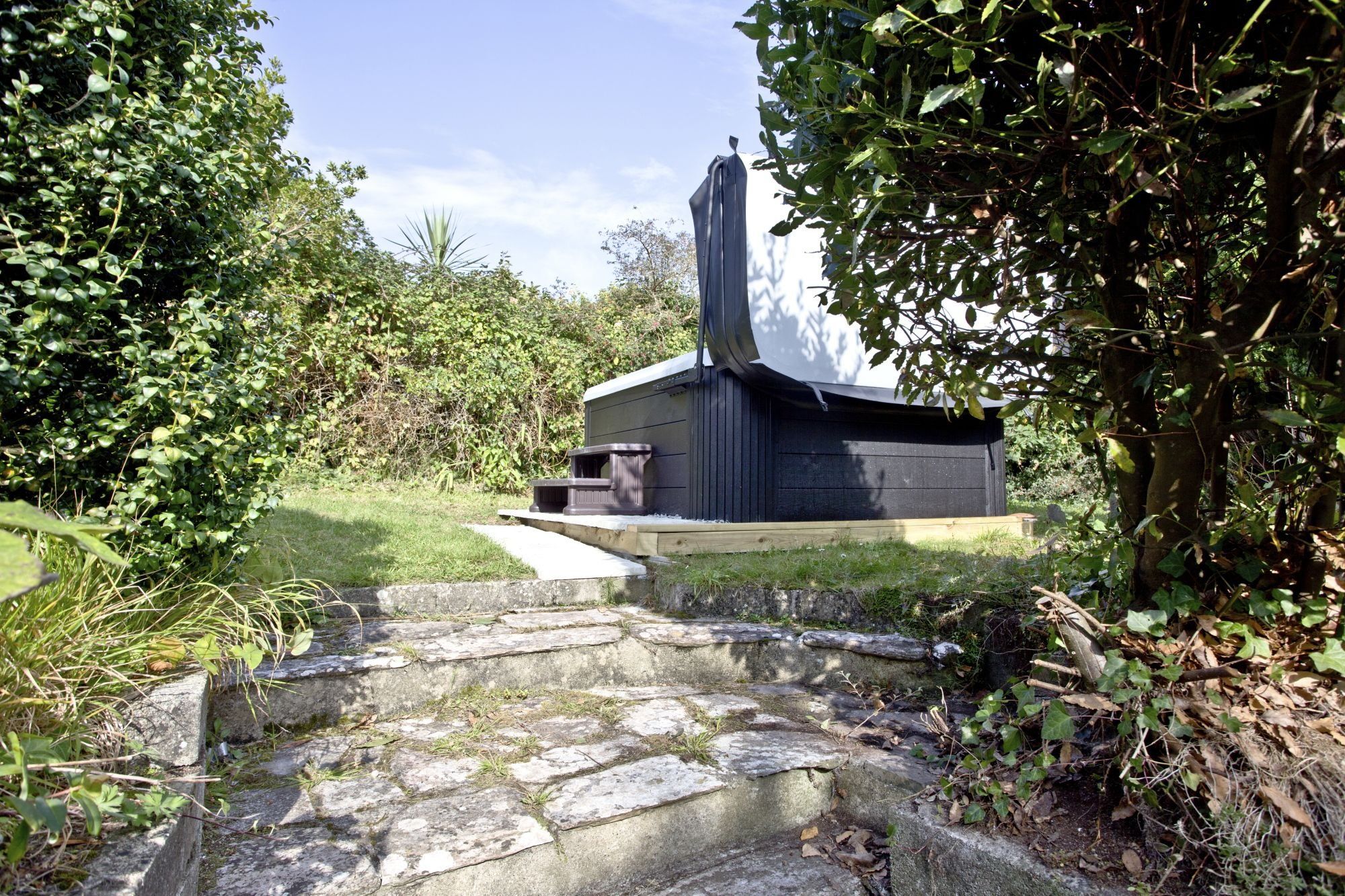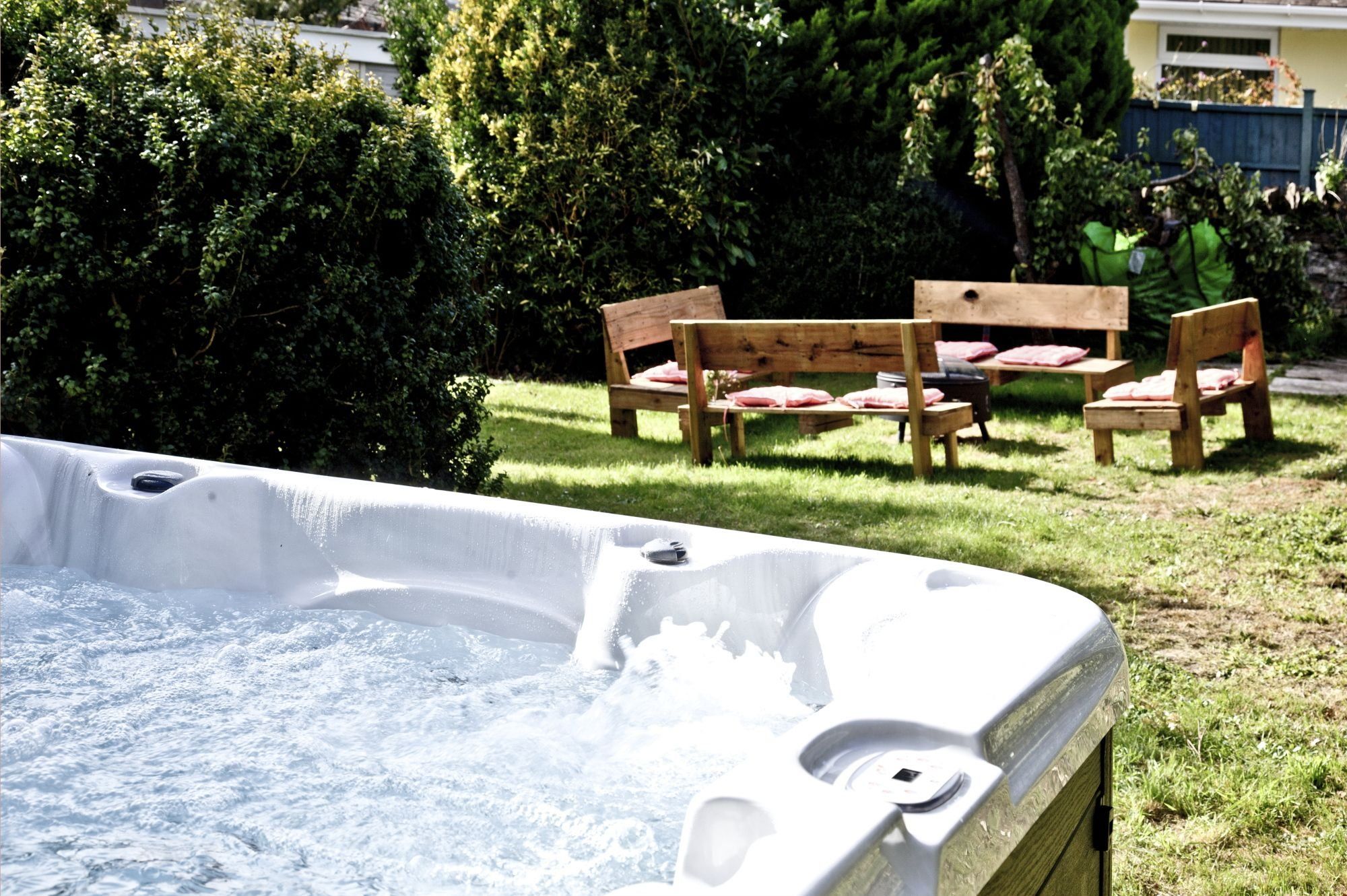 Garden with wooden seating and firepit. Private hot tub. Parking.