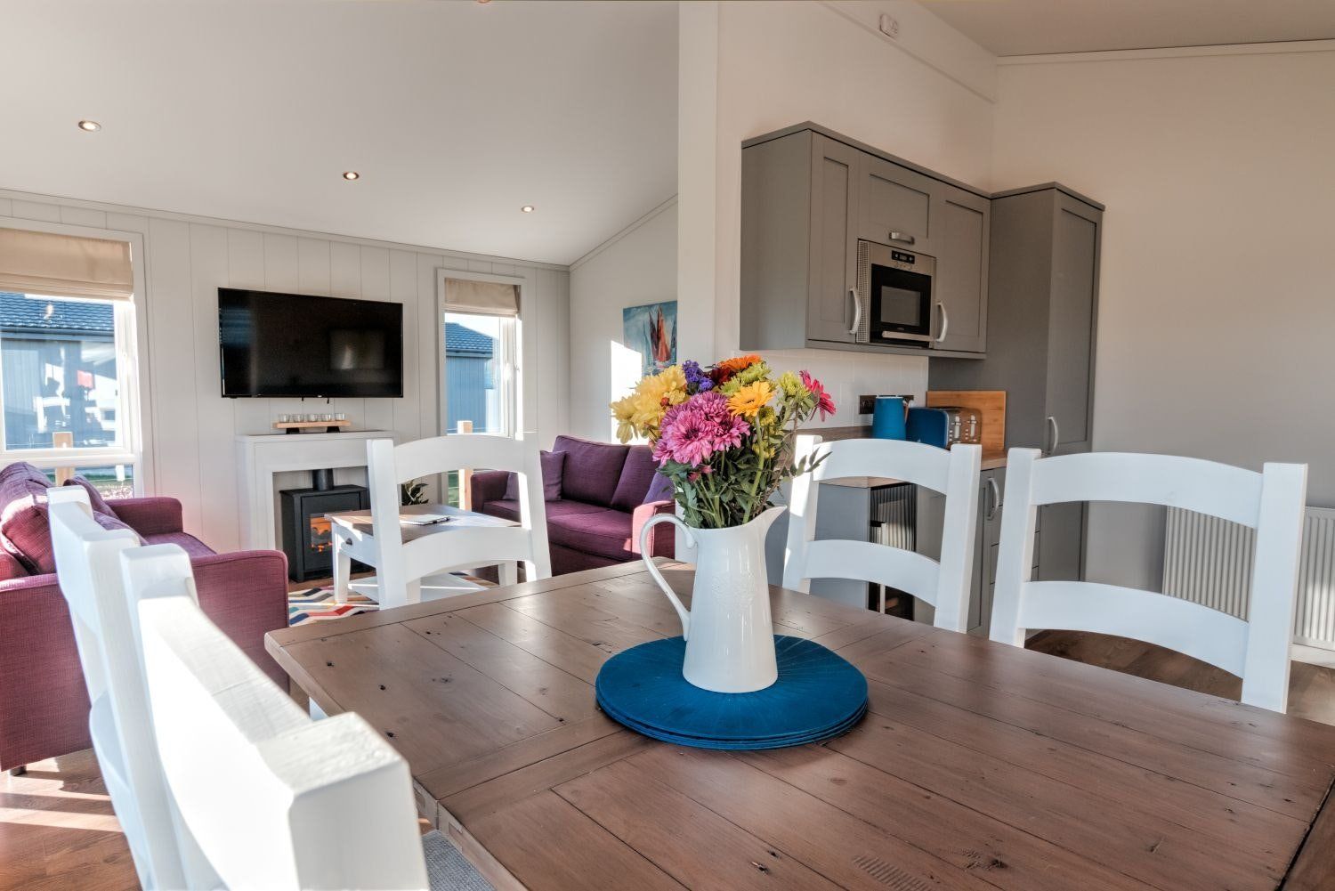 There’s nothing better than unlacing your hiking boots, changing into your swimsuit and slipping into the private hot tub after a day on the trail. A rattan dining set on the terrace is the perfect spot for a tipple or two as day turns to evening and the fields around you are bathed in golden light. This is an undeniably peaceful spot. Heading inside, get the electric stove on in the living room and curl up on the royal purple sofas. The kitchen has everything you need to handle the bustle of family breakfast time, and the breakfast table sits in a sunny spot, thanks to floor-to-ceiling windows.