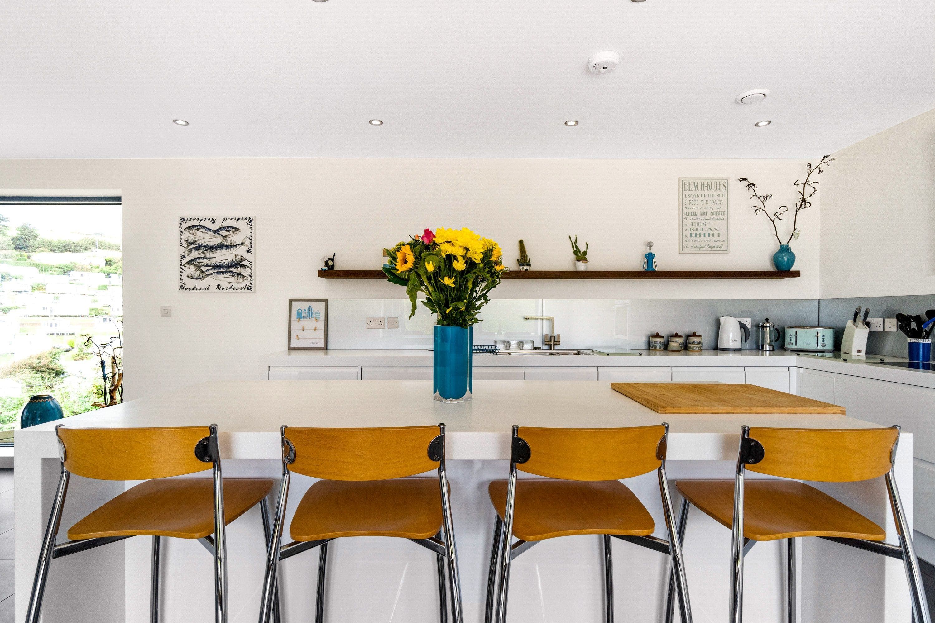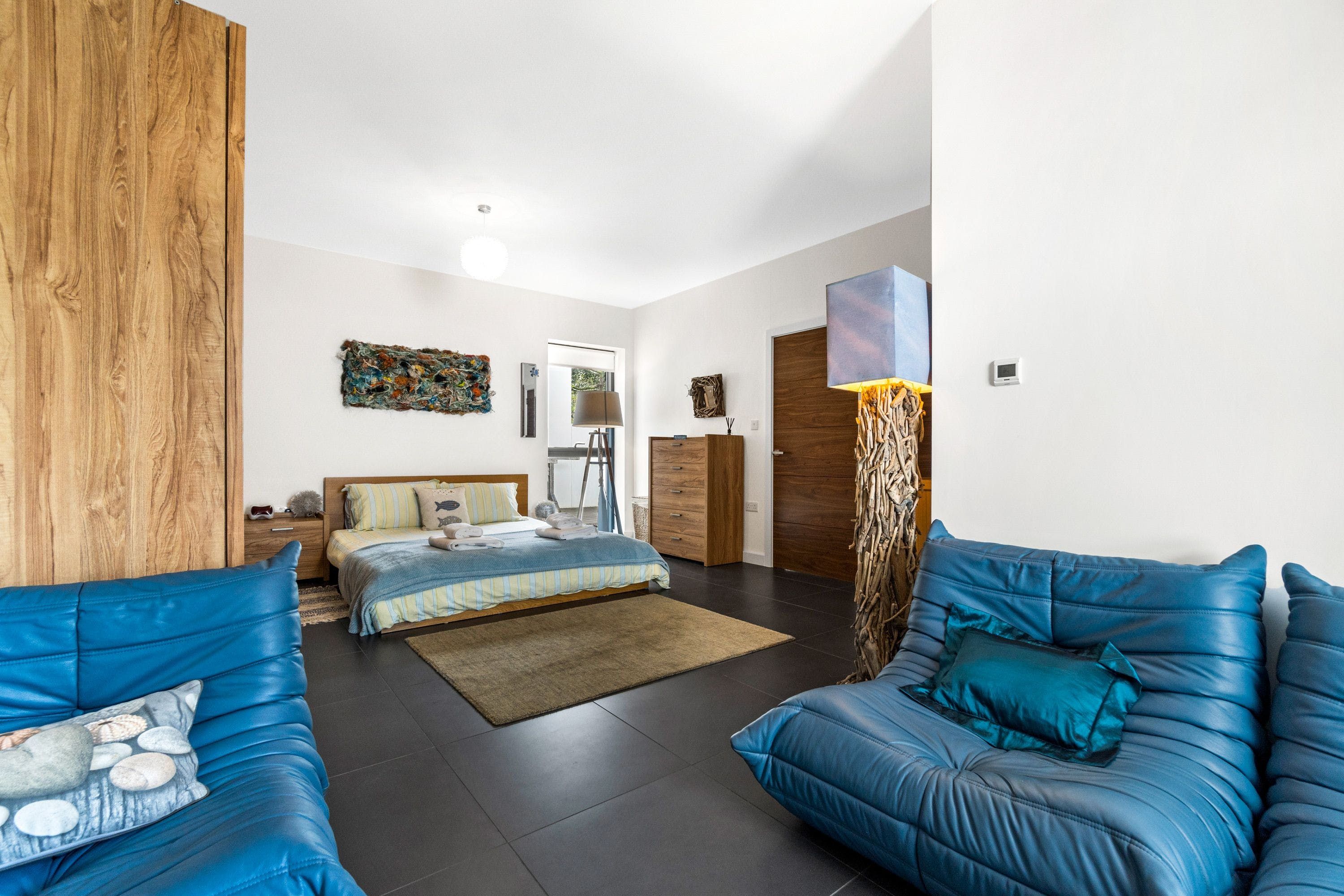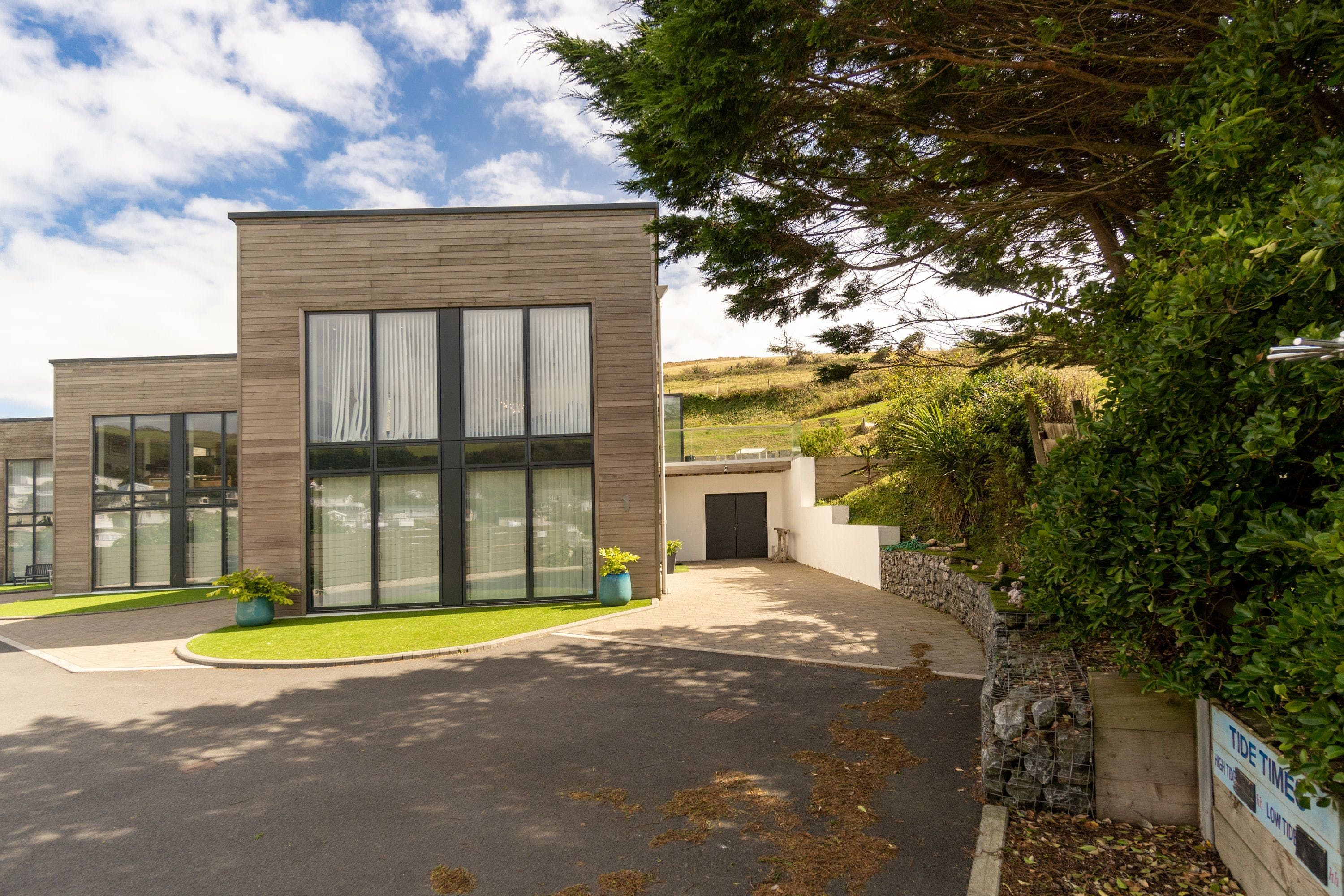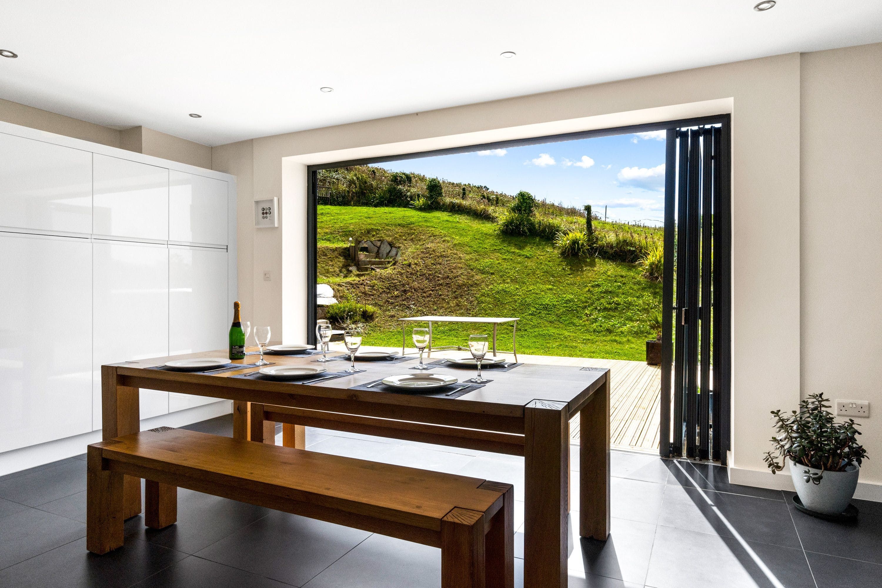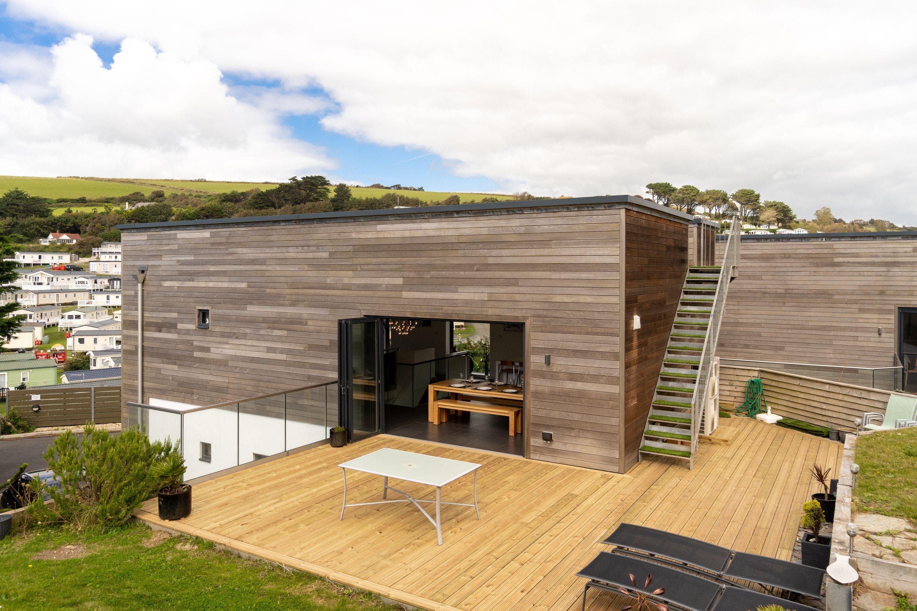 You’ll find this timber-clad, eco-friendly home on Devon’s South Hams coastline, a forty-eight-minute drive from Plymouth and a two-minute walk from Challaborough Bay Beach. Inside the abode, expect an ocean-inspired colour scheme of deep blue, turquoise and aqua. There’s an open-plan living space that’s ideal for socialising – keep glasses topped up as conversation flows in the seating area while your group’s appointed chef cooks up a storm in the sleek kitchen. On sunny days, take your meals out on the terrace or head up to the roof deck and dine with views of the water. Once you’re refuelled and raring to go, grab your beach essentials and take the quick trip to Challaborough’s pebbled shore. Amble along the South West Coast Path for twenty-five minutes to the stunning Ayrmer Cove to find beasties in rock pools and hidden sandy spots. Return home to rinse salty wetsuits in the outdoor shower, then bundle into the snug for a movie marathon and hot cups of cocoa.