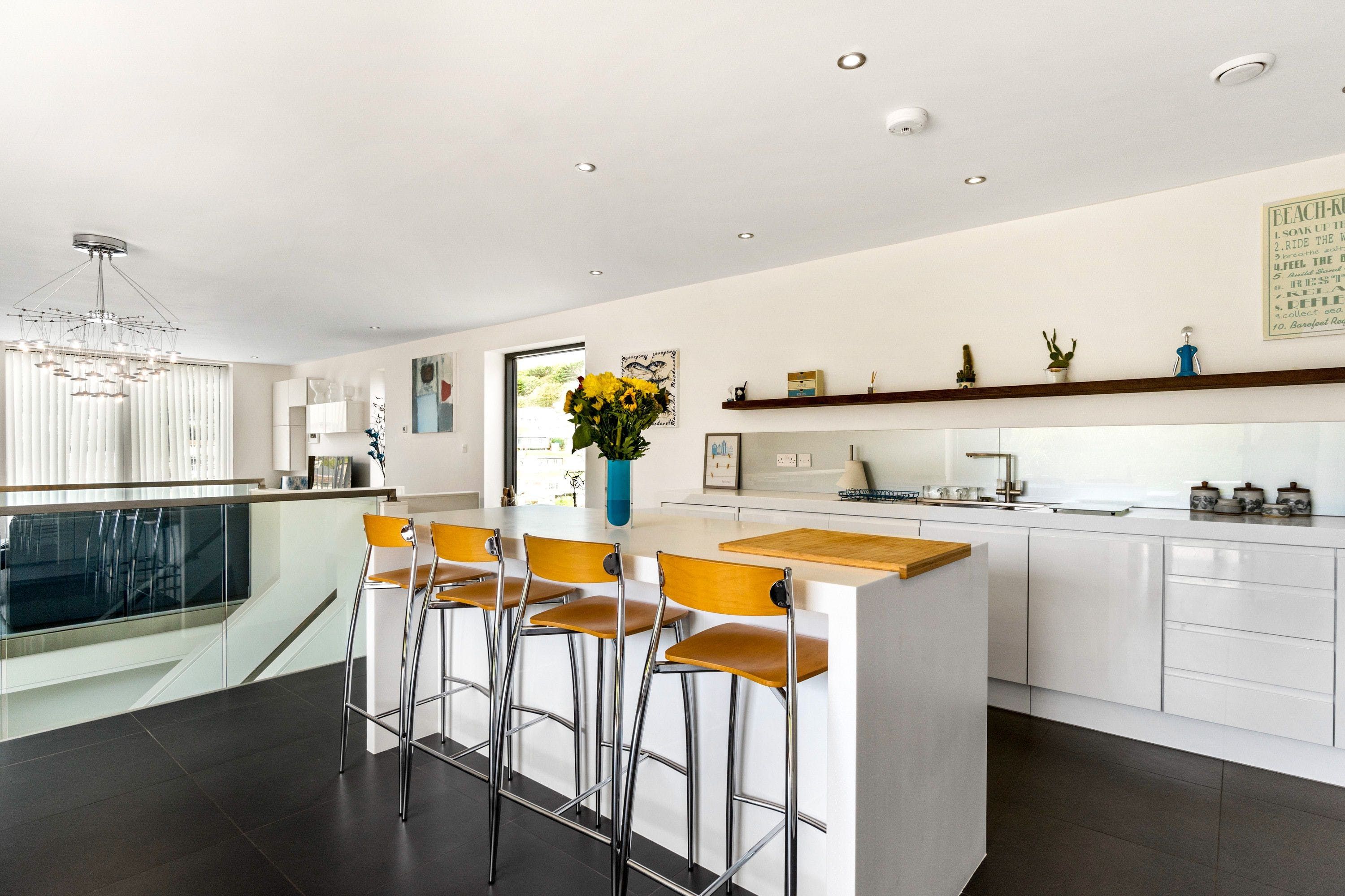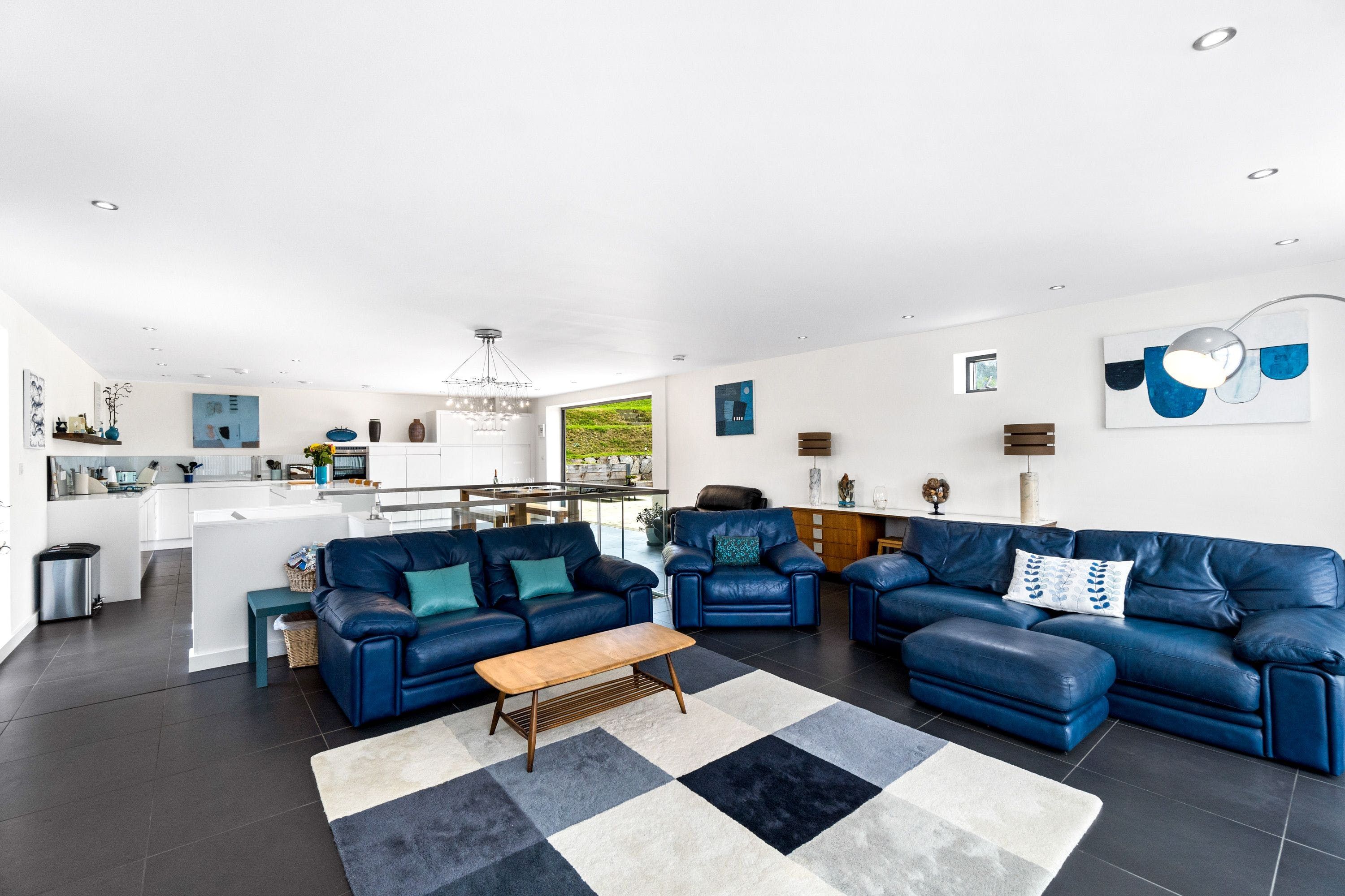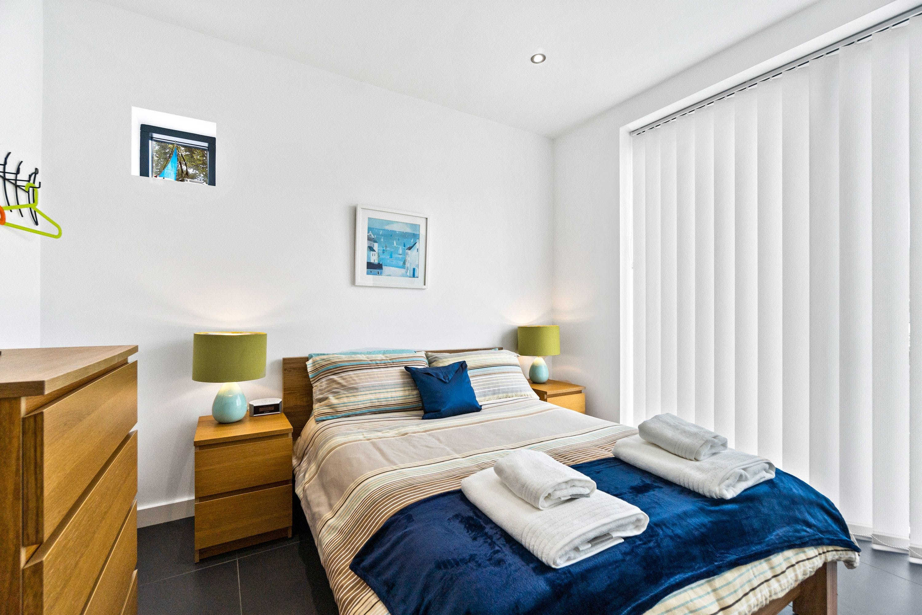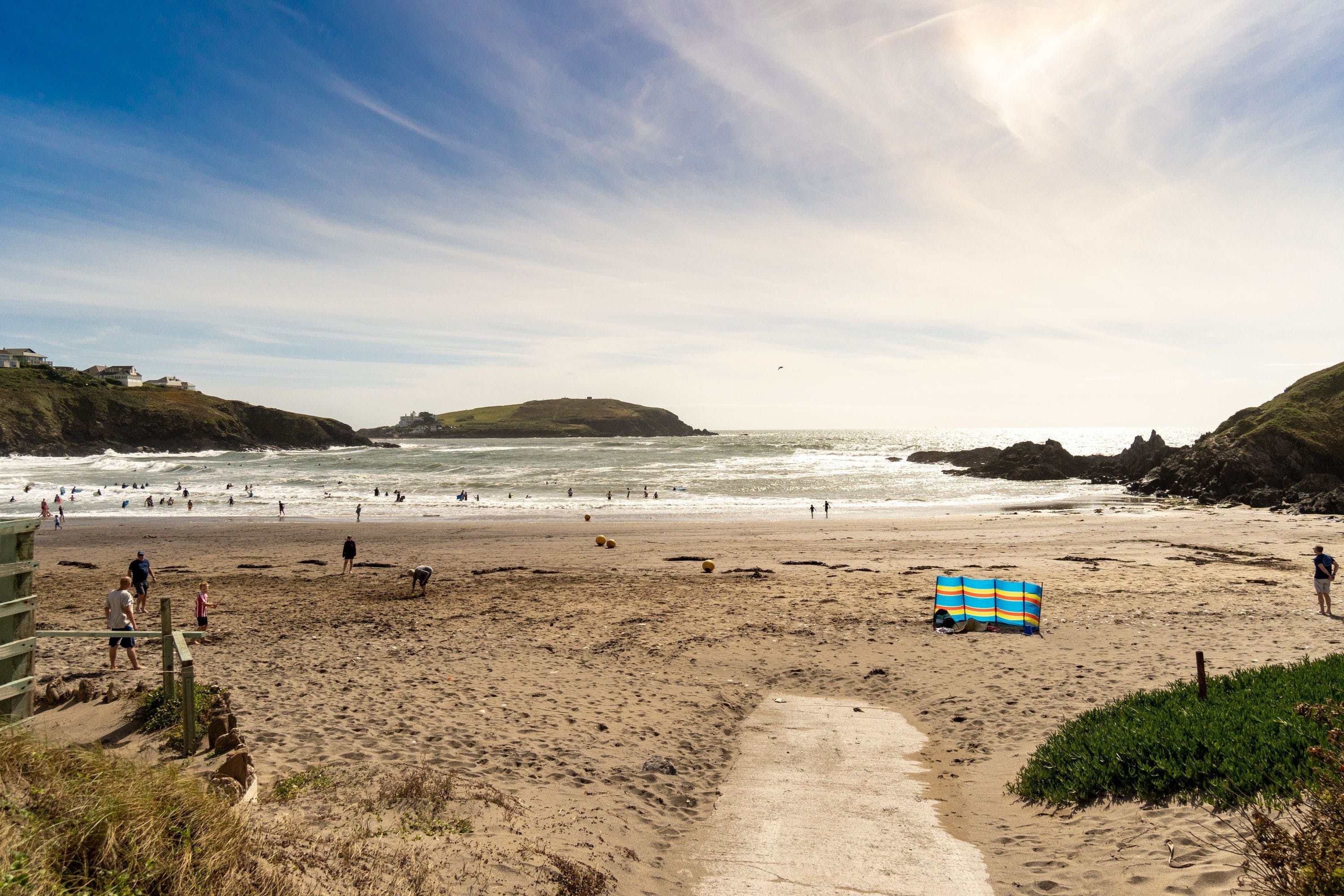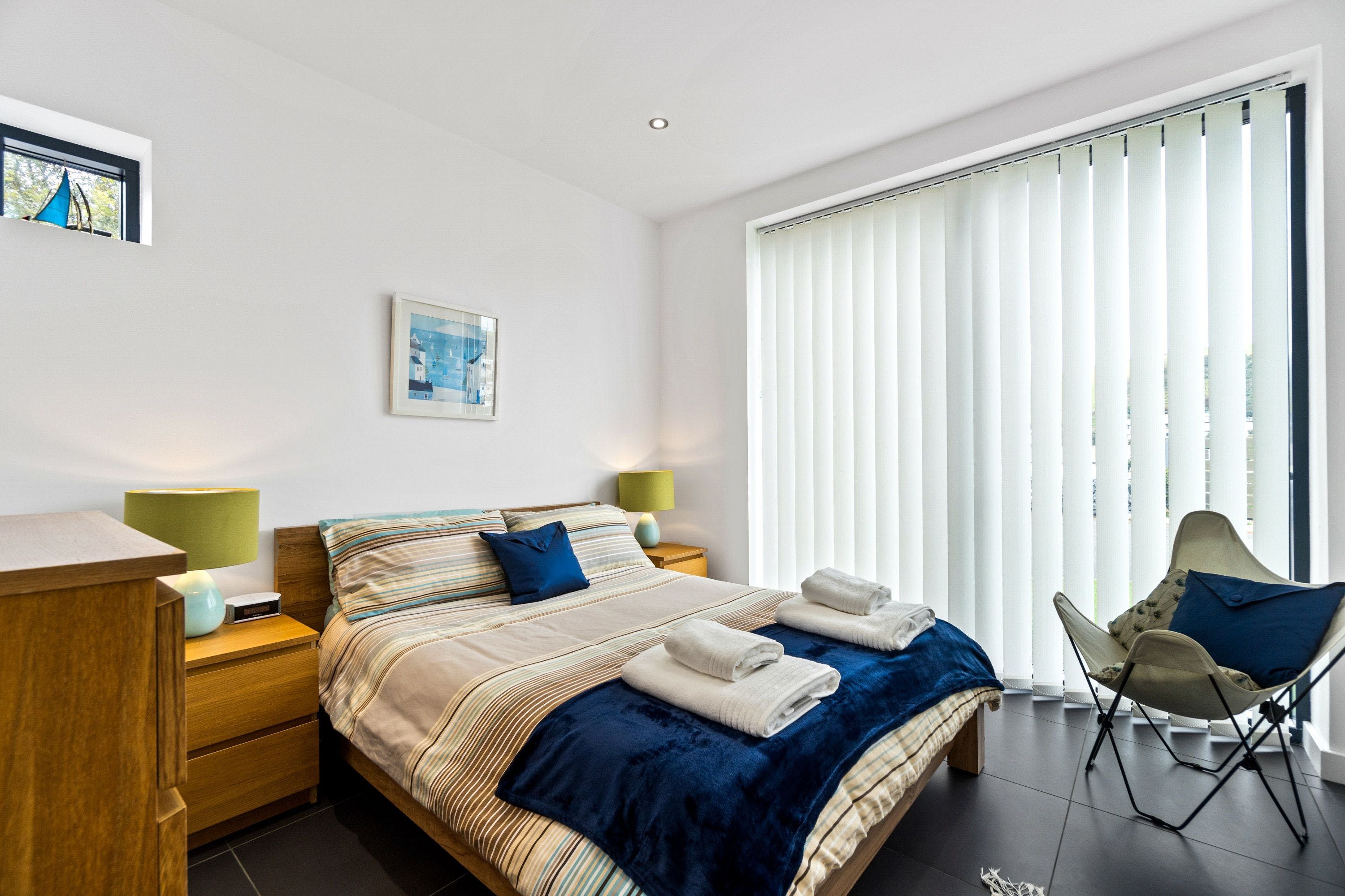 You’ll find this timber-clad, eco-friendly home on Devon’s South Hams coastline, a forty-eight-minute drive from Plymouth and a two-minute walk from Challaborough Bay Beach. Inside the abode, expect an ocean-inspired colour scheme of deep blue, turquoise and aqua. There’s an open-plan living space that’s ideal for socialising – keep glasses topped up as conversation flows in the seating area while your group’s appointed chef cooks up a storm in the sleek kitchen. On sunny days, take your meals out on the terrace or head up to the roof deck and dine with views of the water. Once you’re refuelled and raring to go, grab your beach essentials and take the quick trip to Challaborough’s pebbled shore. Amble along the South West Coast Path for twenty-five minutes to the stunning Ayrmer Cove to find beasties in rock pools and hidden sandy spots. Return home to rinse salty wetsuits in the outdoor shower, then bundle into the snug for a movie marathon and hot cups of cocoa.