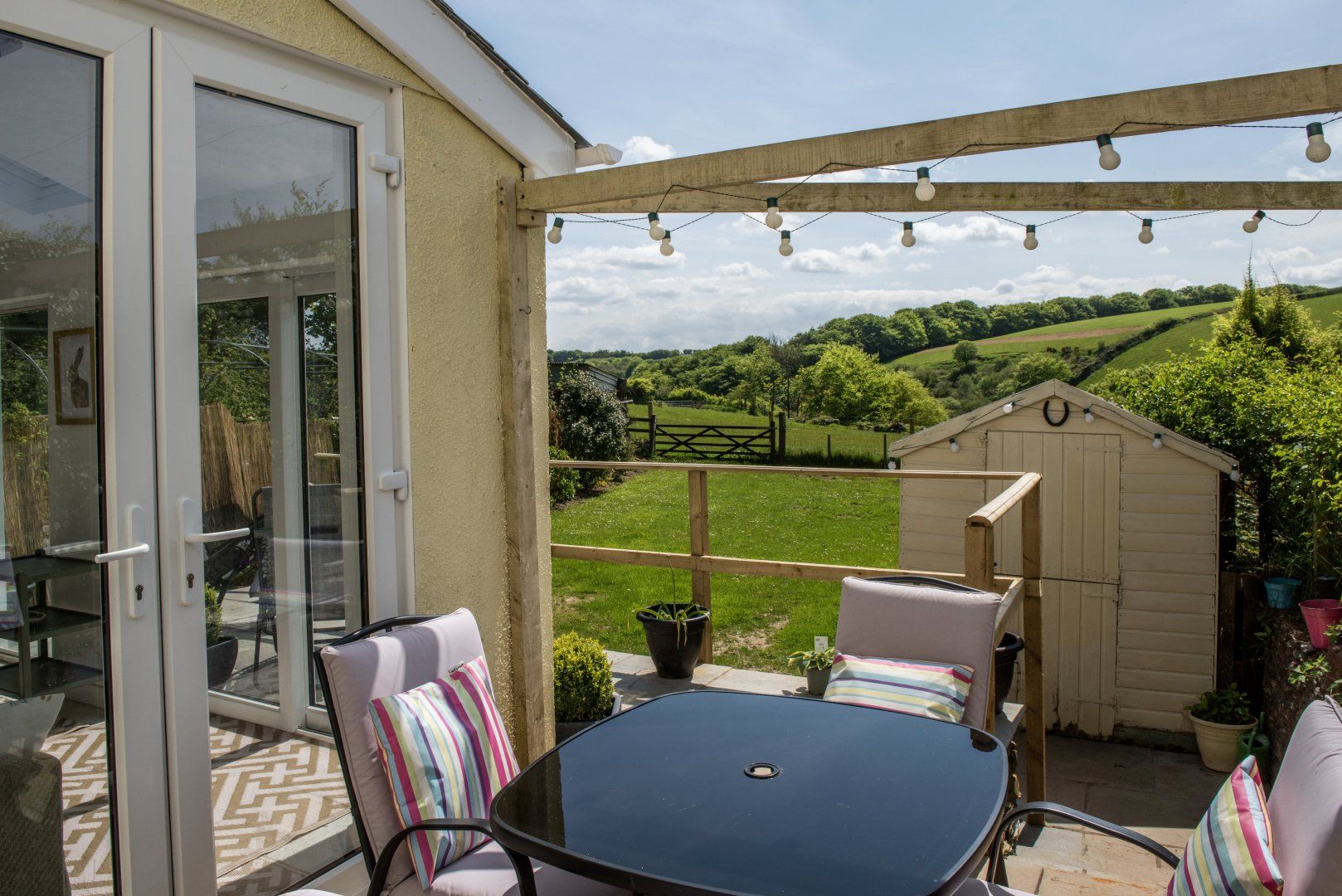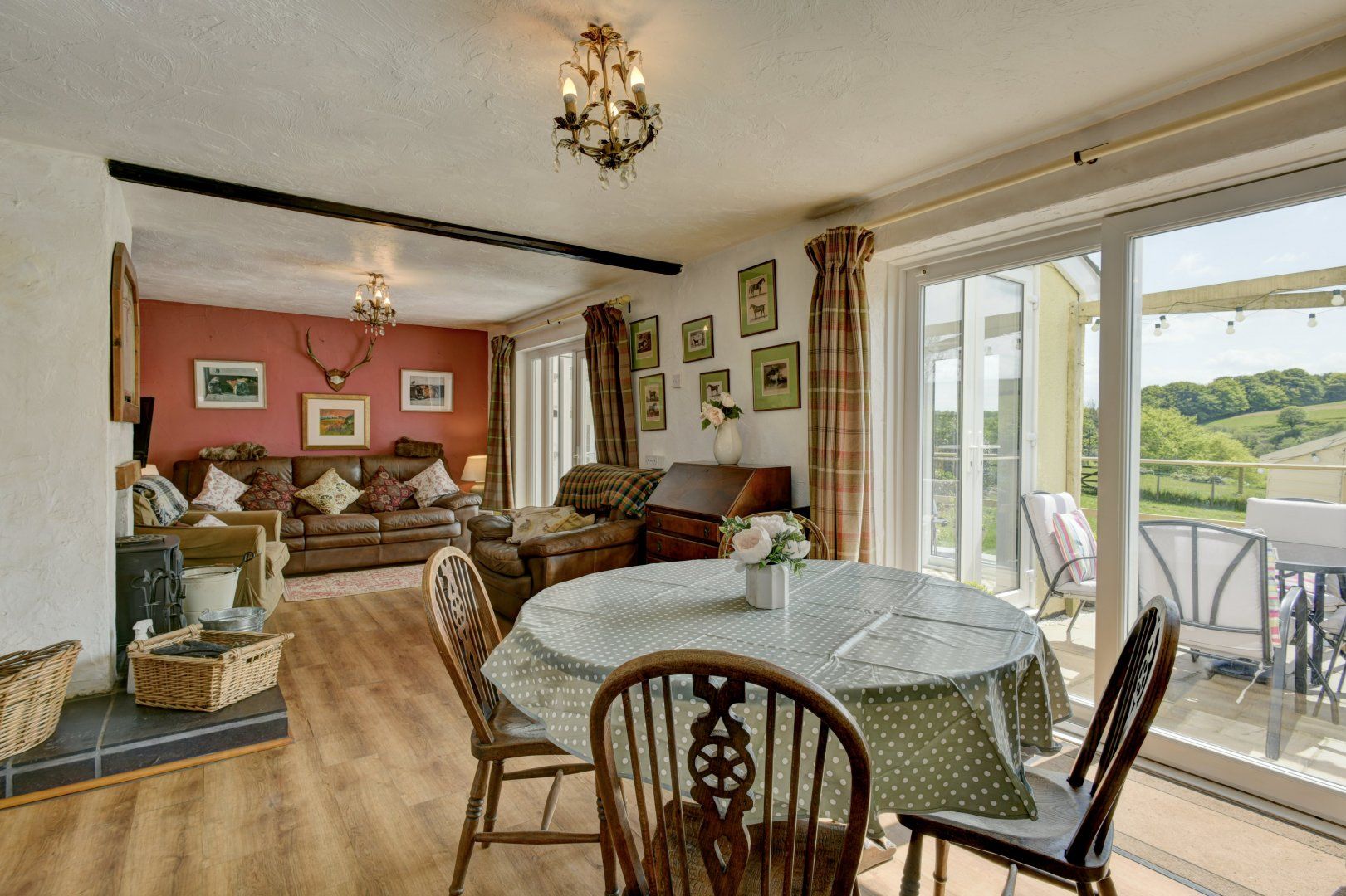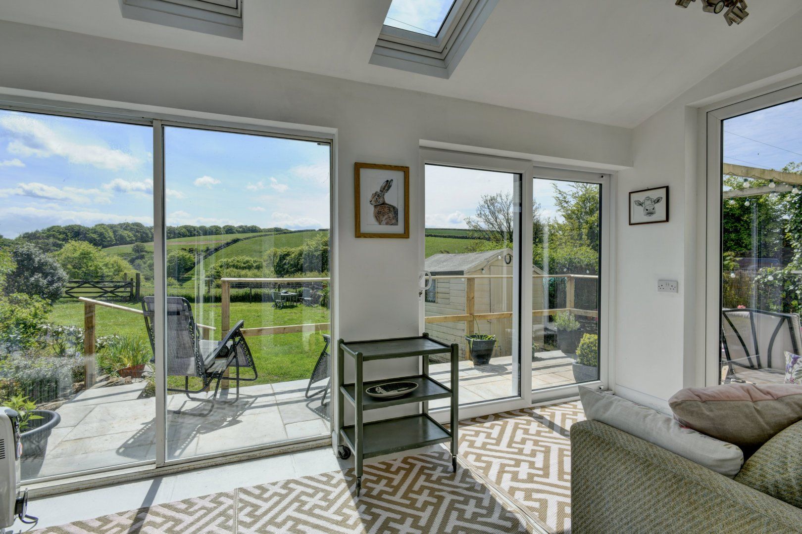 Inside the front door is a small entrance porch ideal for drying coats and muddy boots. The kitchen is to your left as you enter, and the open-plan sitting room and dining area to the right. There is a cloakroom with WC downstairs. French doors lead from the sitting room to the sun-room that makes the most of the chance to sit and enjoy the lovely view over the combe beyond the garden. A sliding door gives access to a patio that is also reached by french doors at the West end and another sliding door from the dining area.