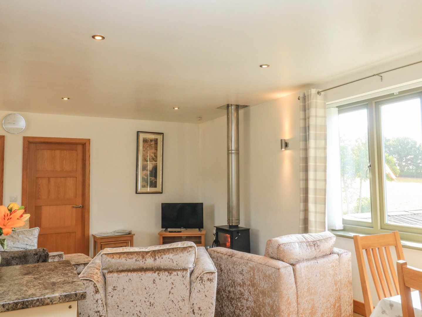 Accomodation Details First-floor annex. Two bedrooms: 1 x double, 1 x twin. Shower room with walk-in shower, basin, heated towel rail, and WC. Open-plan living space with kitchen and an air-fryer, dining area and sitting area with woodburning stove