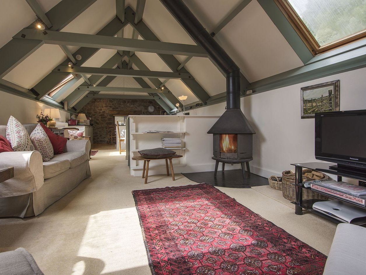 Two bedrooms: 1 x king size double, 1 x twin. Bathroom with bath, shower over bath, WC and basin. Upstairs open-plan living/dining/kitchen with wood burning stove. Downstairs hall.