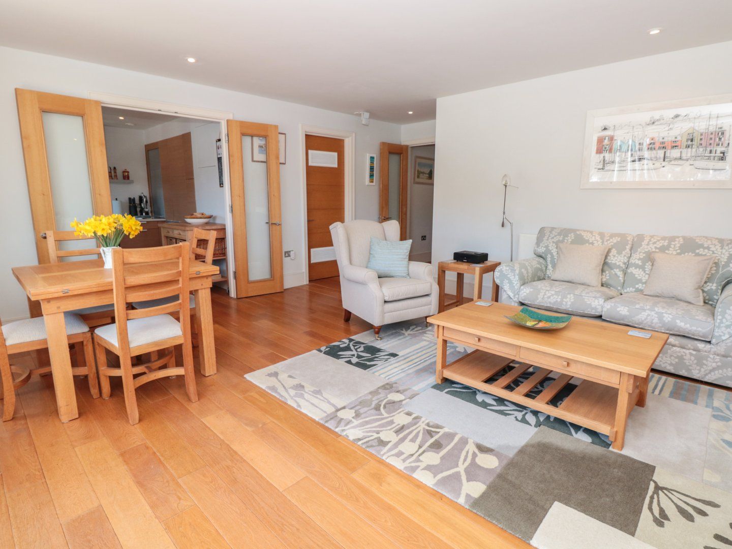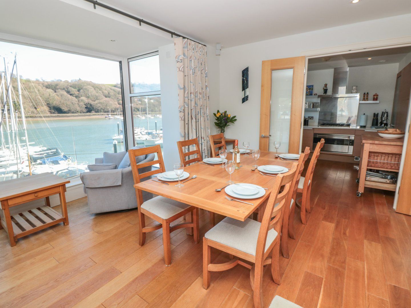 Accomodation Details First-floor apartment. Three bedrooms: 1 x super-king-size with TV and en-suite bathroom with bath, separate shower cubicle, basin, heated towel rail and WC, 1 x super-king-size, 1 x super-king-size (can be a twin upon request) with TV. Bathroom with bath, shower over, basin, heated towel rail and WC. Open-plan living space with kitchen, dining area and sitting area, Utility cupboard with washing machine and tumble dryer.