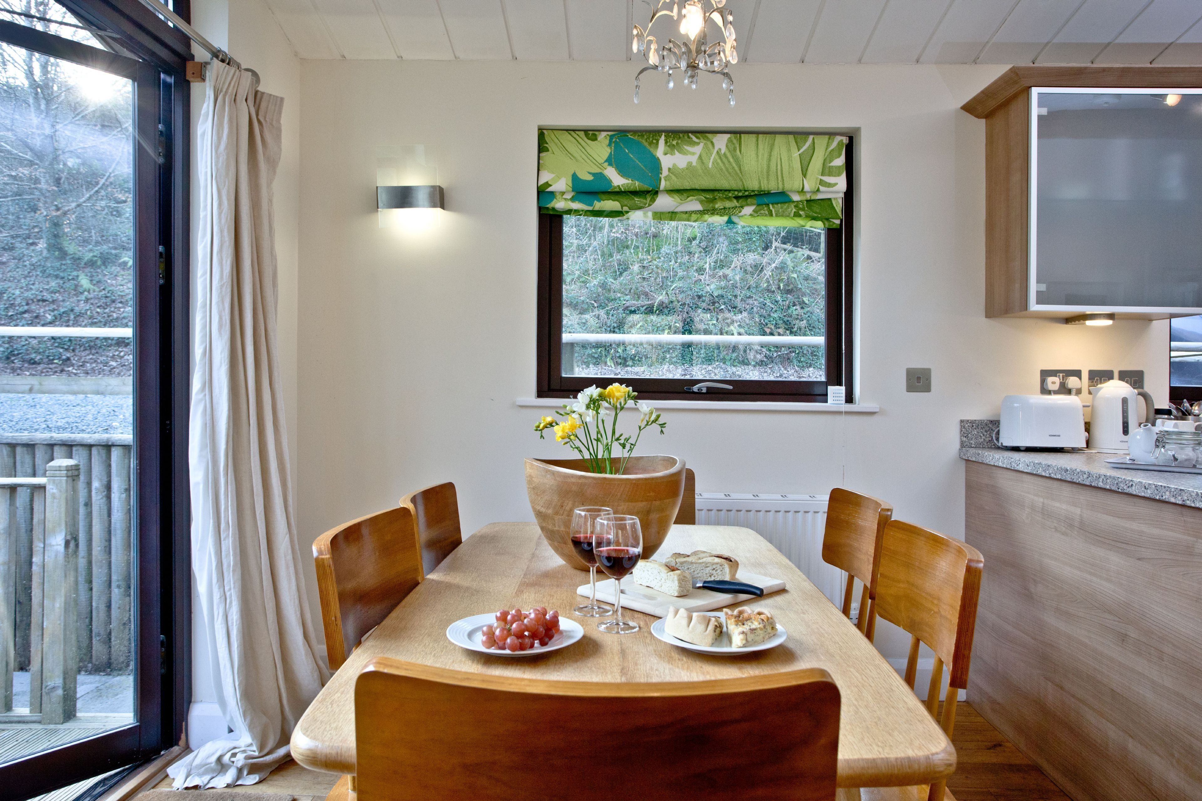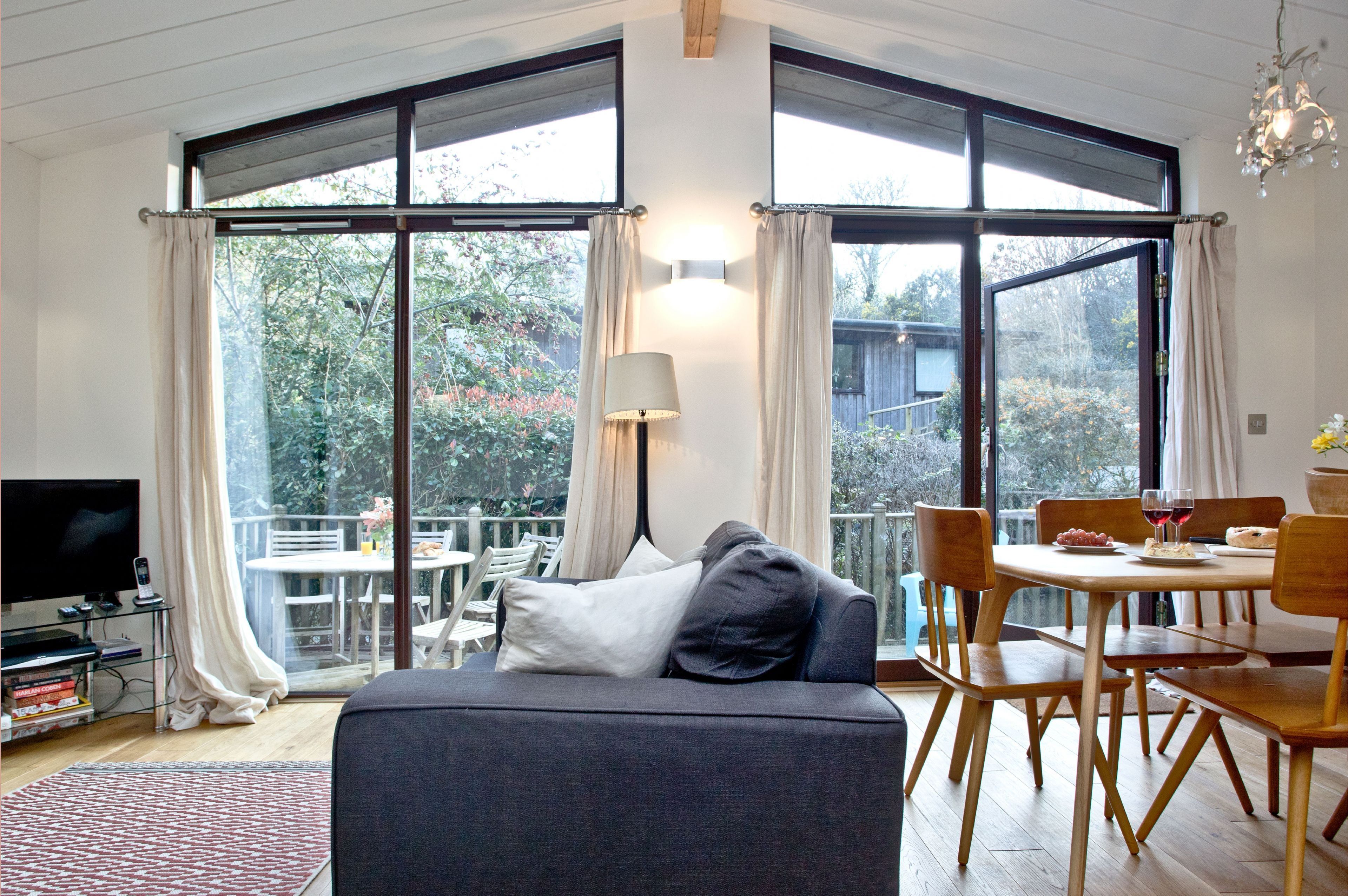Open plan with the kitchen and dining area with access to the decked terrace. Two sofas with seating or five and a Flatscreen TV with Freeview.Kitchen