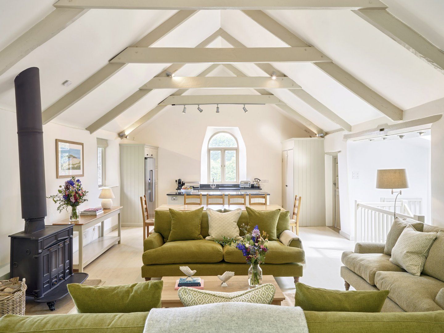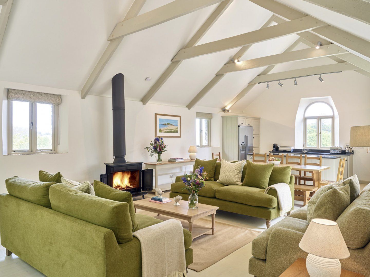 Accomodation Details Four bedrooms: 1 x super-king-size with en-suite shower, basin and WC, 1 x double with en-suite shower, basin and WC, 1 x twin (2'6" beds) and 1 x L-shaped cabin bunk beds for under 12s. Bathroom with bath, shower over, basin and WC. Open-plan living room with kitchen, dining area and sitting area with woodburning stove