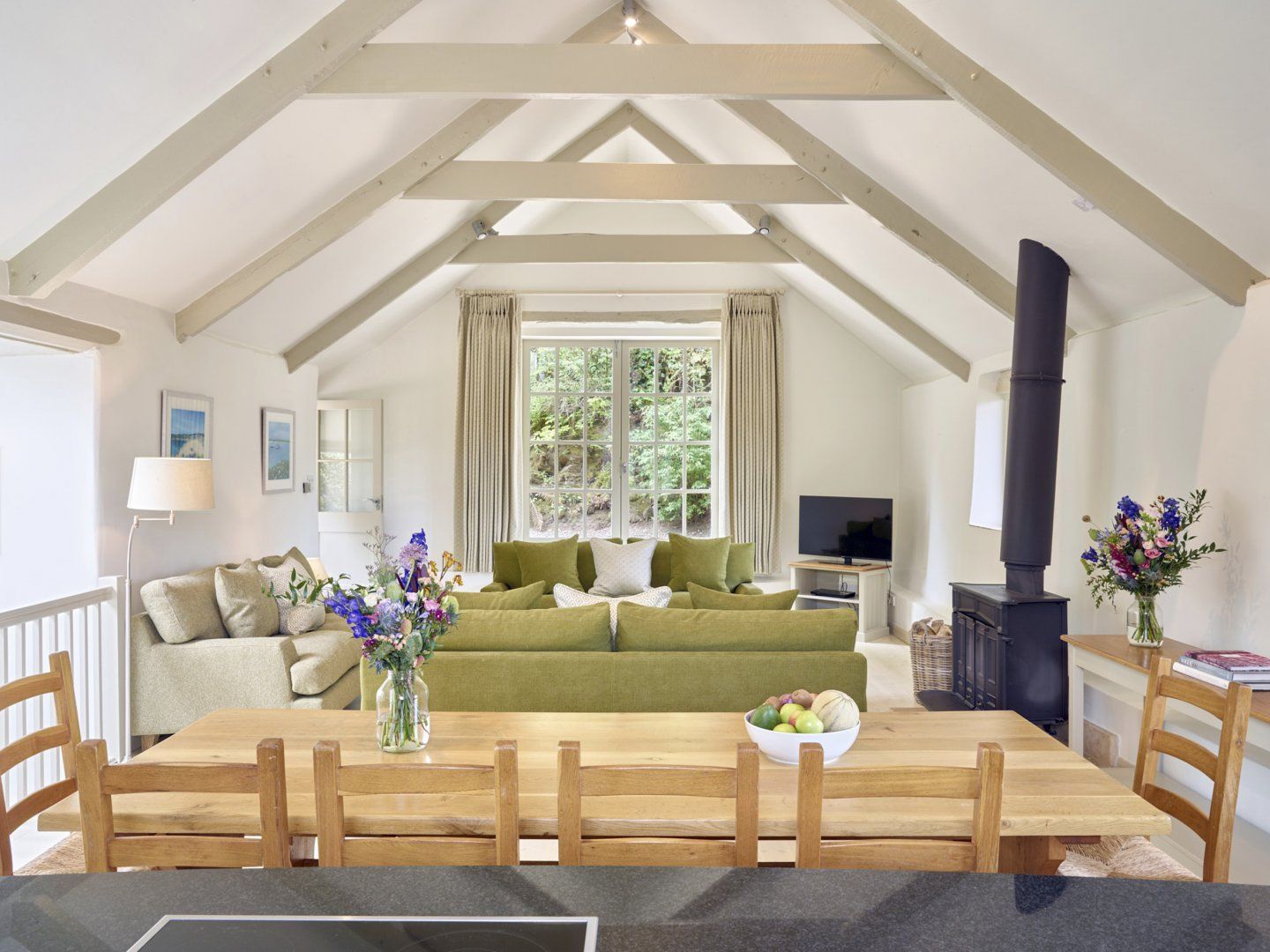 Holiday home Garden House is a lovely detached cottage nestled in Cornworthy, Devon. Hosting four bedrooms; one super-king-size with en-suite shower room, one double with en-suite shower room and two twins, sleeping a total of eight guests and a family bathroom. It has an open-plan living room with a kitchen, dining area and sitting area with a woodburning stove. Outside provides an enclosed patio terrace area with furniture and a decking area with ample off-road parking nearby. Garden House is a wonderful choice for a seaside break to the heart of Devonshire countryside.