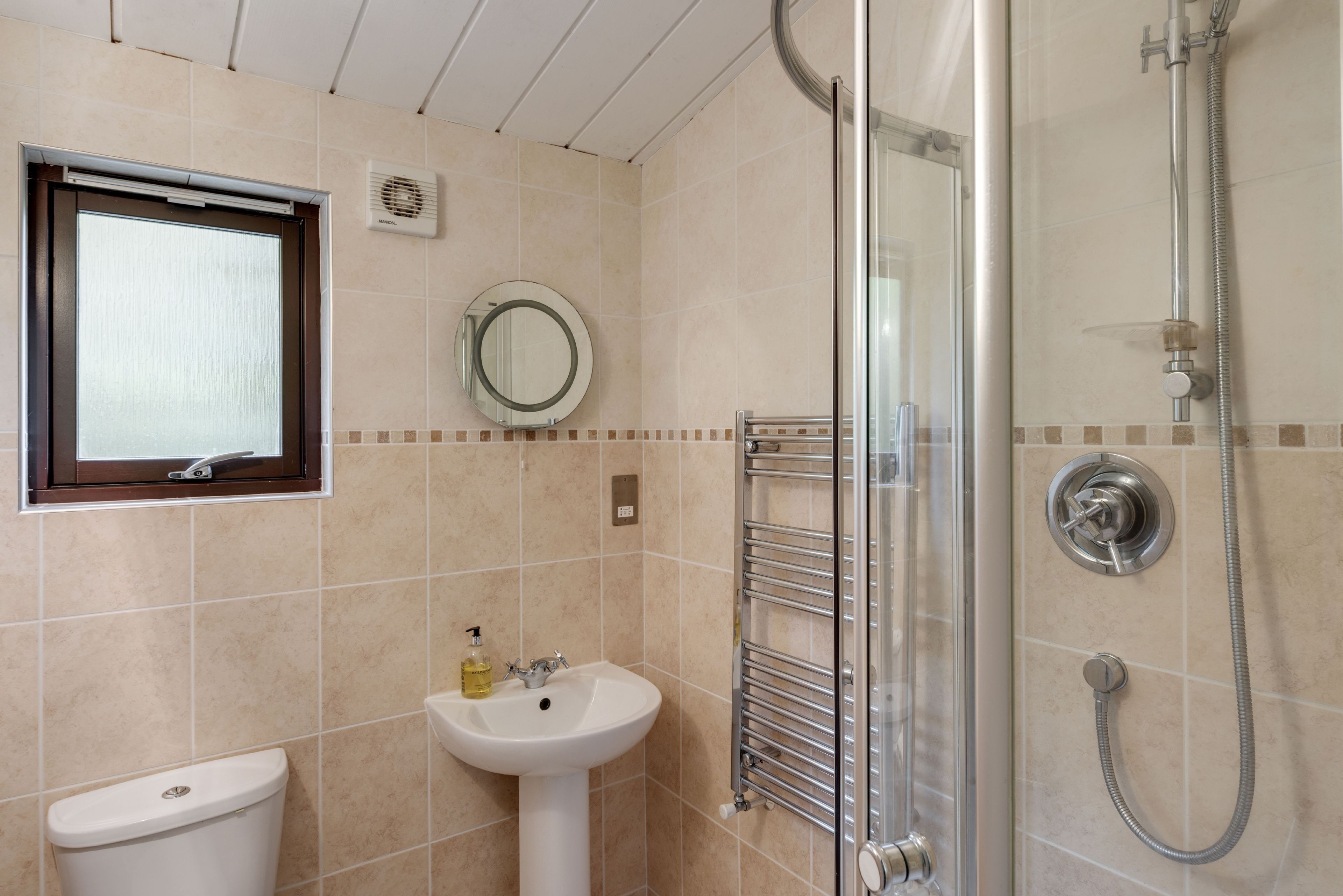 Bath with overhead shower, wash basin, WC and heated towel rail.Bathroom Two