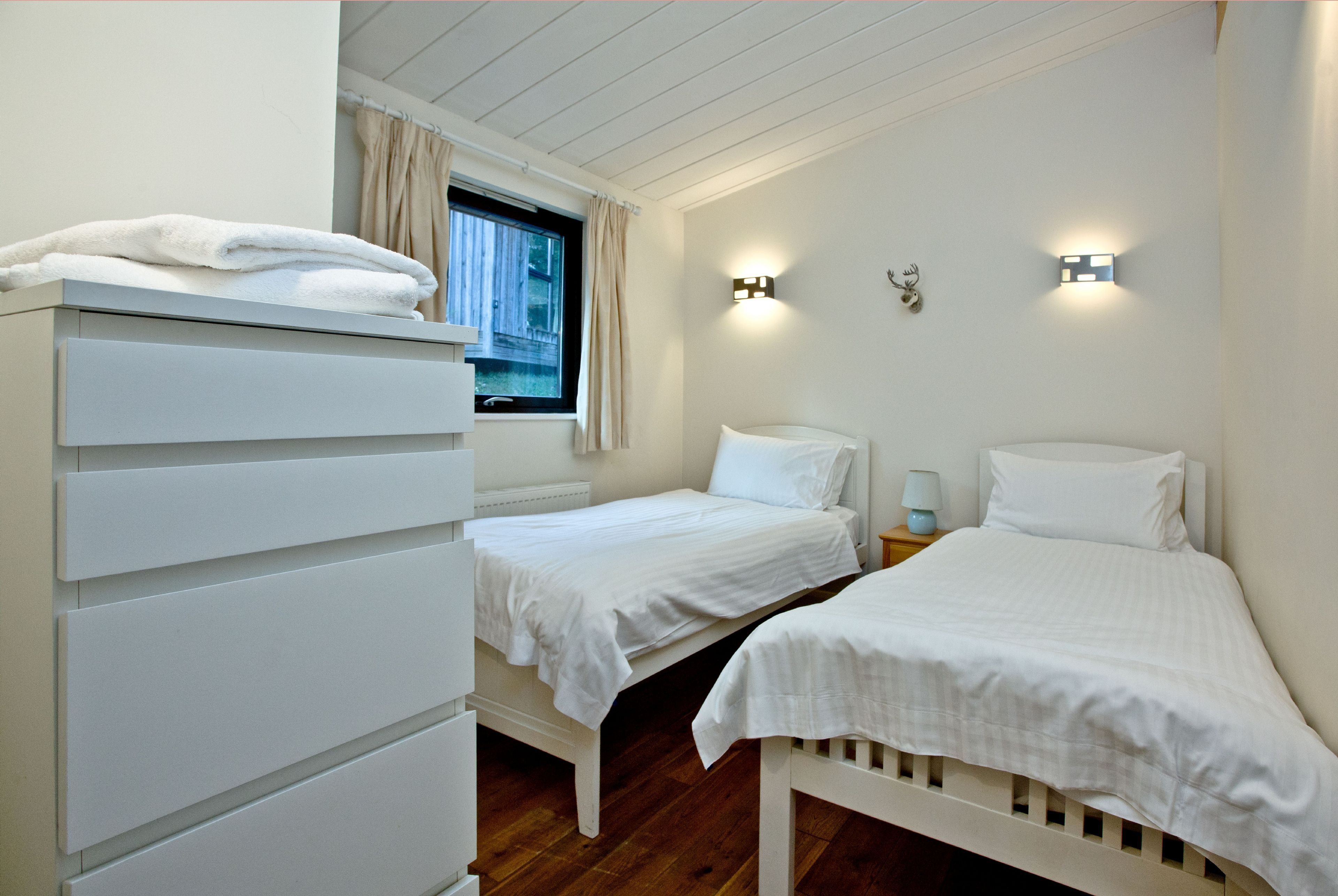 Twin beds, wardrobe and chest of drawers.Family Bathroom