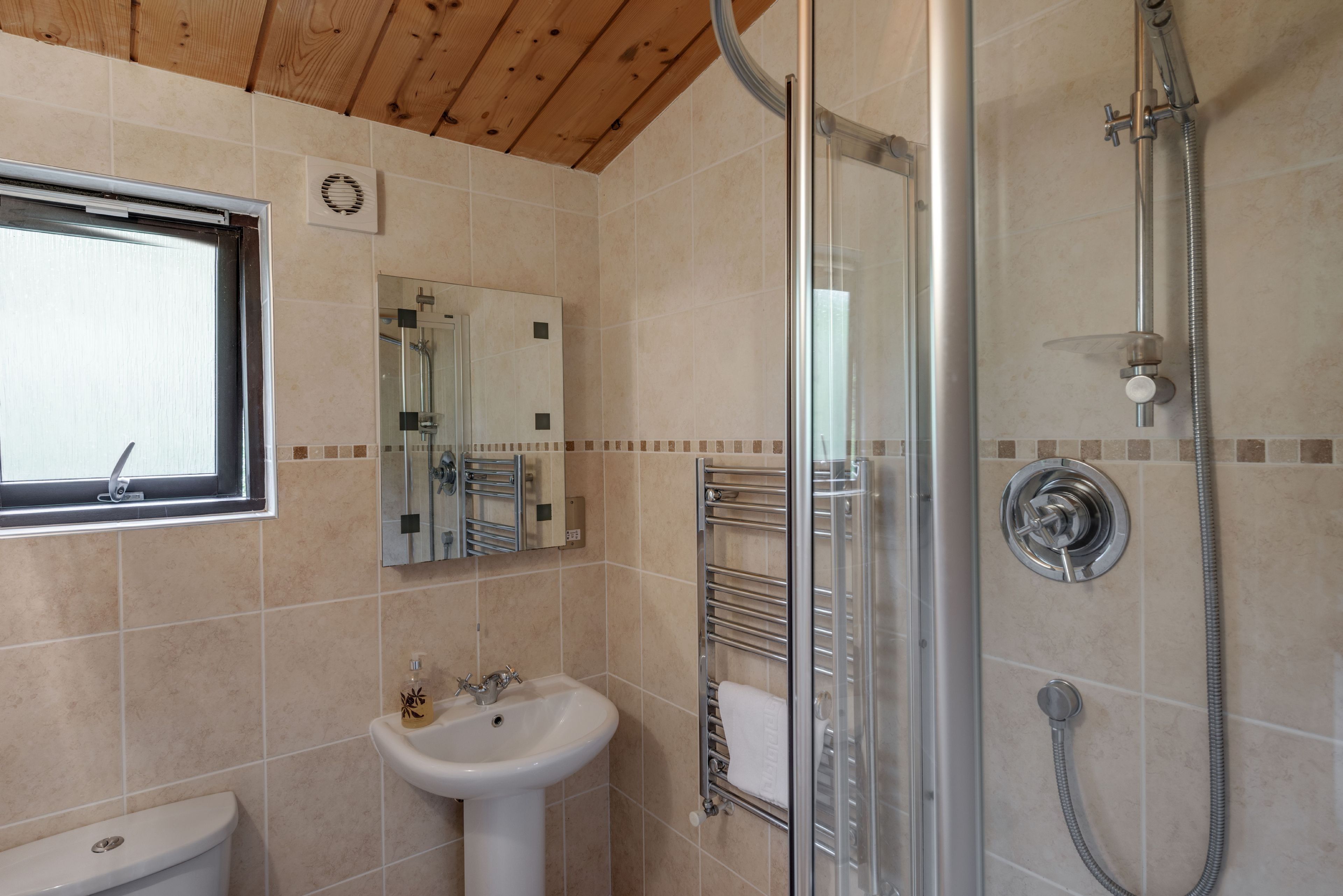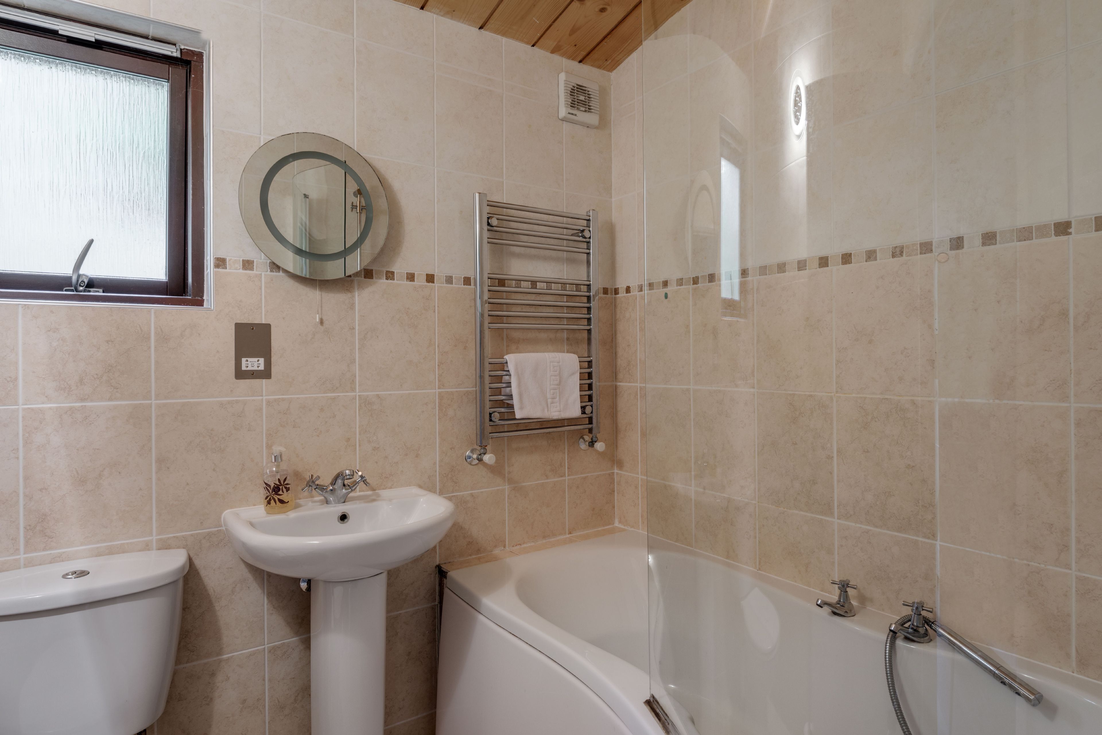 Bath with overhead shower, wash basin, WC and heated towel rail.Bathroom Two