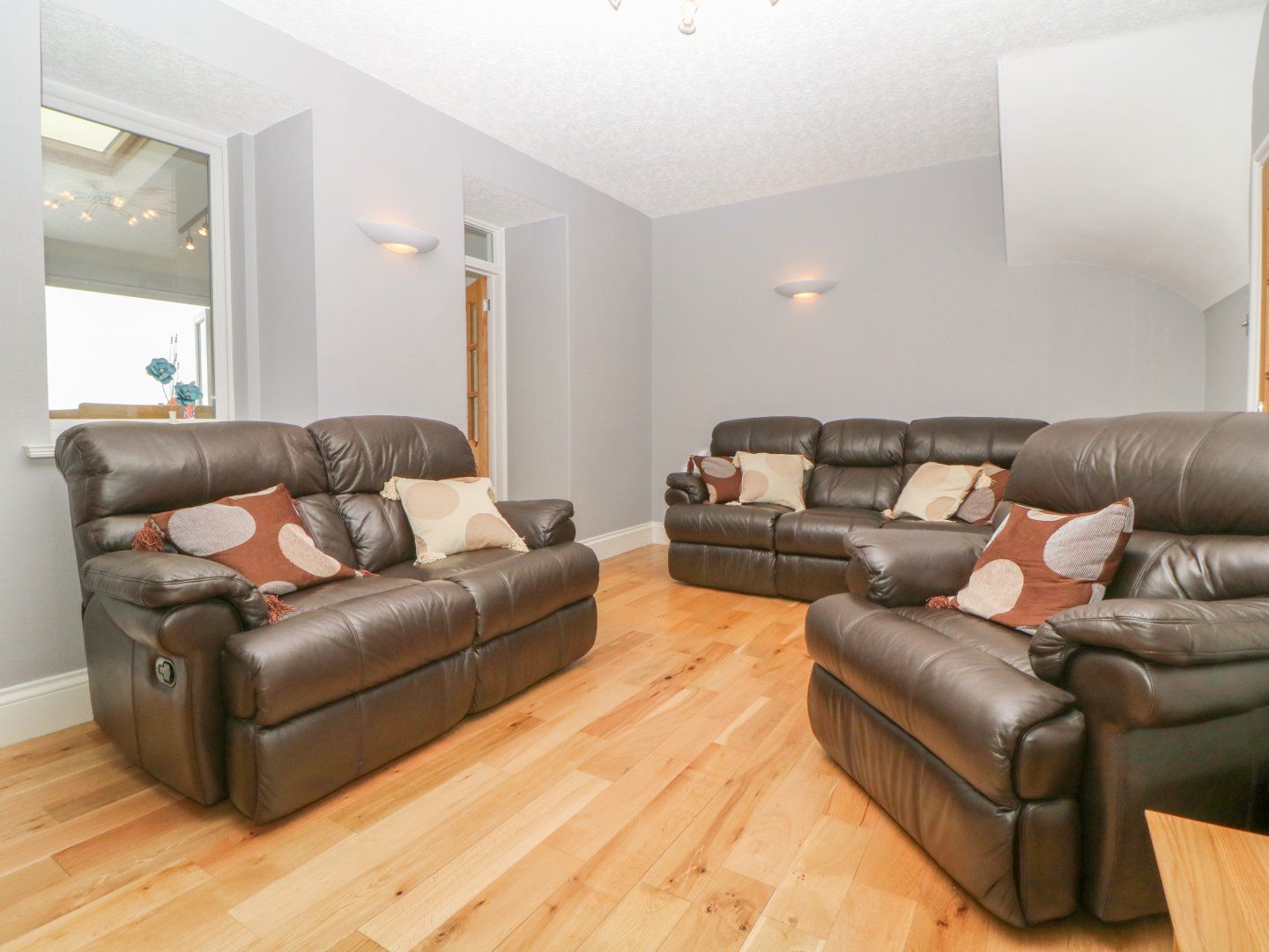 Three bedrooms: 1 x double with TV, 1 x 4-foot double with TV, 1 x 4-foot double to sleep 1 adult or 2 small children. Shower room with jet shower, basin, and WC. External shower room with shower, basin, and WC. Kitchen. Dining room/conservatory. Sitting room with electric pebble fire