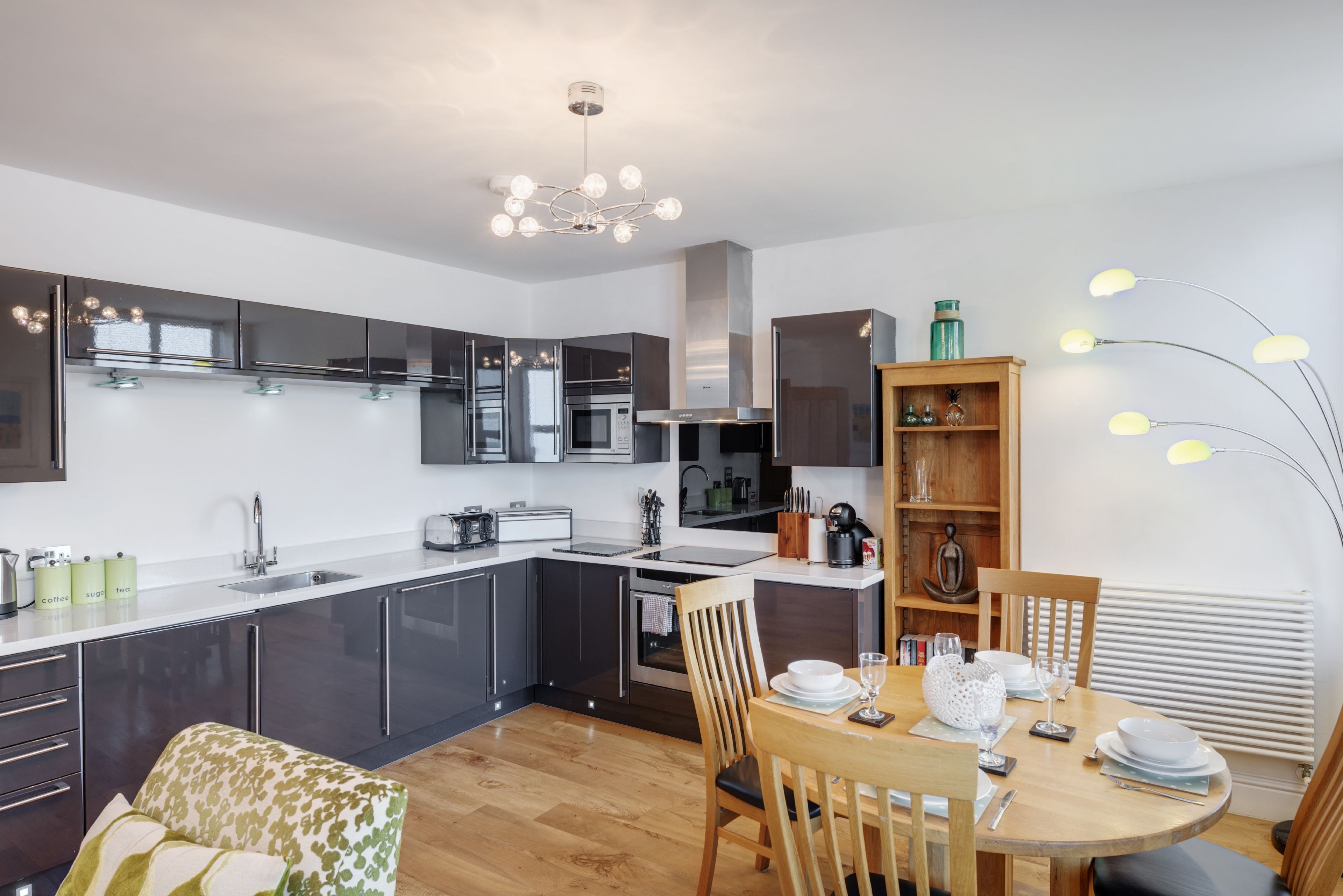 Electric oven and grill, halogen hob, washer dryer, dishwasher, fridge with freezer compartment, toaster, kettle, microwave and coffee machine