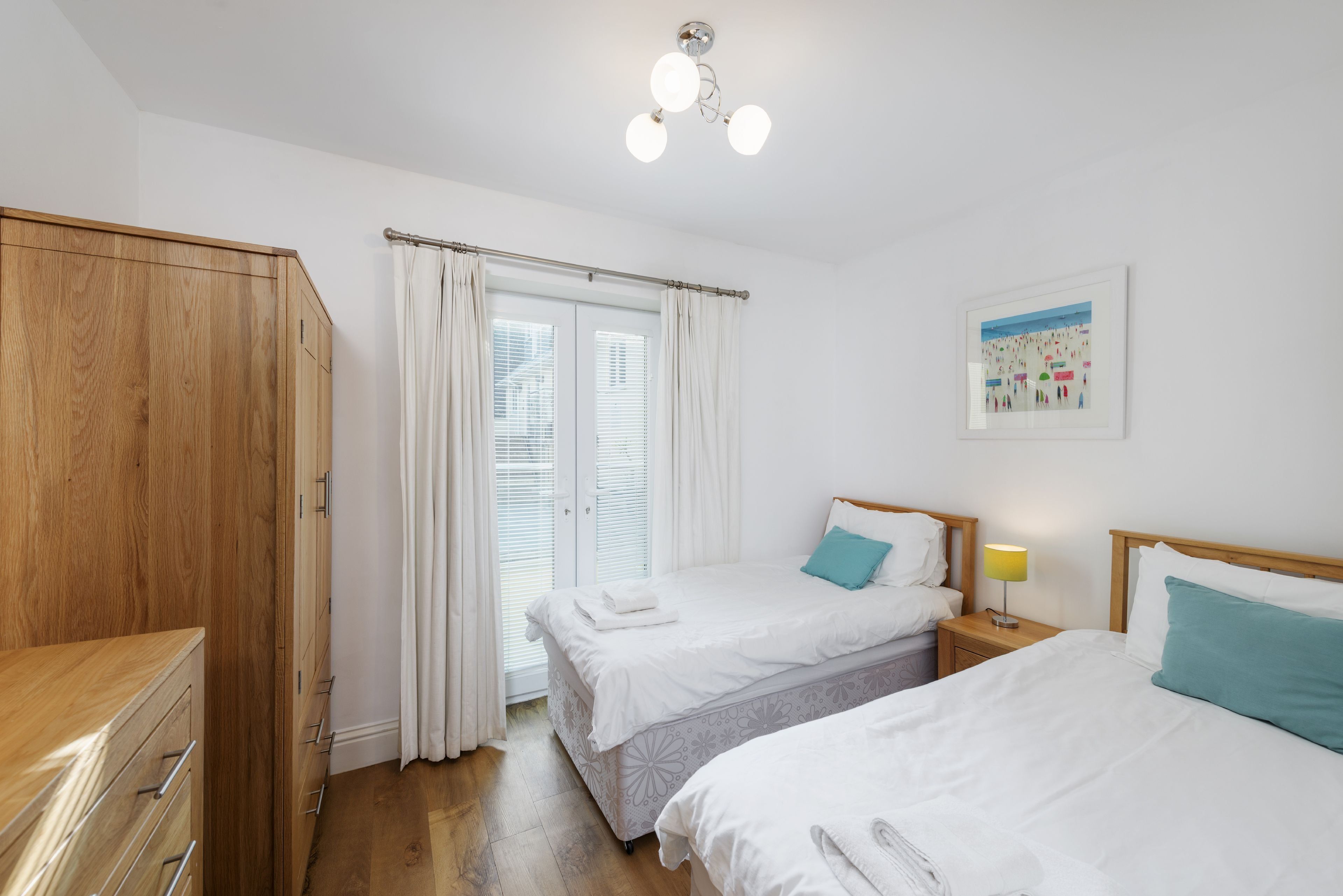 Juliet balcony, twin beds, two bedside tables with lamps, wardrobe and chest of drawers