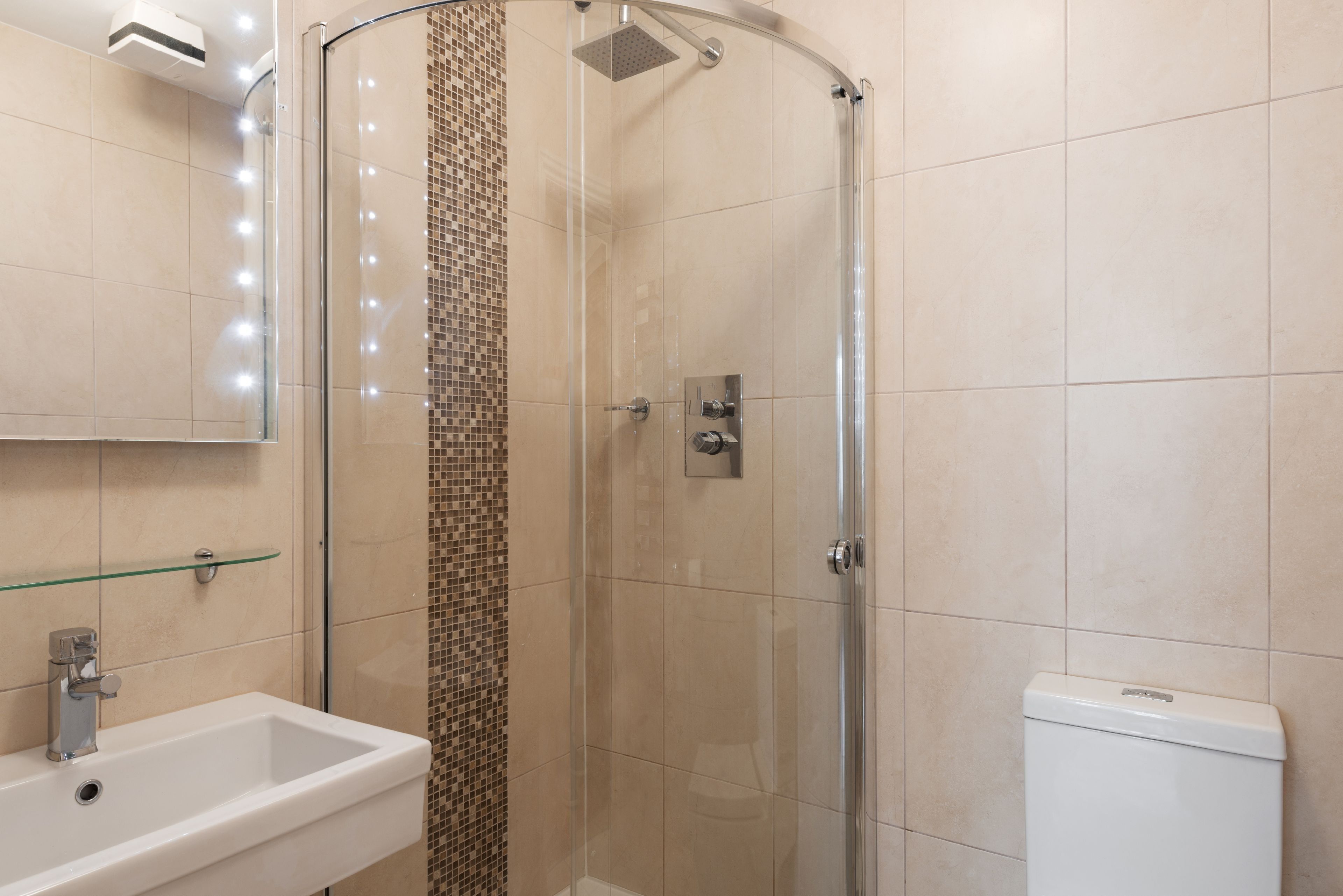 Shower cubicle, wash basin, WC, heated towel rail and shaver point