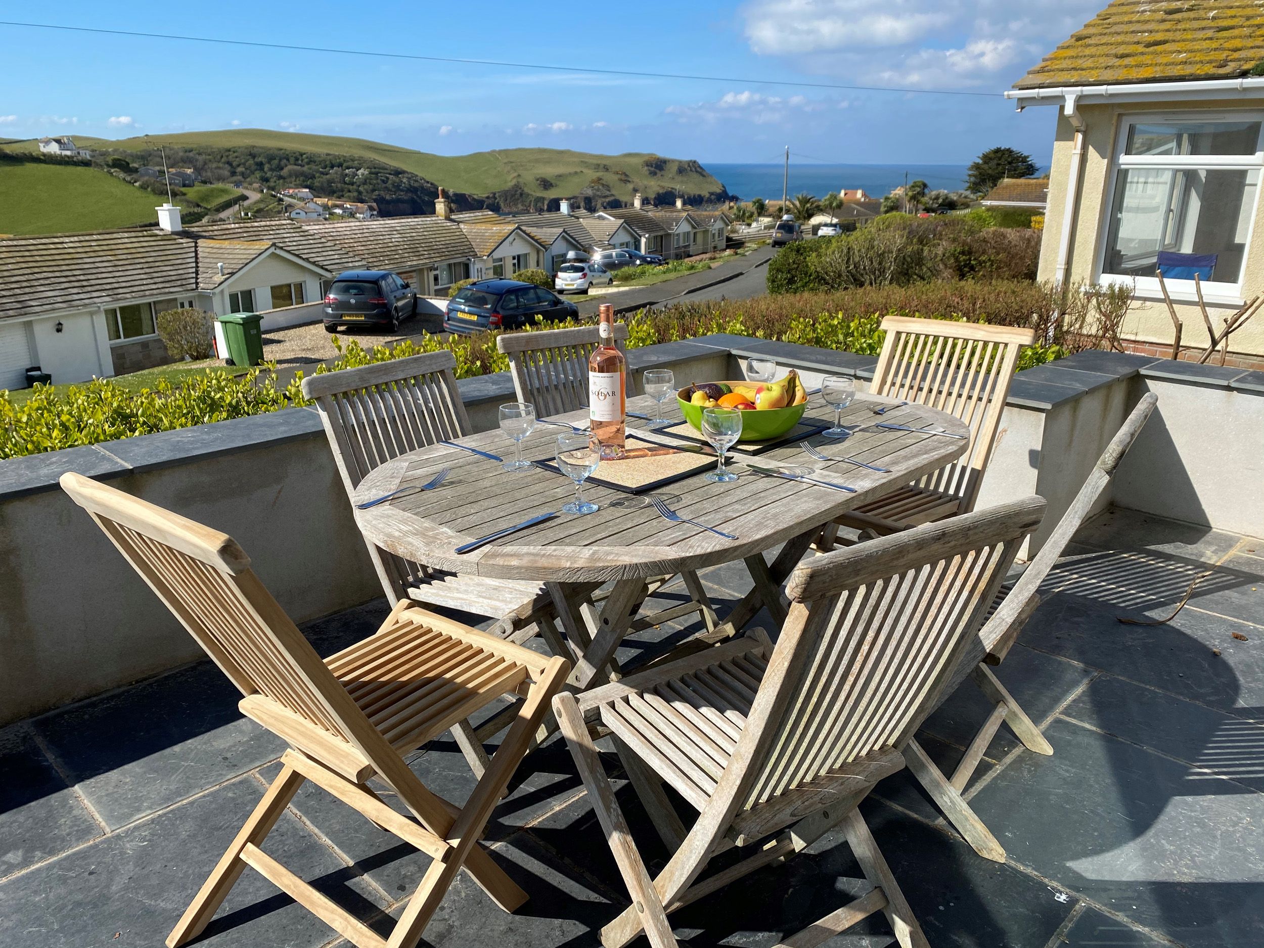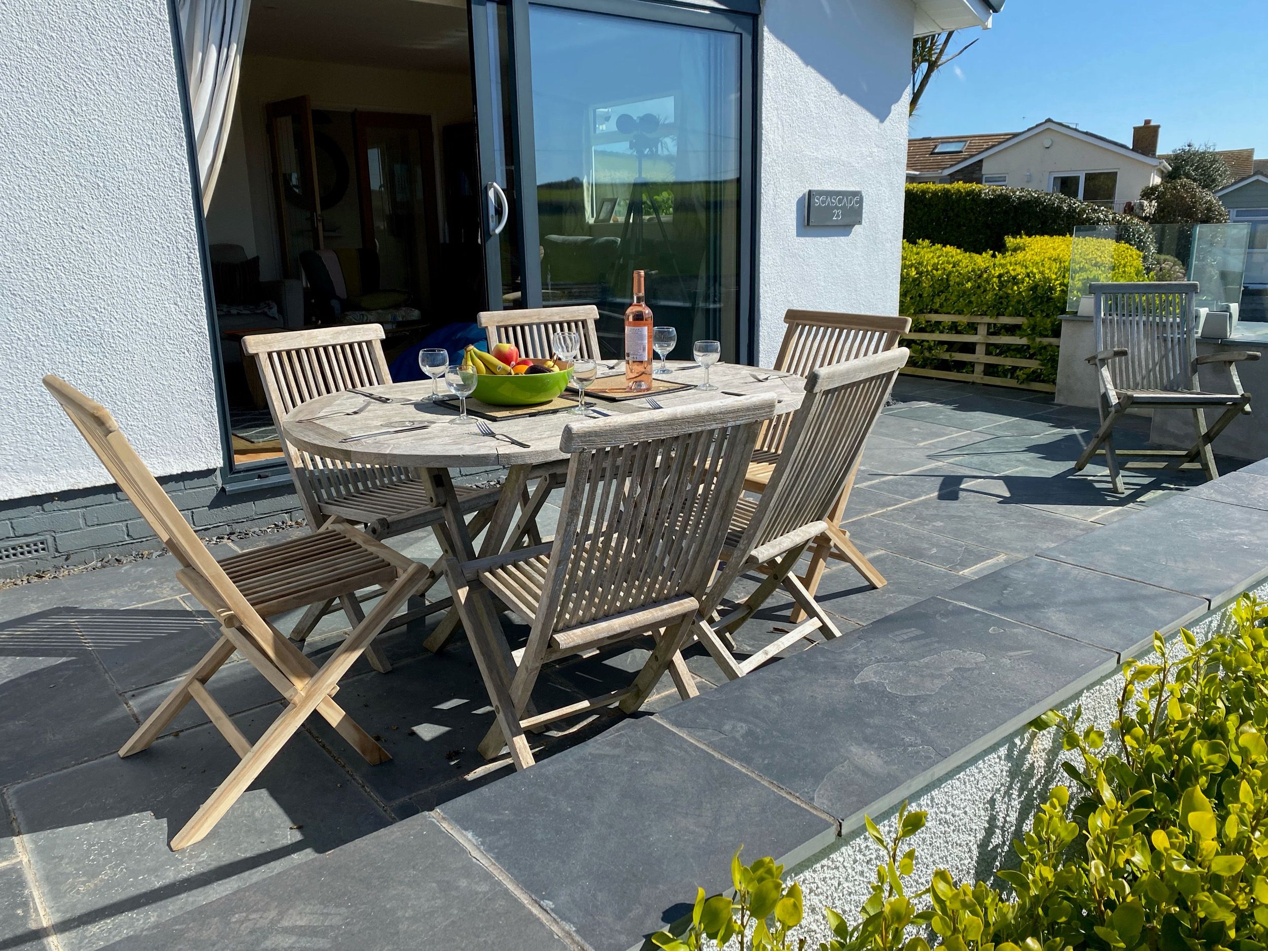 Sun-terrace with seaviews, outside dining furniture and sunloungers to front. Small private garden to rear, garden furniture and barbeque.