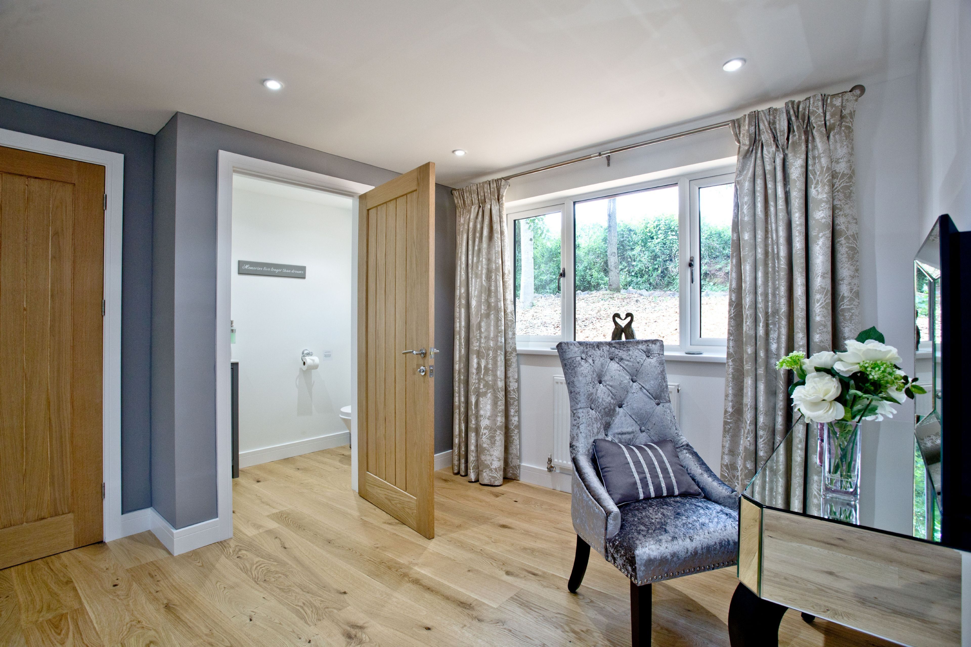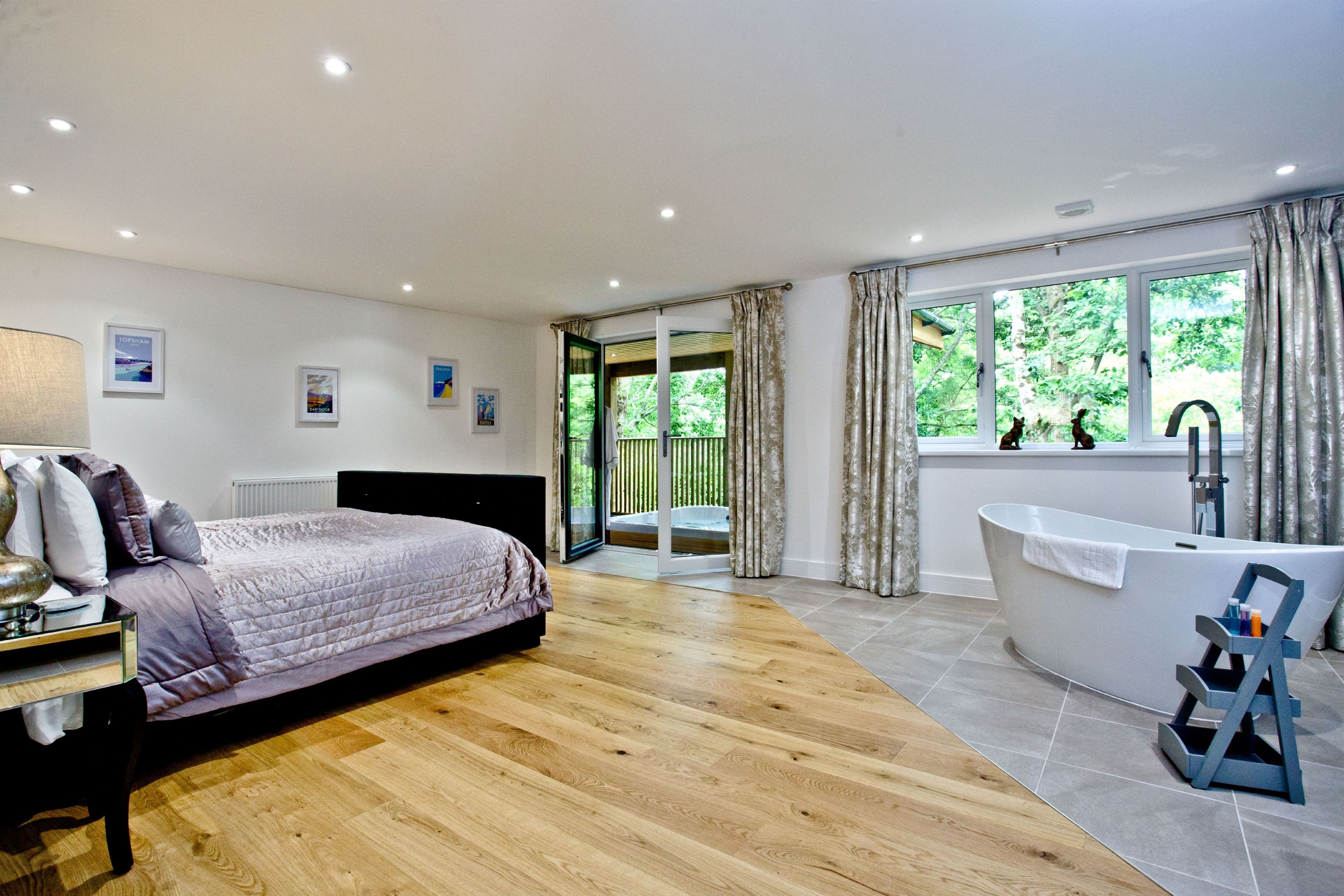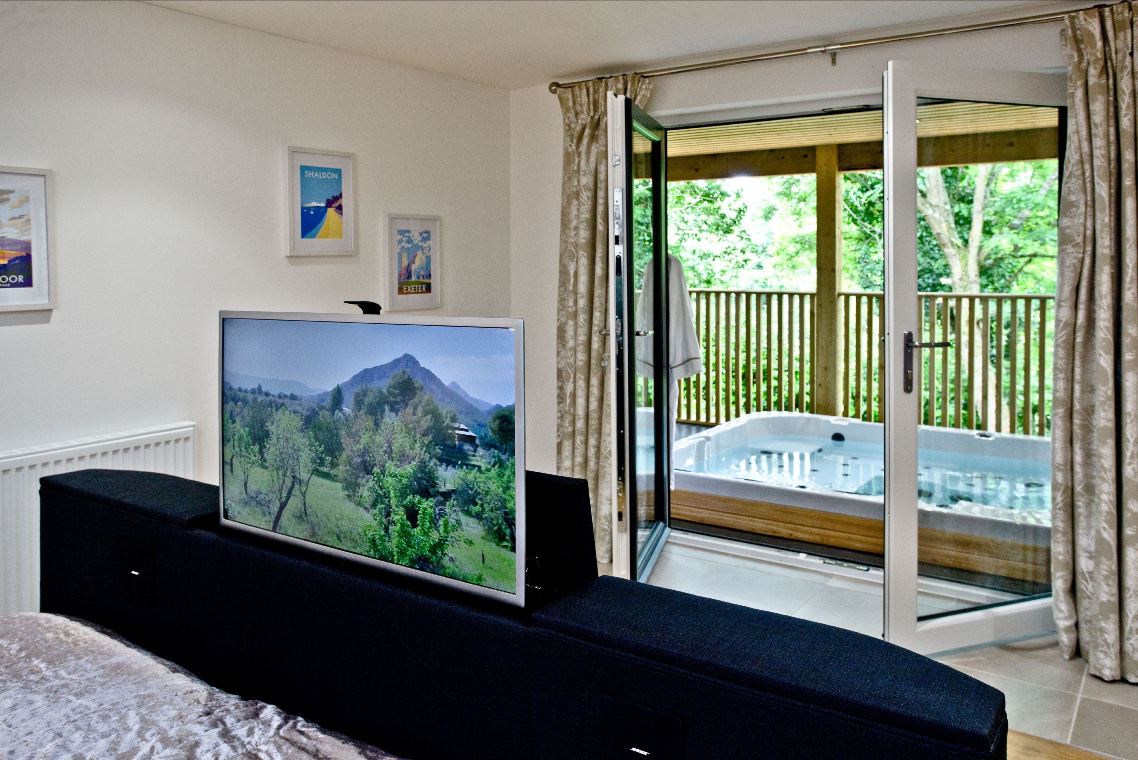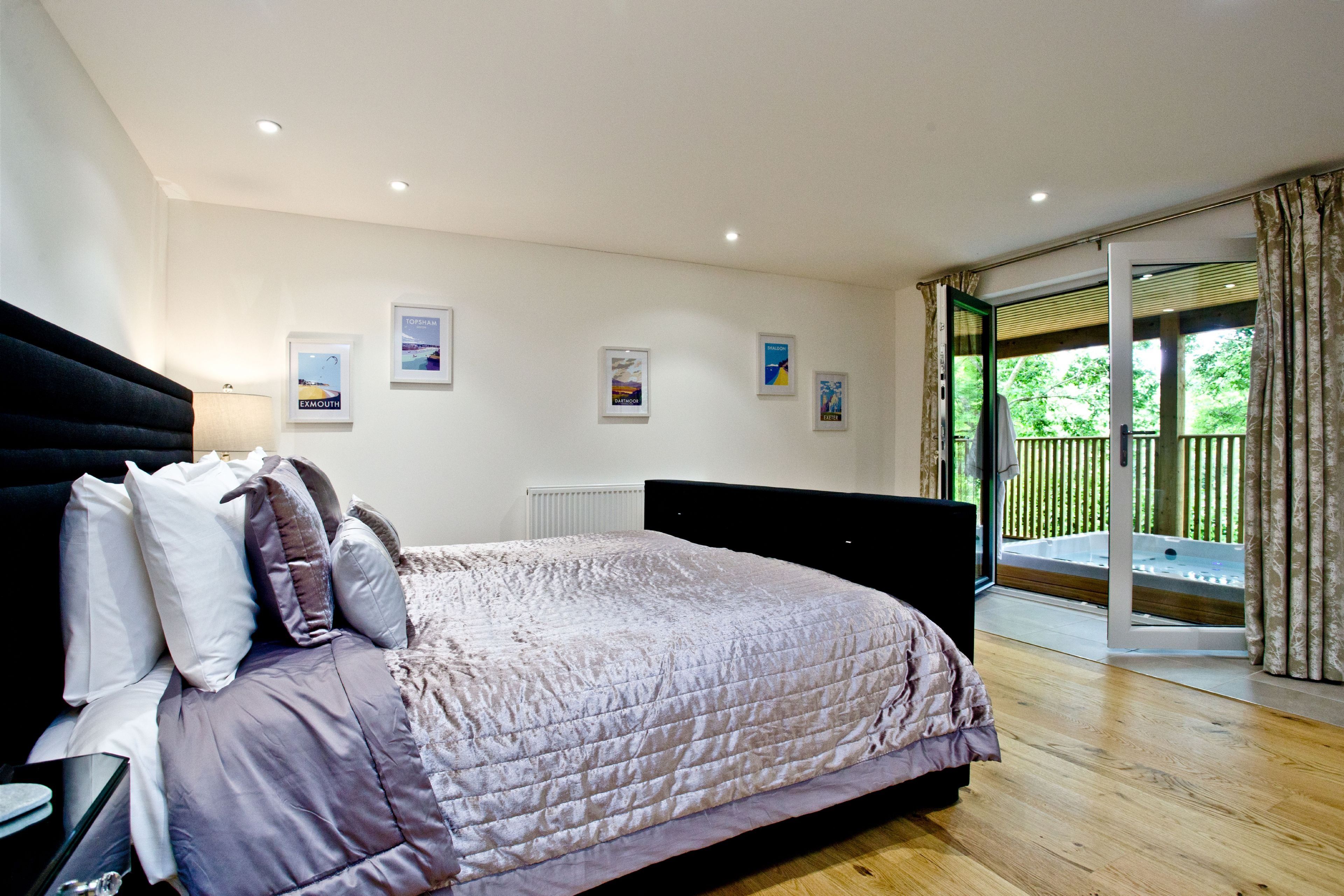 Master BedroomSuper king size bed, dressing room and access to the balcony with private hot tub through patio doors. Flatscreen TV at the end of the bed. En suite.