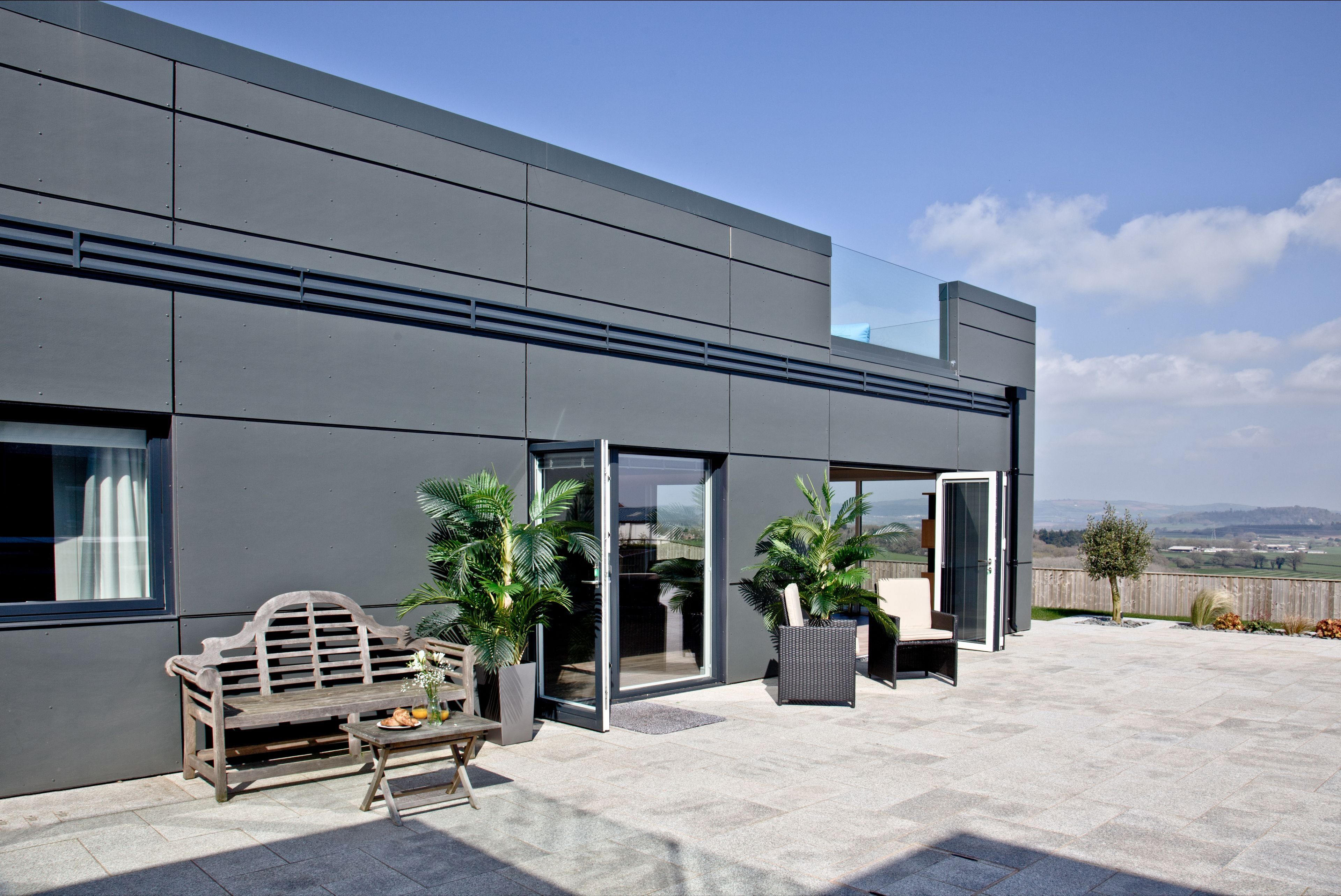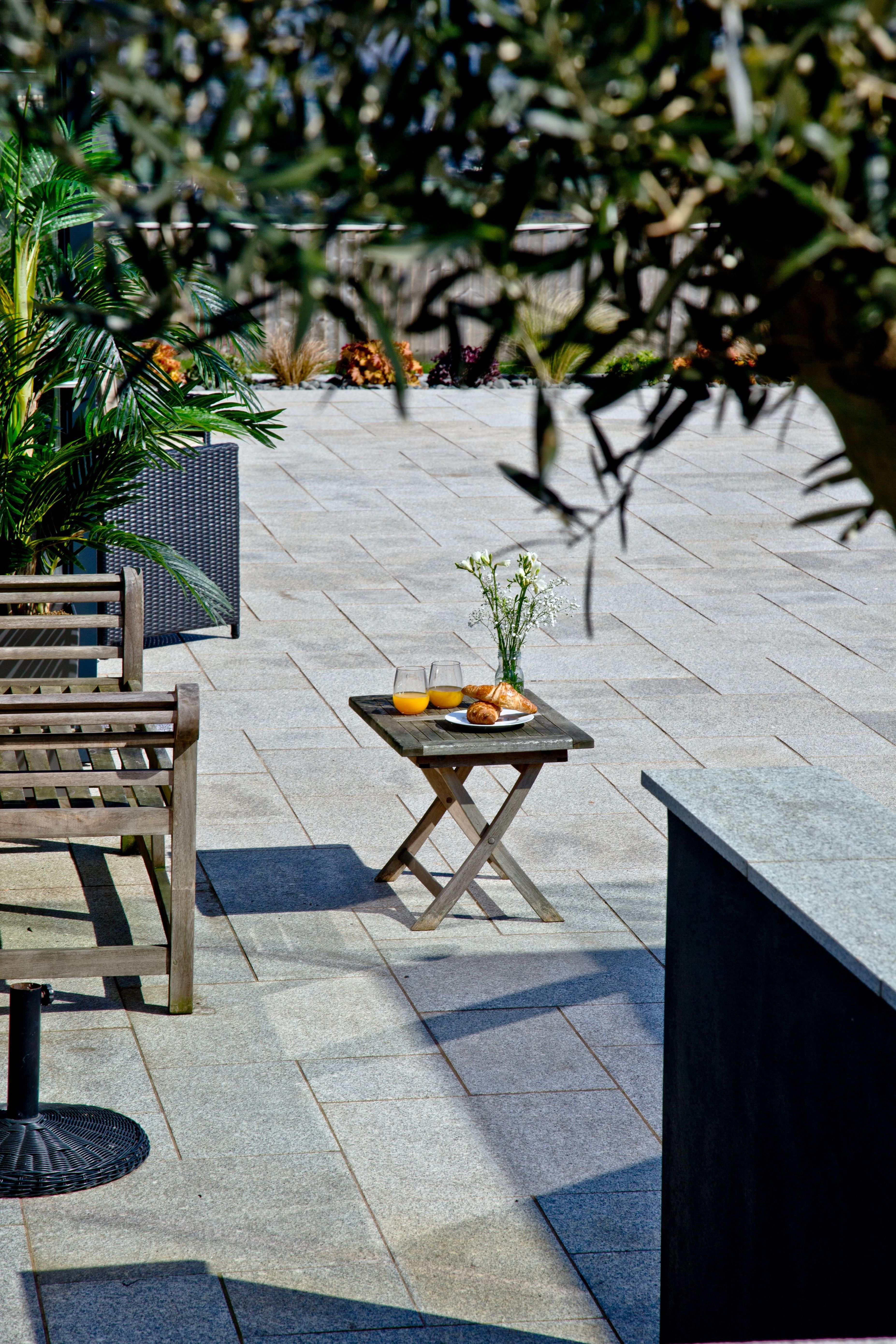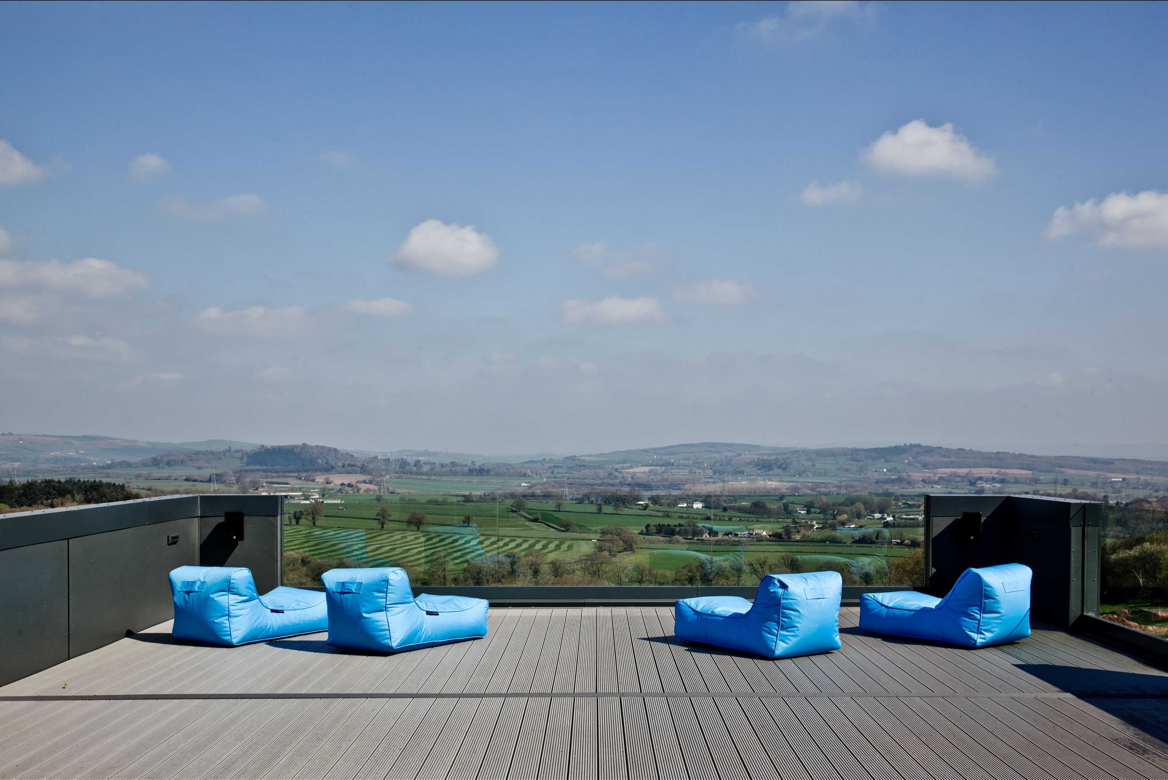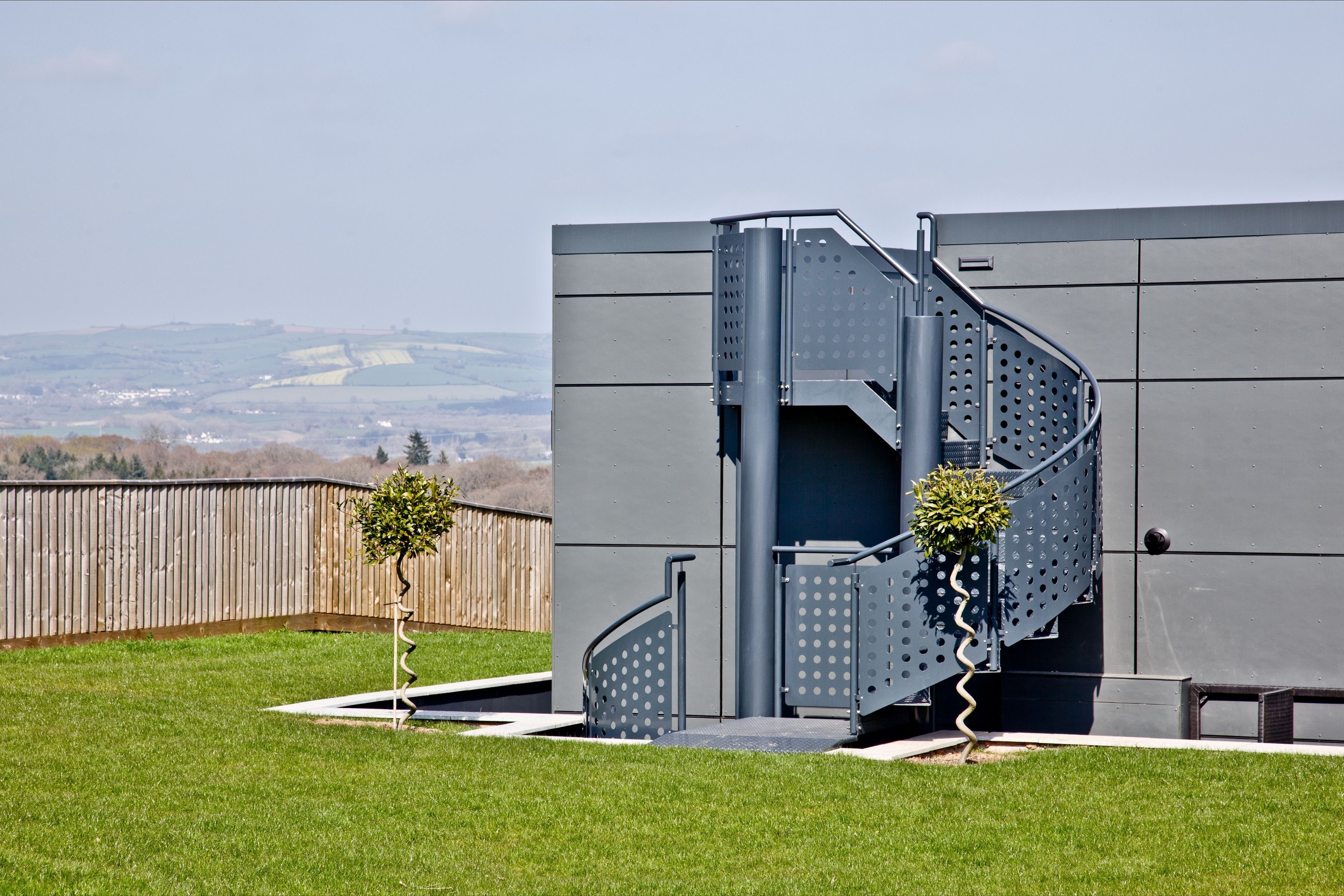 Roof terrace accessed by a spiral external staircase with an outdoor music system, table, chairs and outdoor sofas