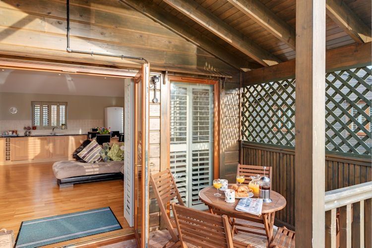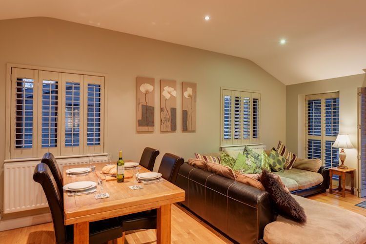 Living areaOpen plan with the kitchen and dining area with access to the balcony. Large corner sofa seating four, 52” Flatscreen TV with Freeview and DVD player and a log burning stove.