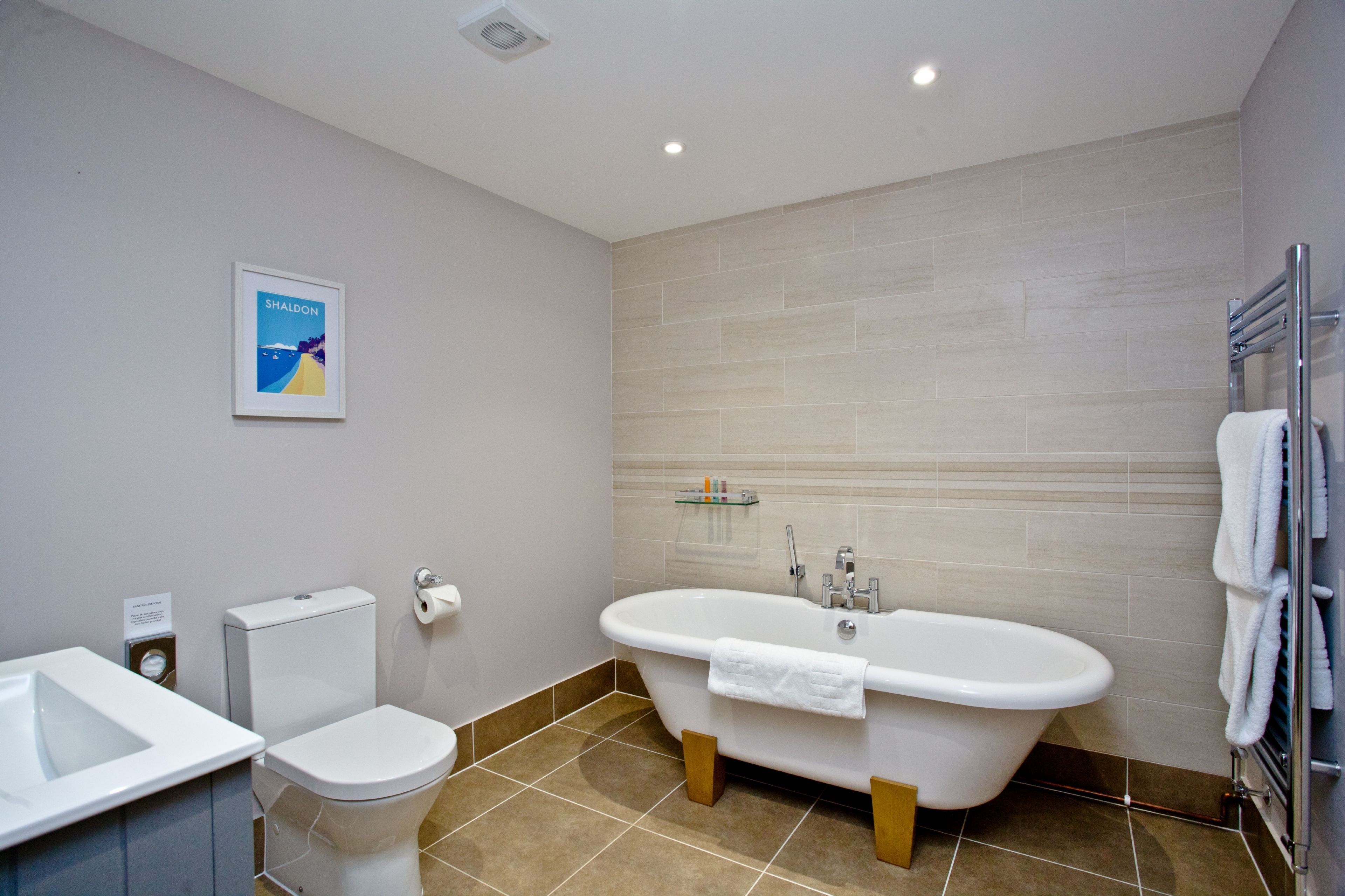 En suite to Master bedroom with free-standing roll top bath with overhead shower, wash basin and WC.Bedroom Two