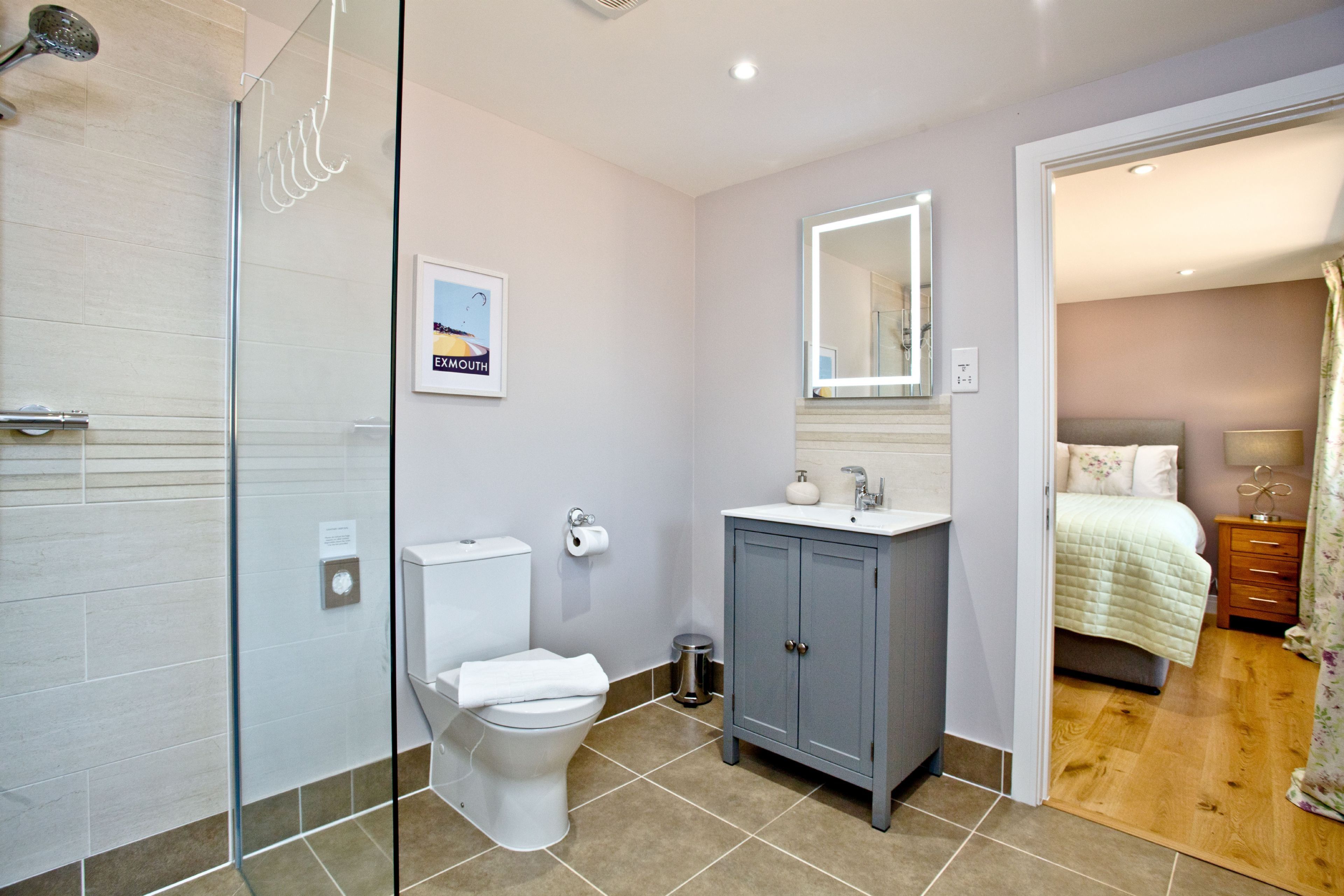 En suite to bedroom two with a walk-in shower cubicle, wash basin and WC.Outside