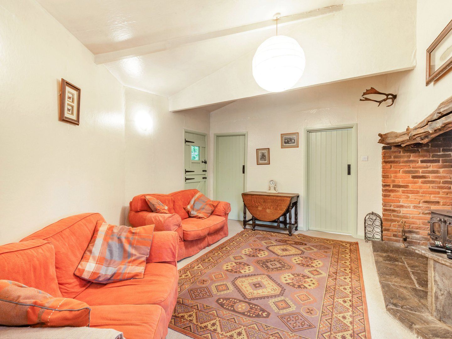 All ground floor. Two bedrooms: 1 x double, 1 x adult bunks. Bathroom with shower cubicle, basin & WC. Open plan living area with compact fitted kitchen, dining area & sitting area with woodburning stove in large inglenook fireplace. Covered veranda.