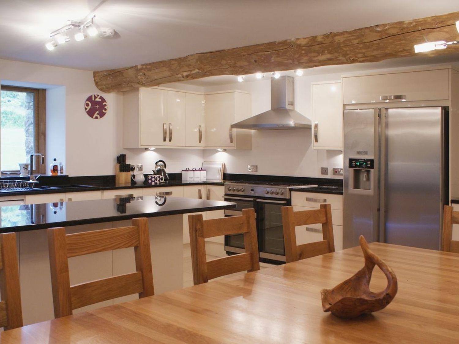 Gas central heating, underfloor heating. Electric oven, gas hob, microwave, fridge/freezer, washing machine, tumble dryer, dishwasher. TV with Blu-ray, DVD, 4 x TV with DVD, WiFi. Fuel, power and starter pack for woodburning stove inc. in rent. Bed linen and towels inc. in rent. Travel cot and highchair available on request. Off road parking for 6 cars. Private patio with furniture and barbecue. Shared garden with lawn, children's play area (swings, slides, climbing frame), indoor swimming pool, toddlers' splash pool, trampoline and games room. Three well-behaved dogs welcome (there is a charge of £20 per pet for the second and third pet). Sorry no smoking. Shop 1.7 miles, pub 1.4 miles. Note: The shared swimming pool is 39' x 19' x 3' to 4'6" deep, available from 8am to 8pm; occasionally the pool is also used by owners' family and friends