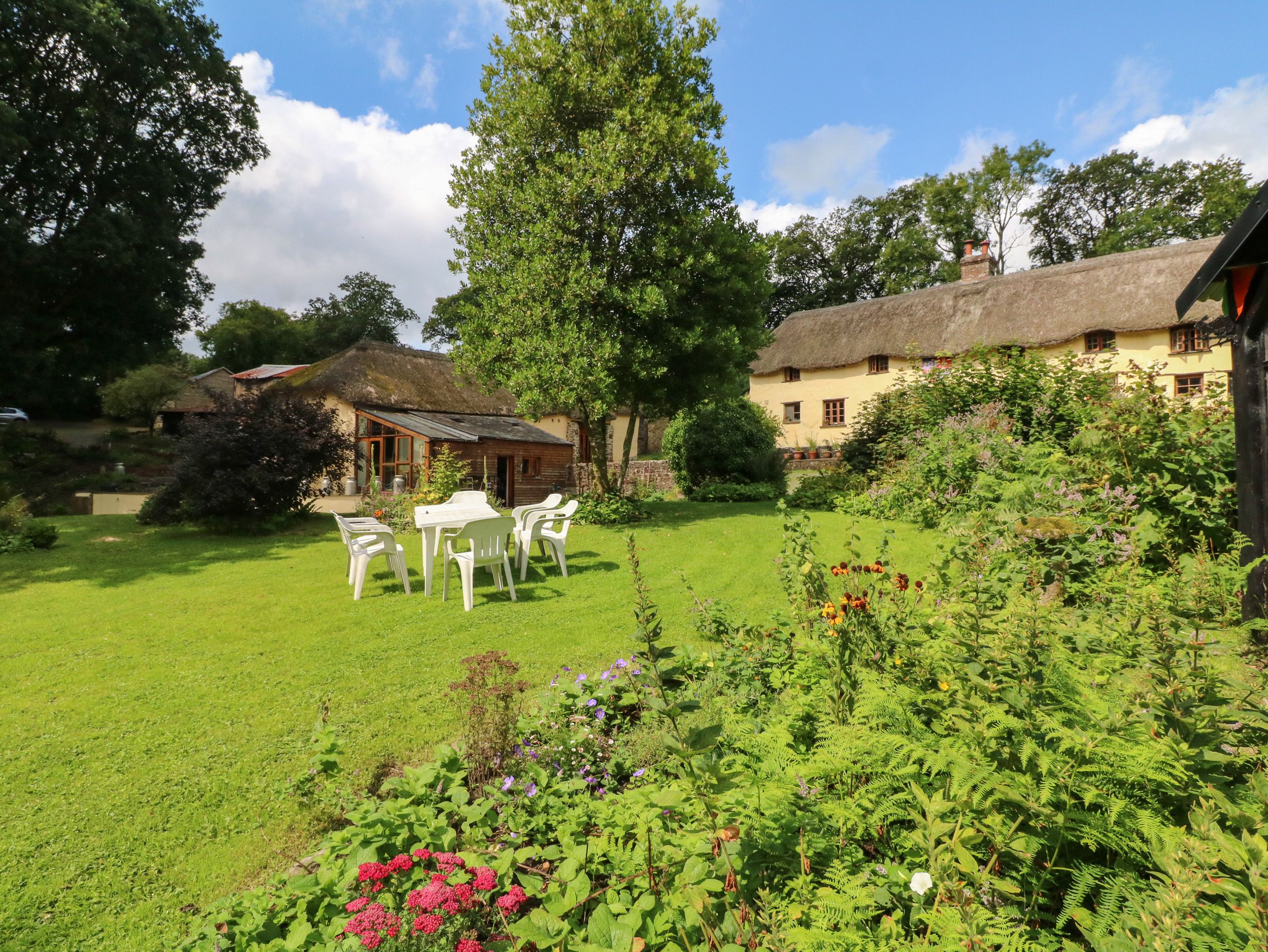 Holiday home The Milking Parlour is a Grade II Listed building, resting in High Hampton near the village of Sheepwash in Devon. There are two ground-floor bedrooms in the property, consisting of a king-size and a twin, both with Freeview TVs and DVD players. There is also a ground-floor wet room, kitchen housing an electric double oven and induction hob, microwave, fridge with freezer compartment, dishwasher, a utility with washing machine, a conservatory/breakfast area and a first-floor living/dining room with woodburning stove. Outside is off-road parking for four cars and a patio with furniture and a gas barbecue. WiFi, fuel, power, bed linen and towels are included in rent. This is a pet-free and non-smoking property. The Milking Parlour is the perfect, historic property for a family escape to the countryside of Devon. Note: This is a farm with livestock, lake, ponds and ditches. Note: There are 10 steps from the car park and up to the property. Only Saturday check-ins allowed at peak times. Note this property only take s 7 day stays from May - October