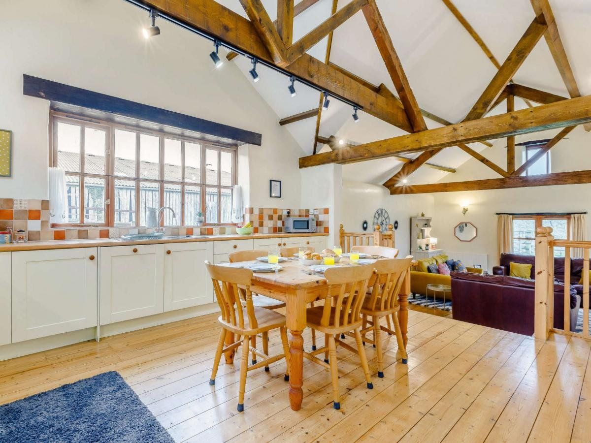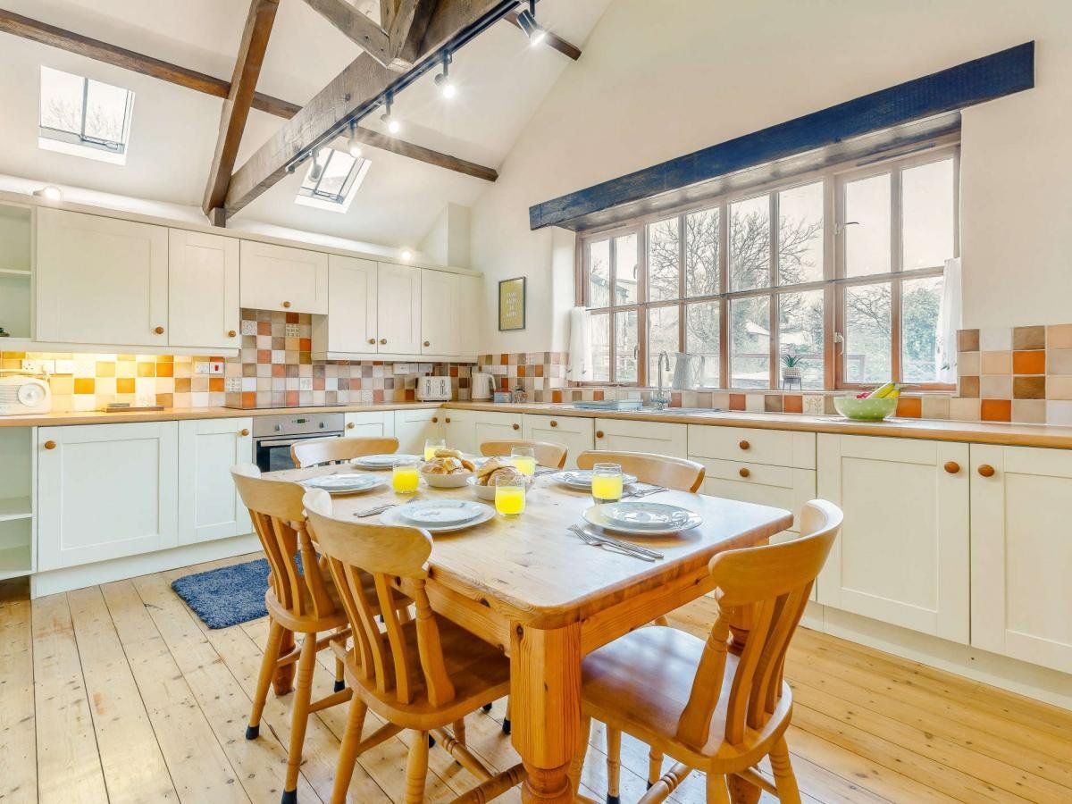 On the upper floor of the attractive split-level living area is a great family-size kitchen, with farmhouse-style furniture and overhead exposed beams.