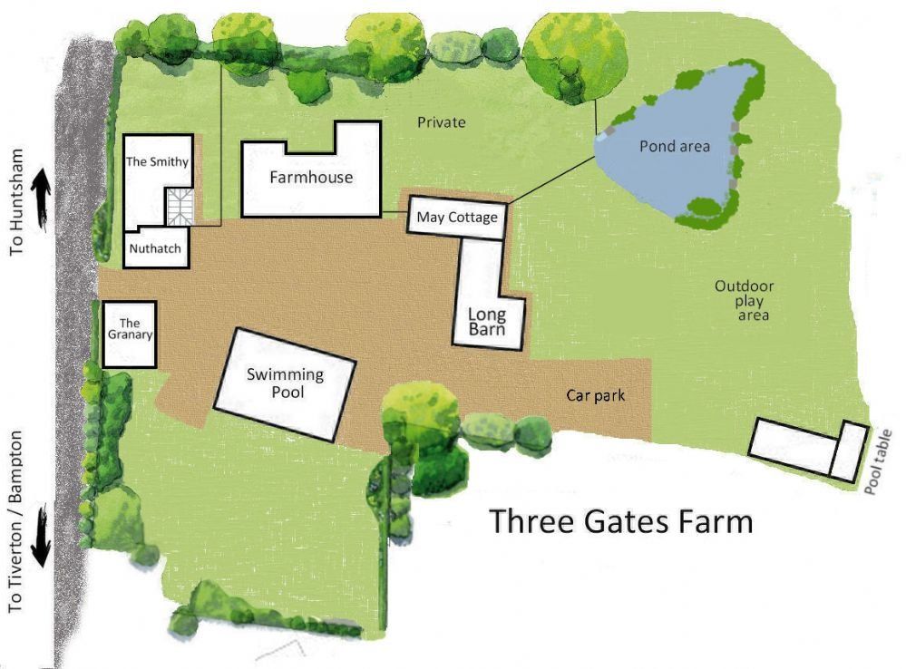 Location Three Gates Farm is situated in the picturesque Mid-Devon countryside near Tiverton. We are just a 15-minute drive from the M5 (J27), providing an ideal starting point for exploring Devon and Somerset.